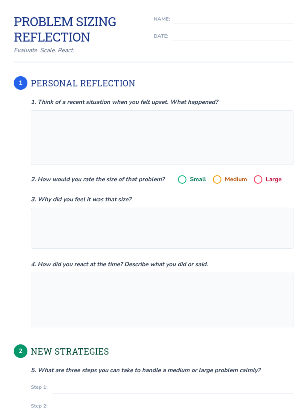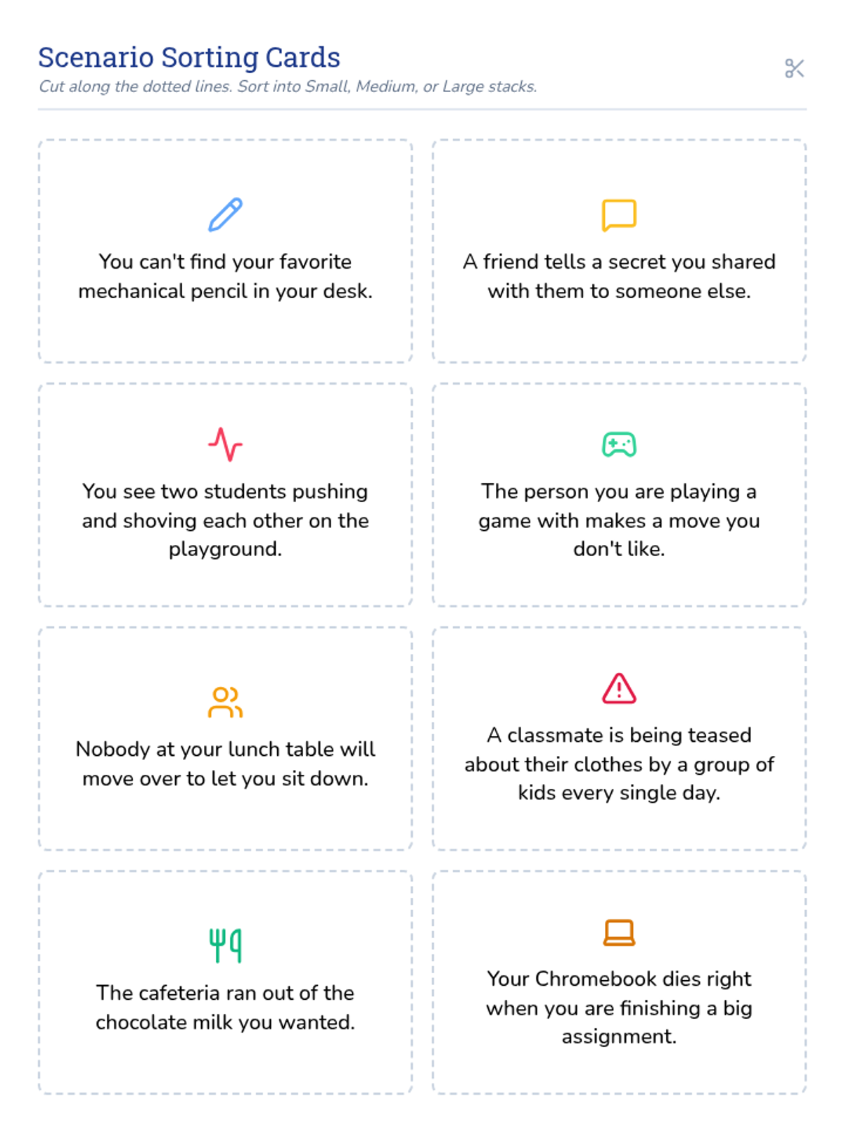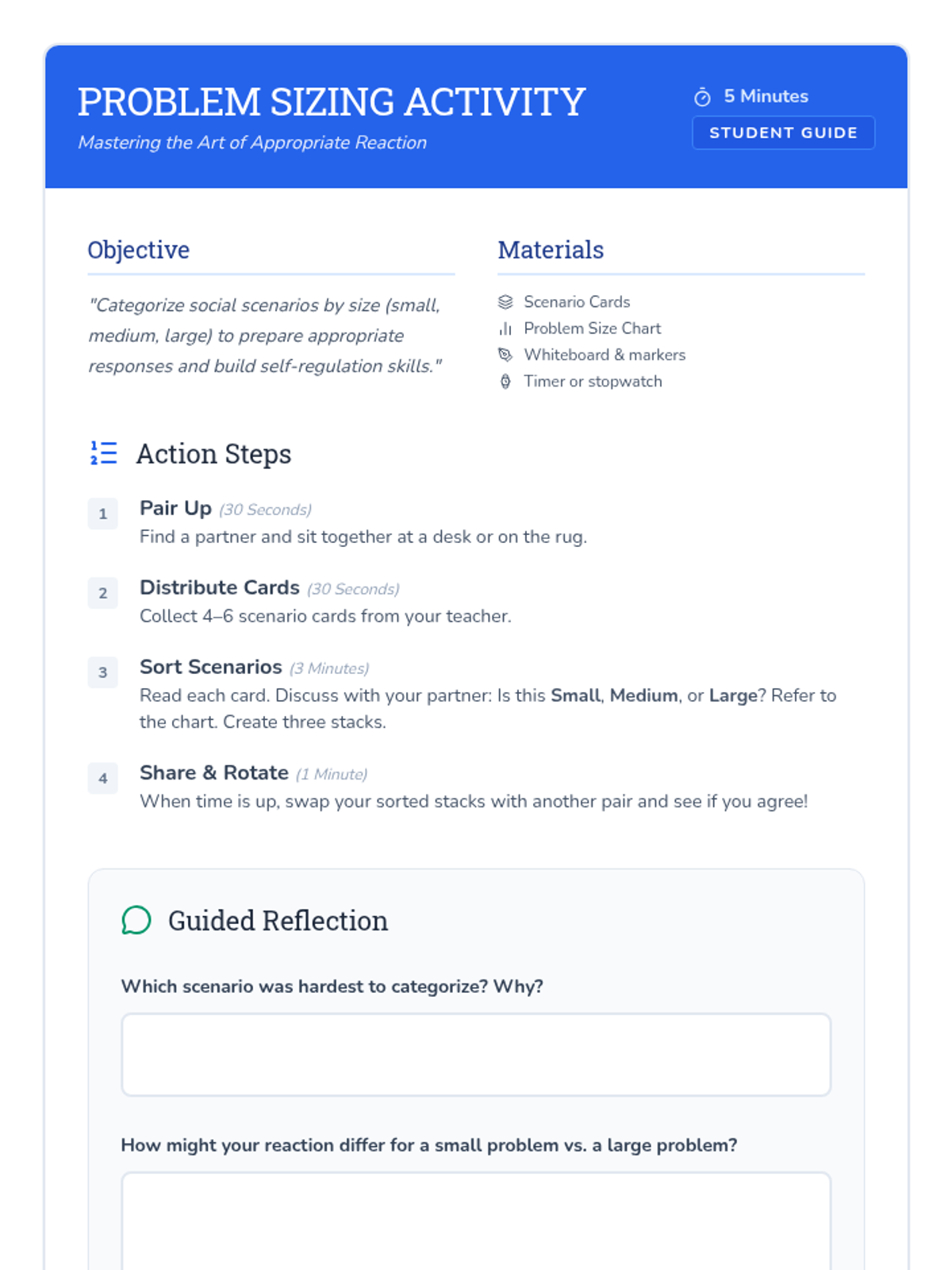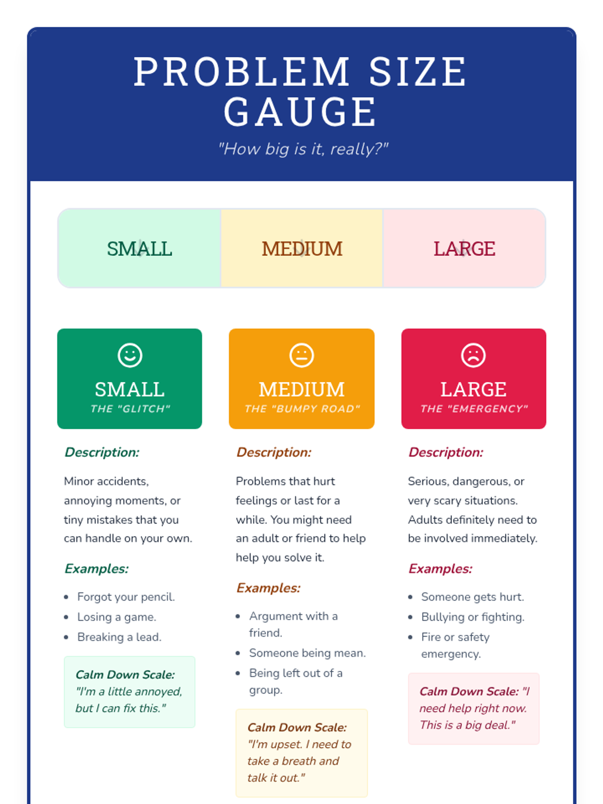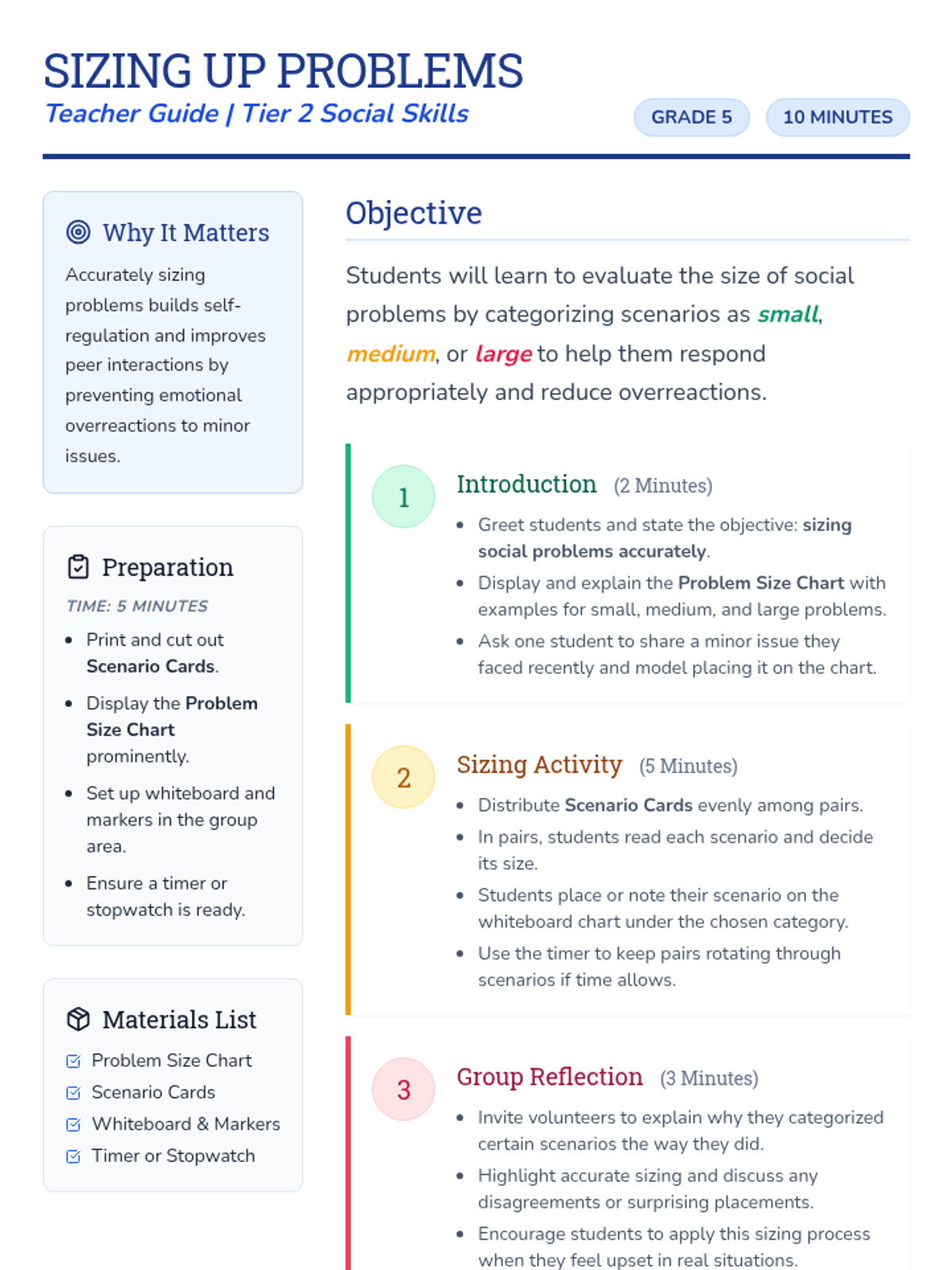 A 10-minute Tier 2 social skills lesson for 5th grade students to help them evaluate the size of social problems and respond appropriately. Students use a visual chart and scenario cards to distinguish between minor glitches and major emergencies.