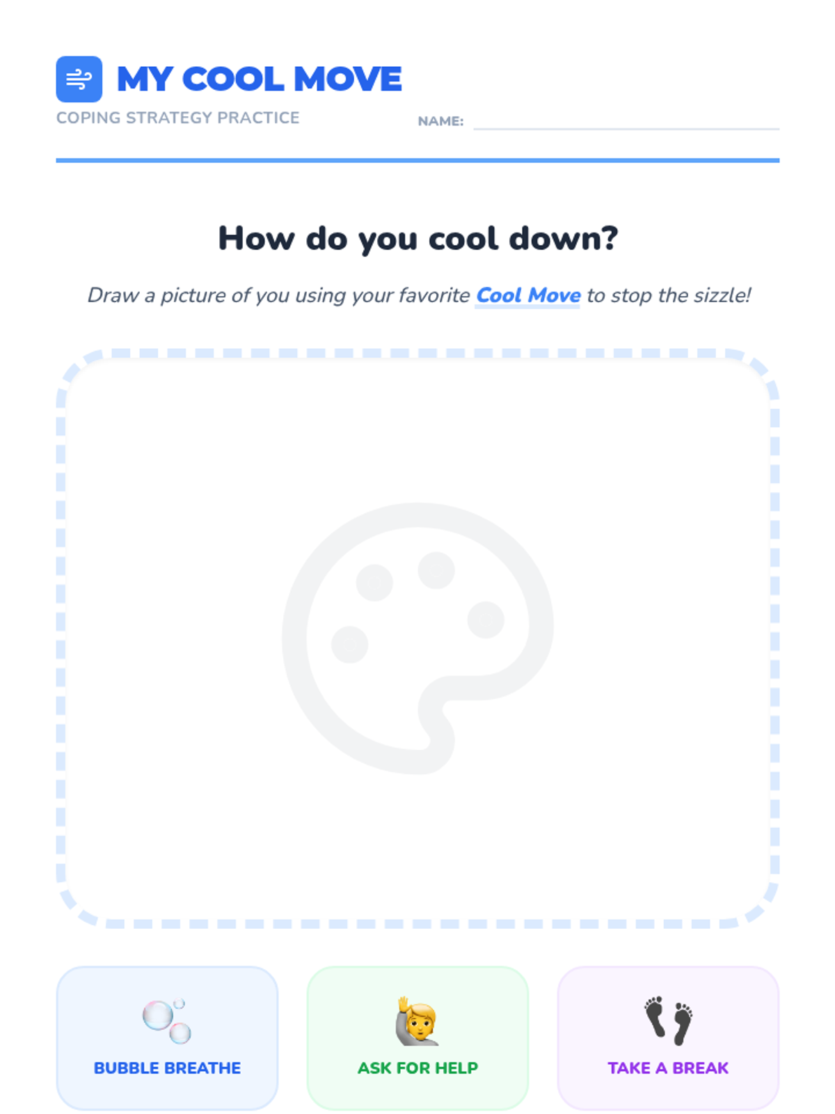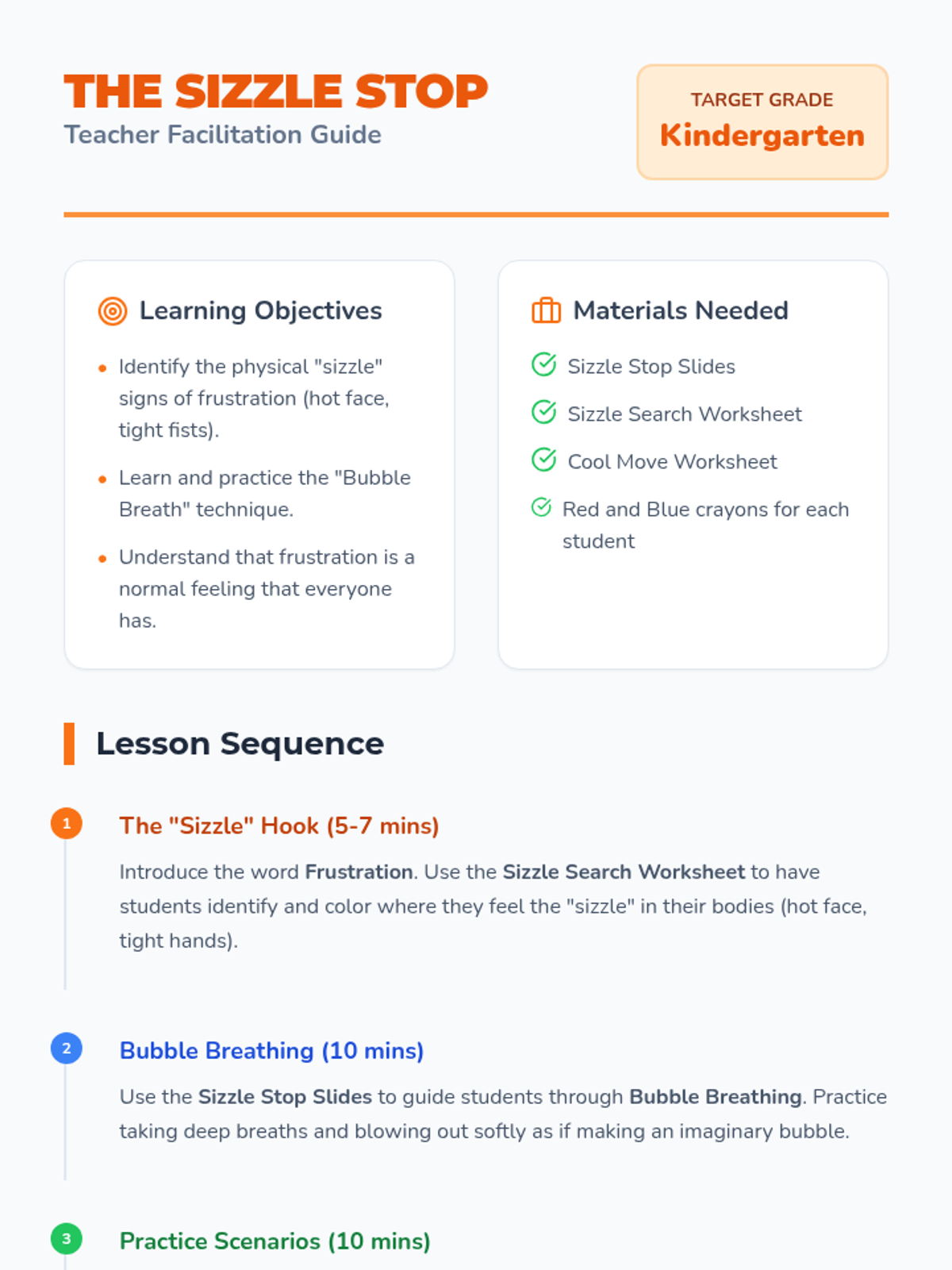 A social-emotional learning lesson for kindergarteners focused on identifying the physical signs of frustration and practicing simple 'cool down' strategies like deep breathing and taking a break.