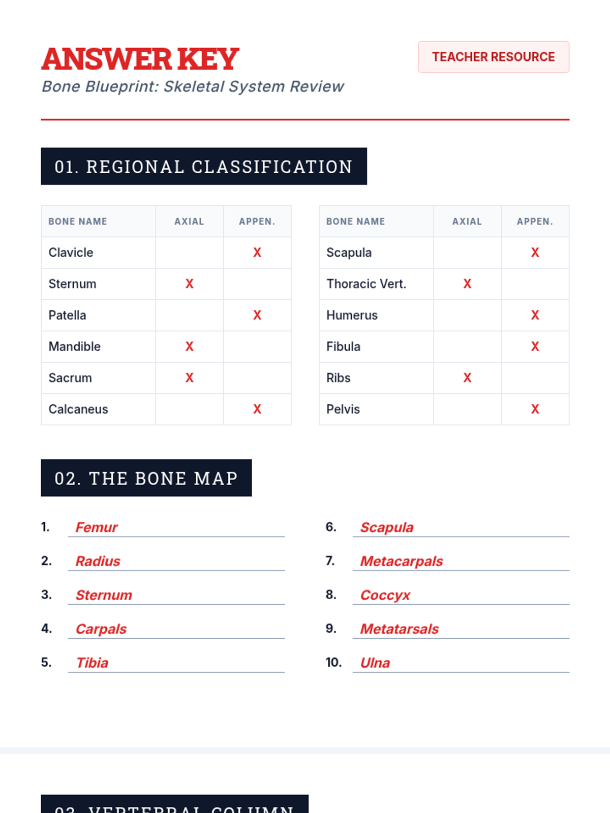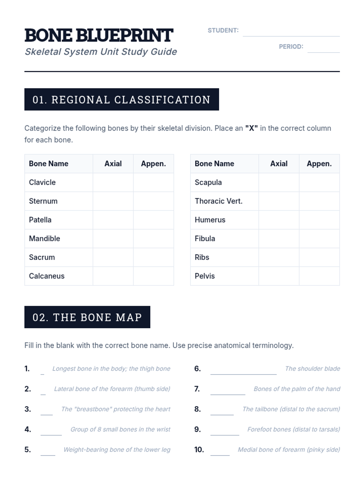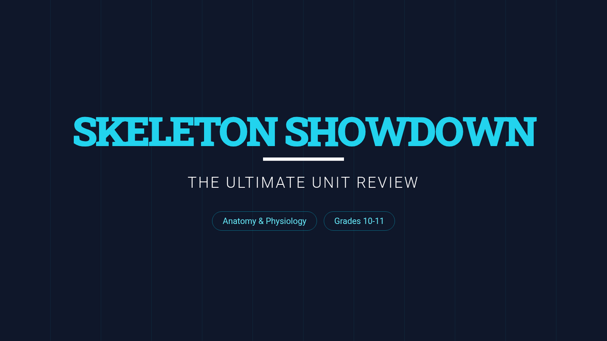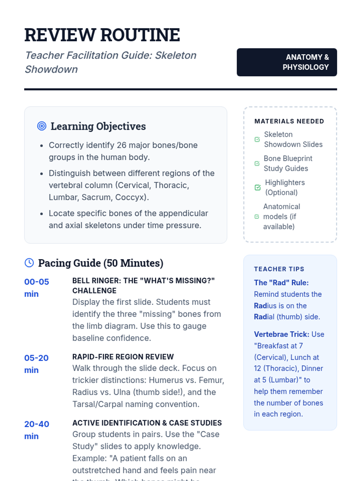 A high-energy 50-minute review session designed to prepare 10th and 11th-grade anatomy students for a comprehensive skeletal system test. The lesson covers all major bones from the skull to the phalanges through rapid-fire visual identification and clinical application scenarios.