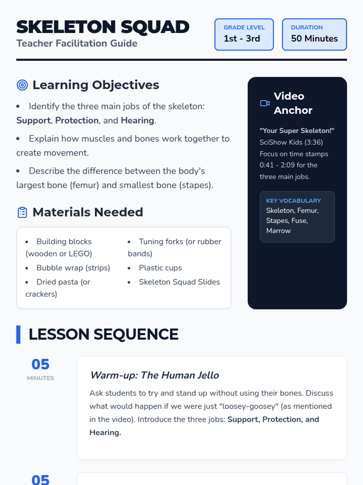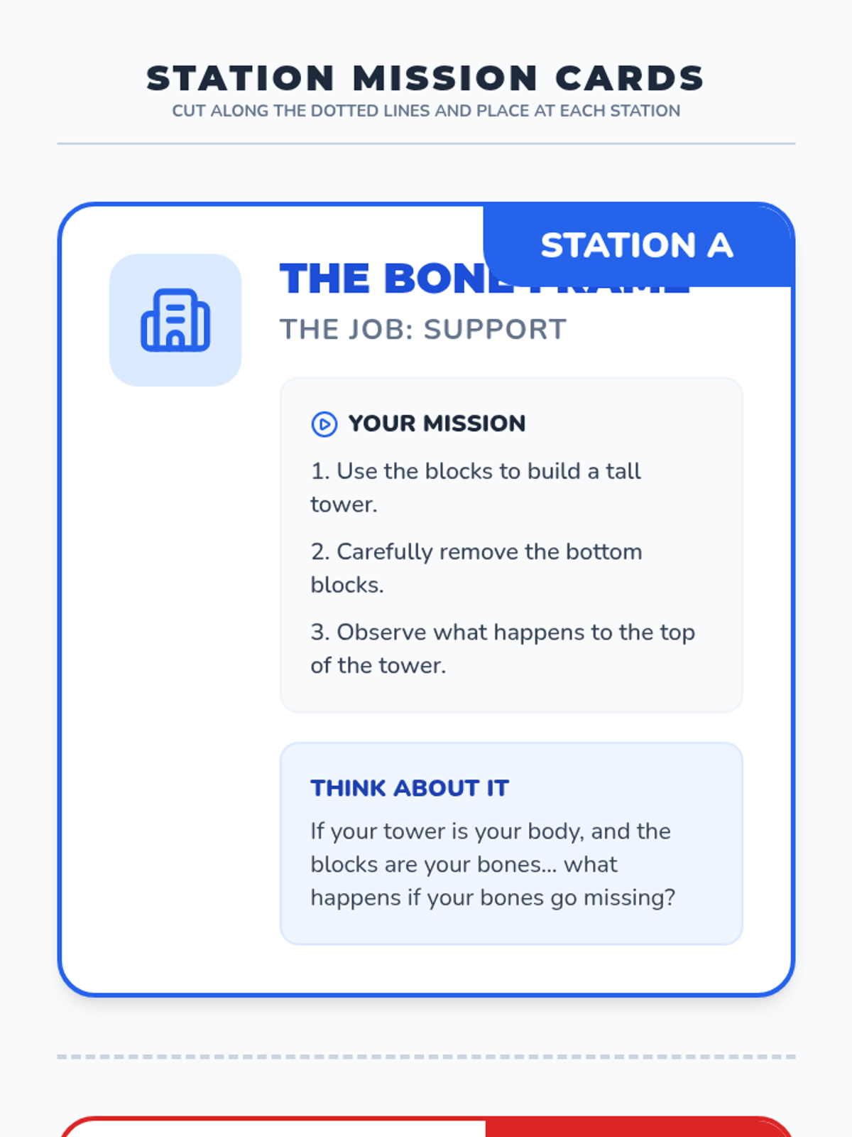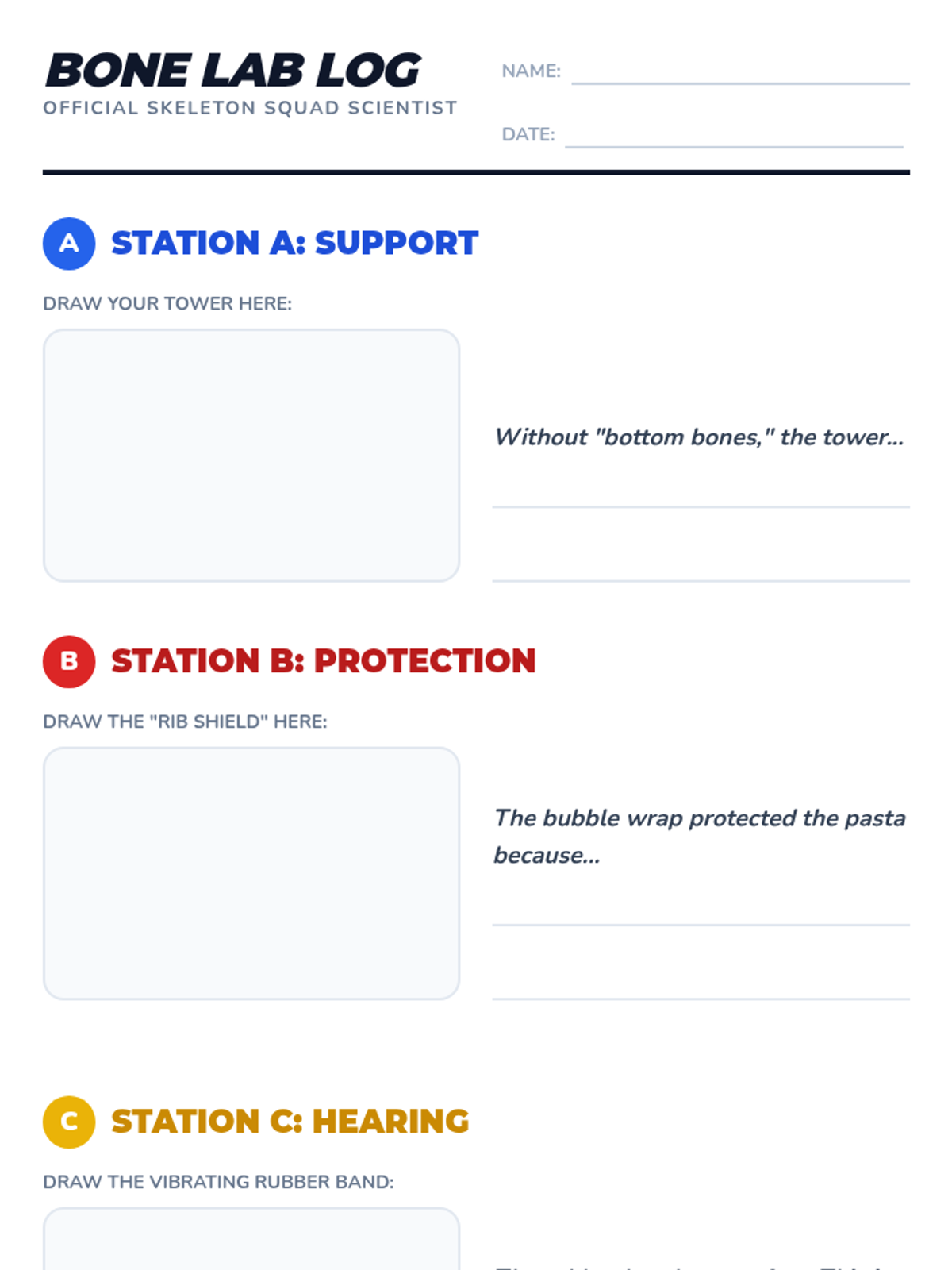 A hands-on, station-based exploration of the human skeleton's primary functions: support, protection, and hearing. Students rotate through interactive experiments that simulate how bones act as a frame, a shield, and a vibration transmitter.