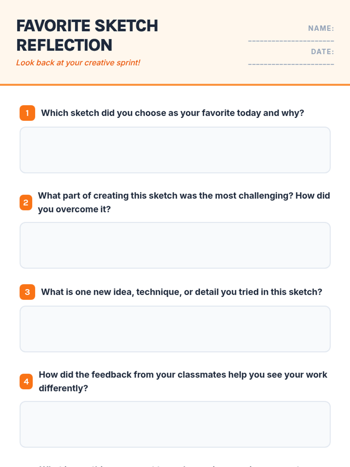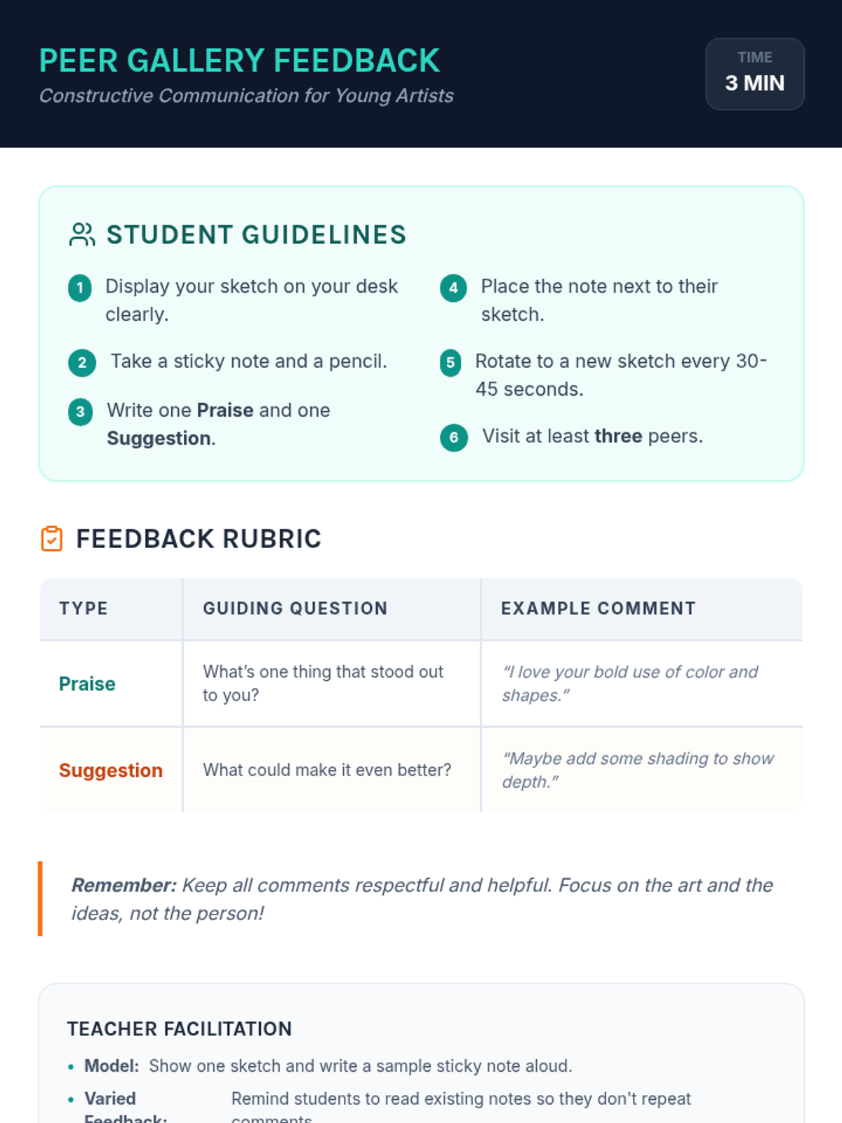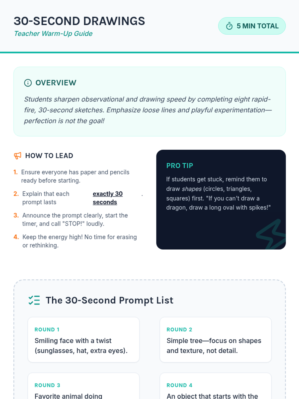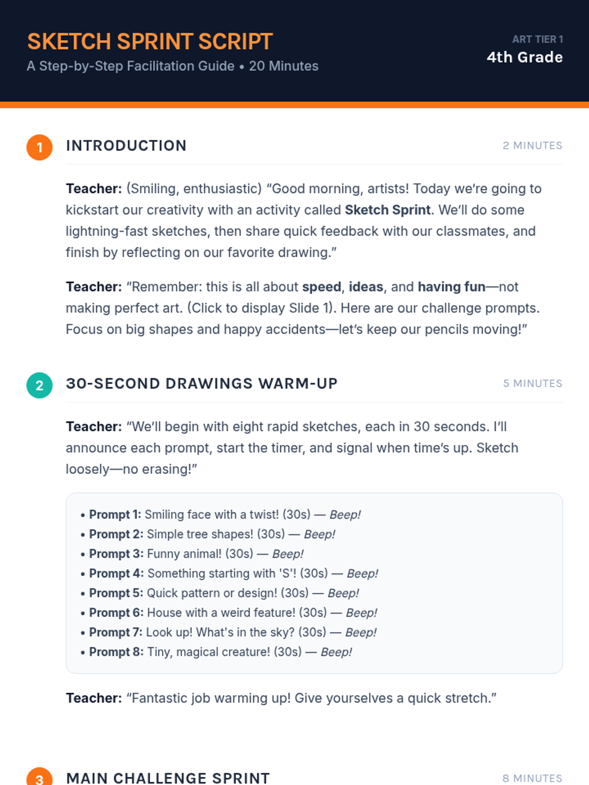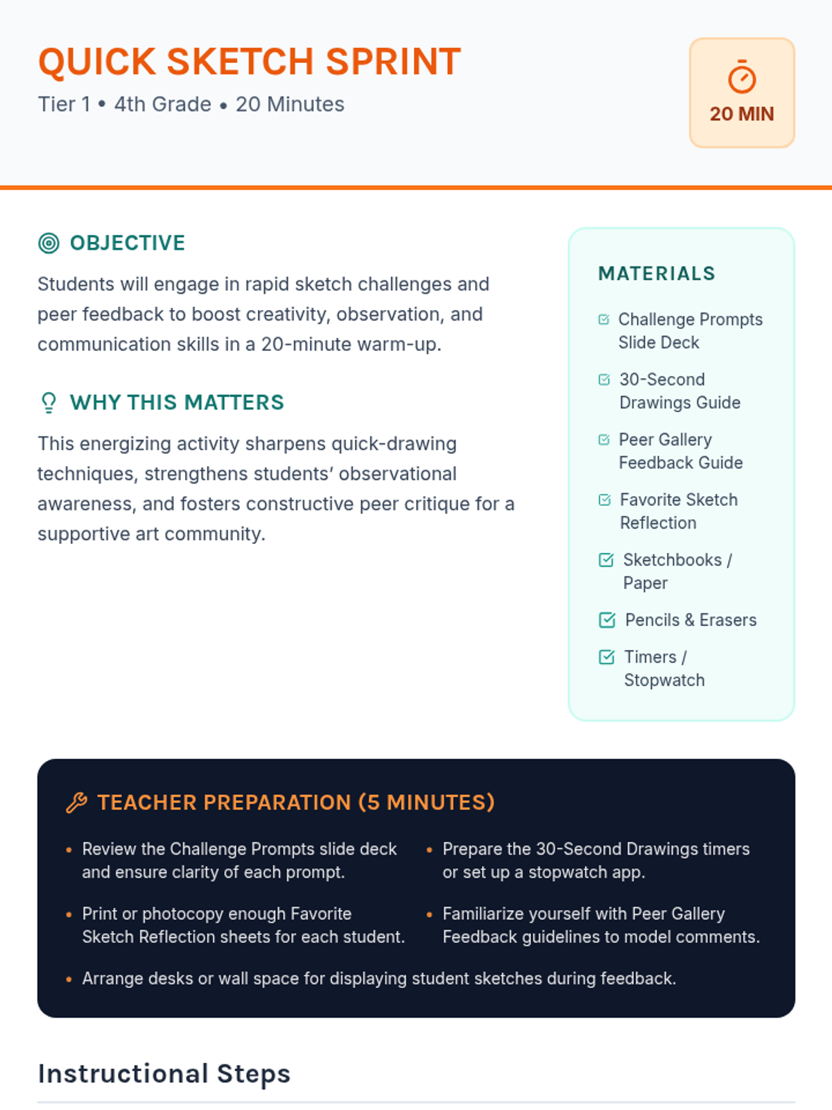A high-energy 20-minute art warm-up lesson for 4th graders that focuses on rapid ideation, creative drawing challenges, and constructive peer feedback.