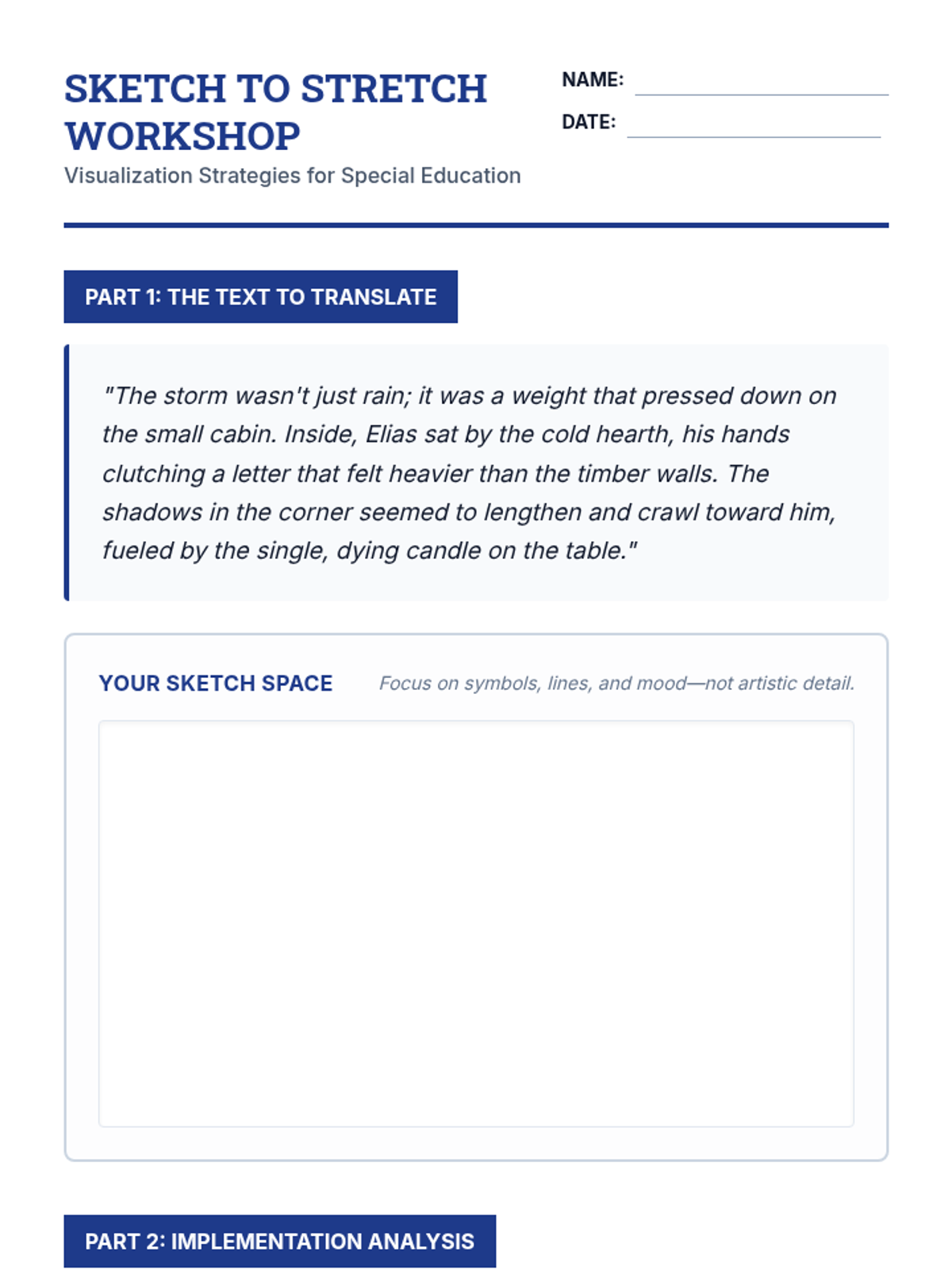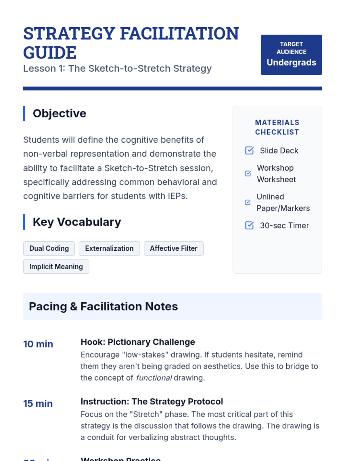 Students learn the Sketch-to-Stretch strategy, practicing how to translate text into quick non-artistic drawings and discussing implementation hurdles.