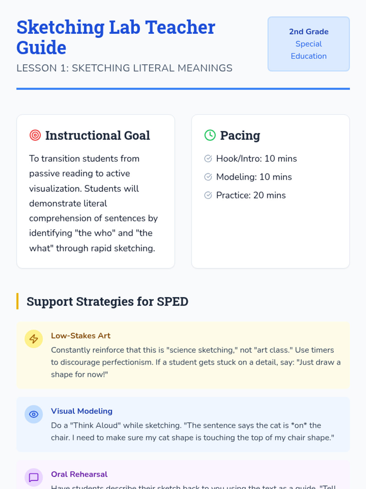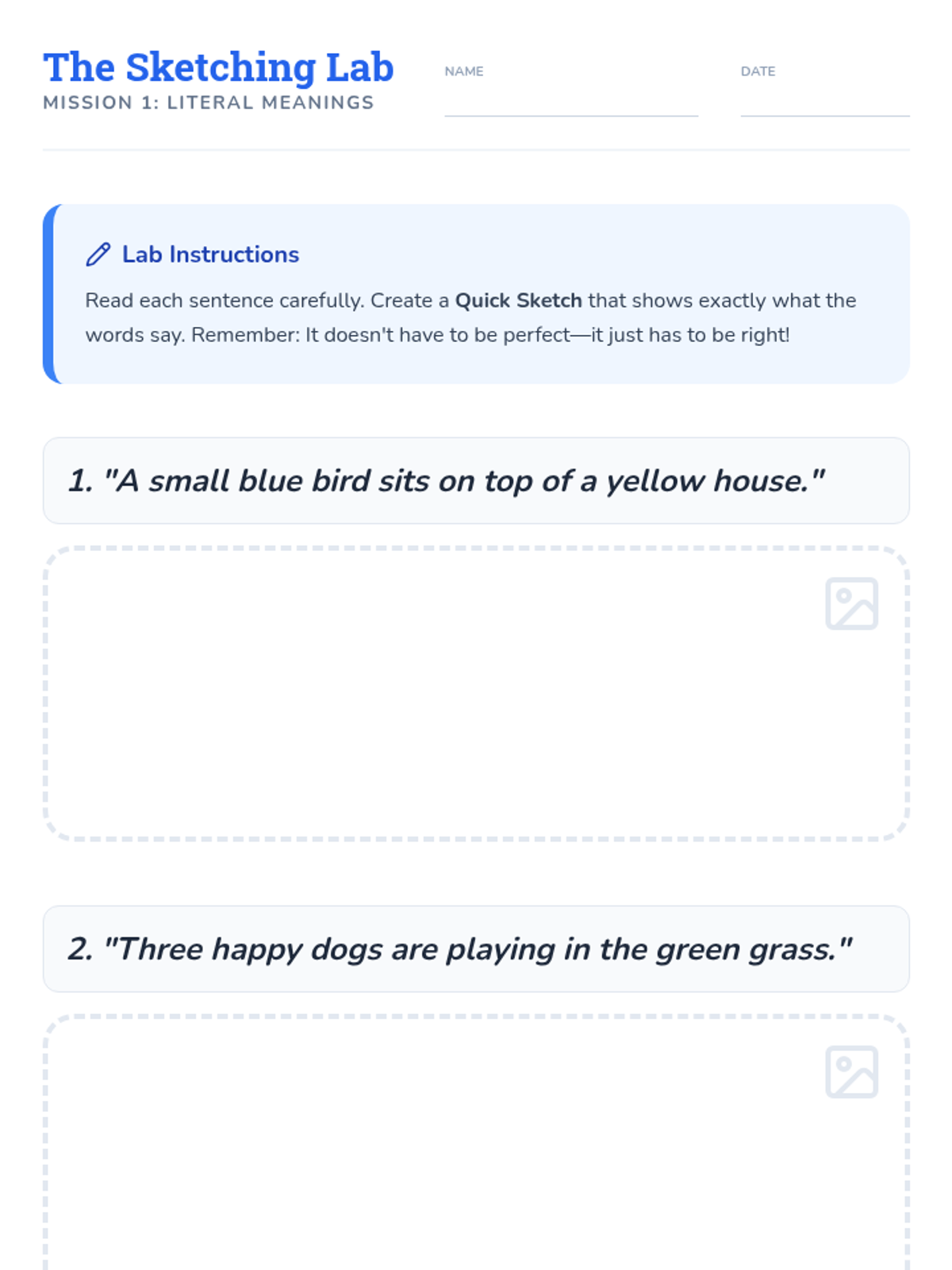 Students practice 'quick sketching' to capture the main idea of single sentences, focusing on speed and accuracy of content rather than artistic quality.