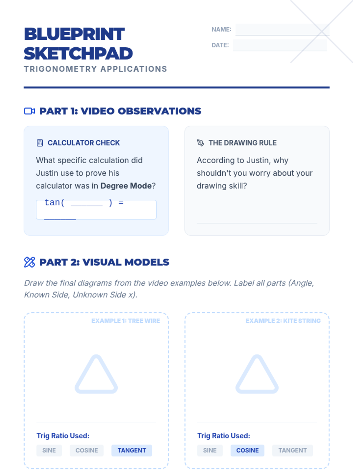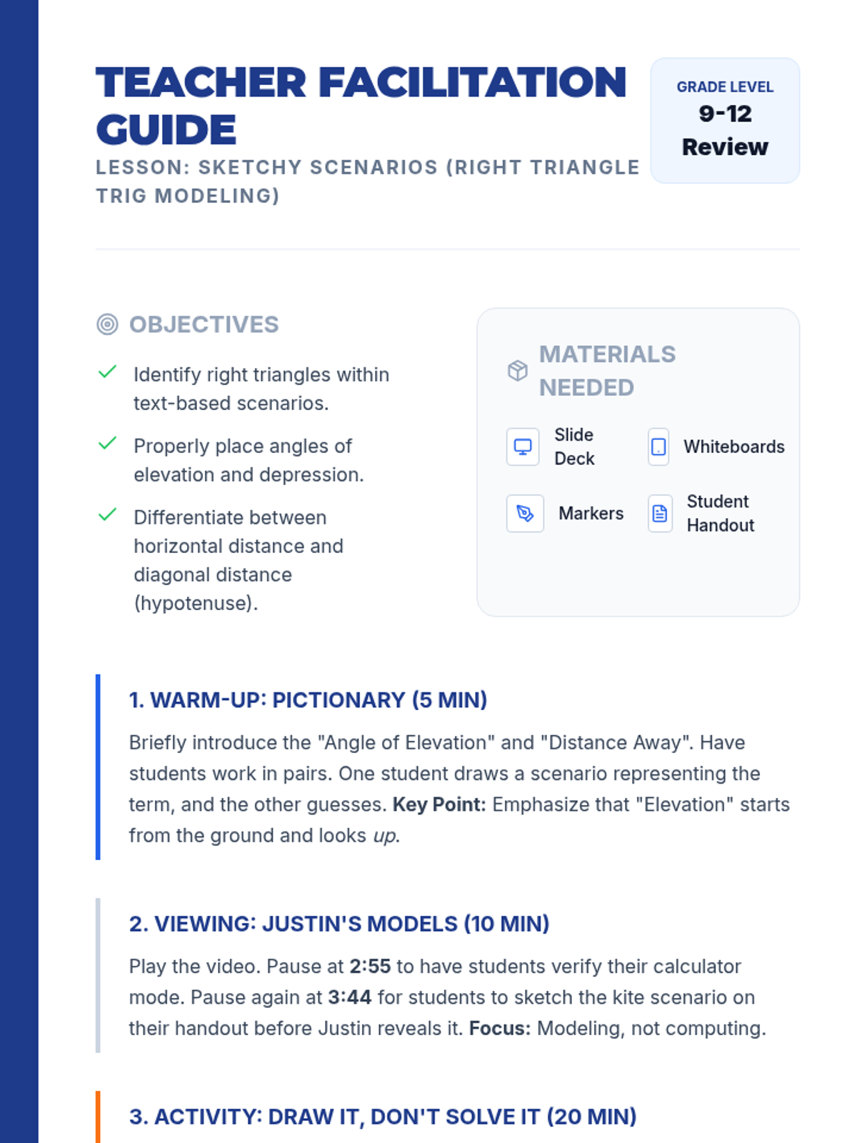 A high school remediation lesson focused on translating real-world trigonometry word problems into accurate right-triangle models without the pressure of calculation. Students engage in a fast-paced 'Draw It, Don't Solve It' activity to master the critical first step of trig applications.