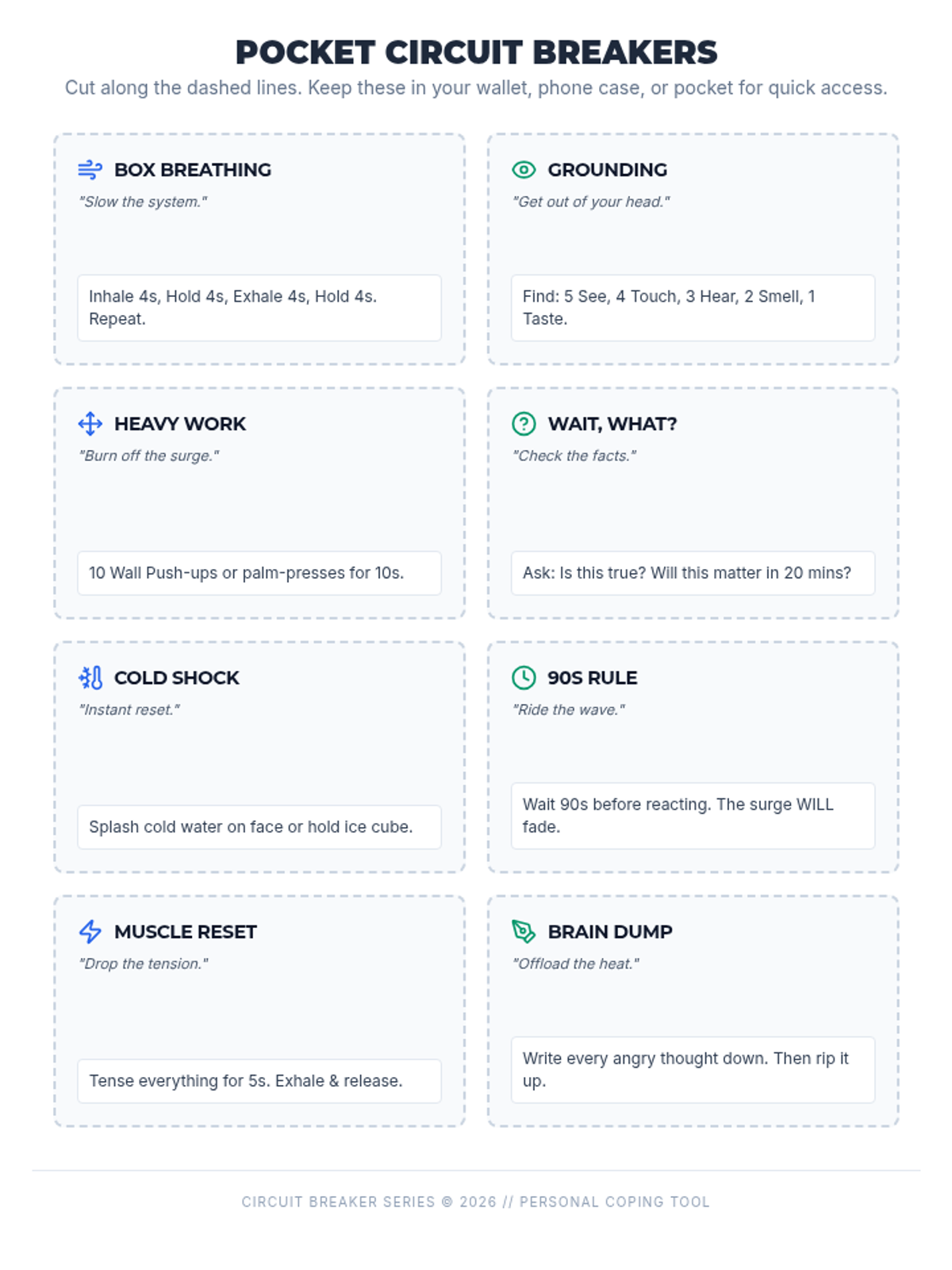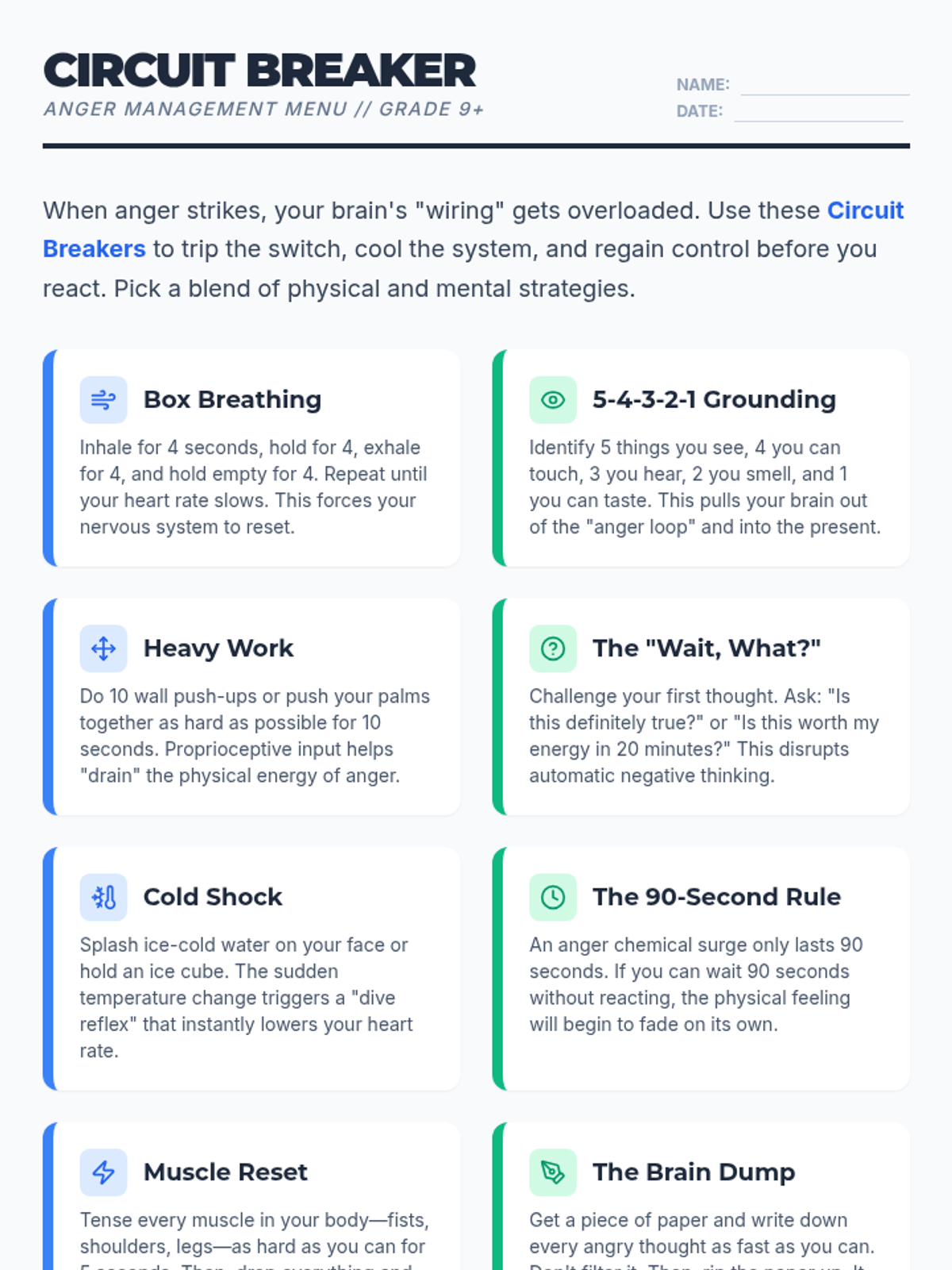 A set of resources designed for 9th graders to manage anger through a 'Circuit Breaker' framework, featuring a blend of physical and mental coping strategies.