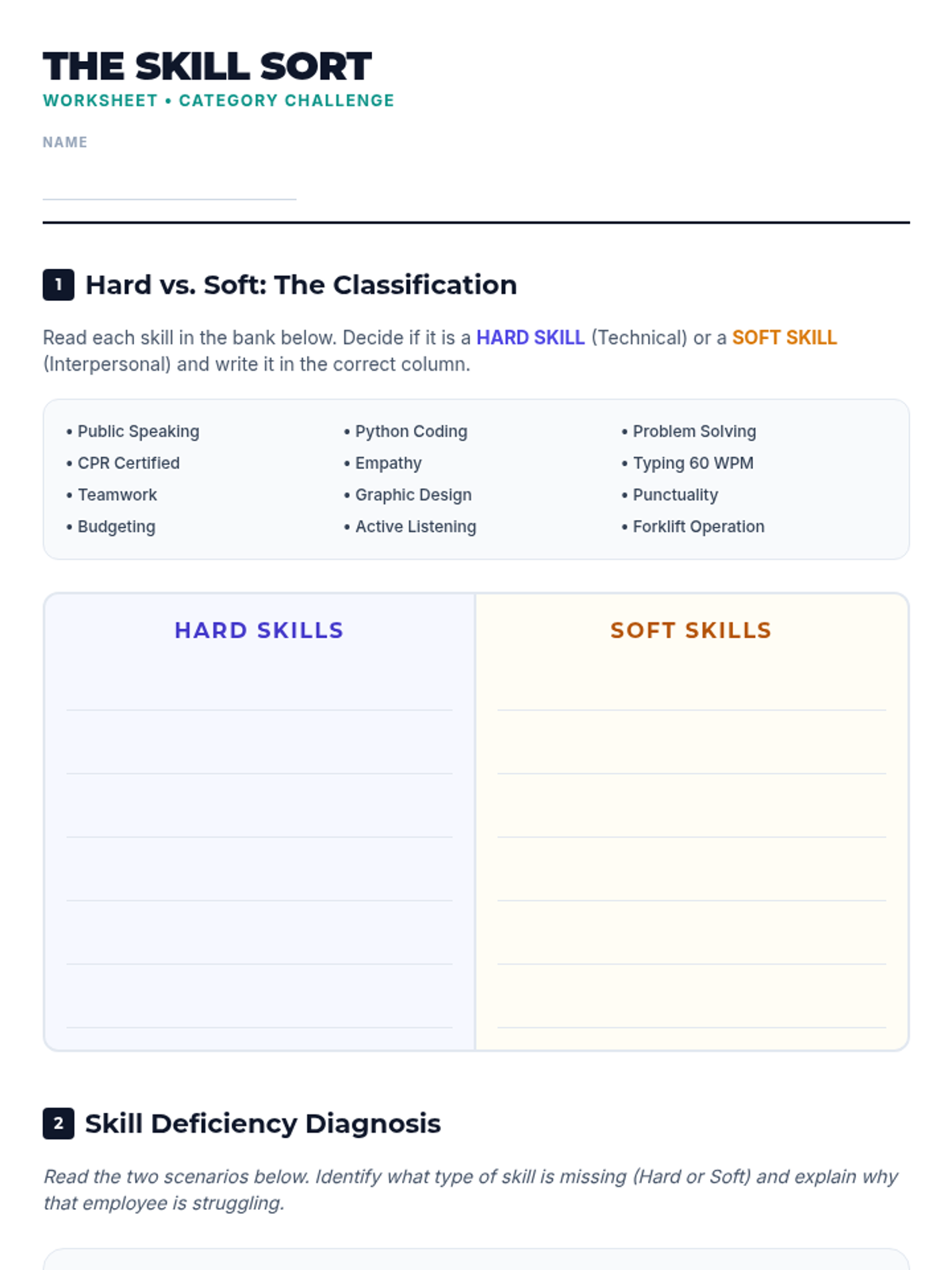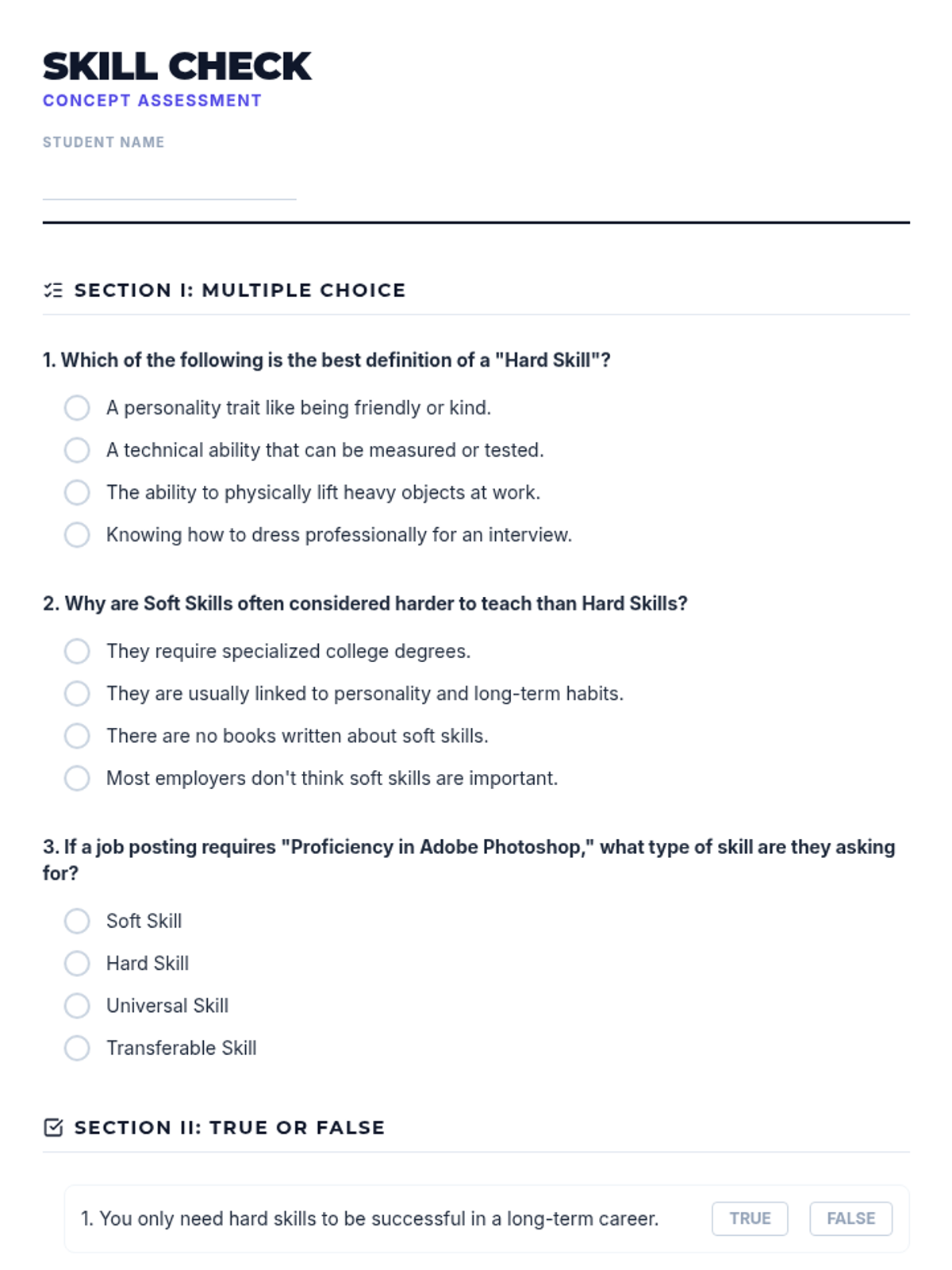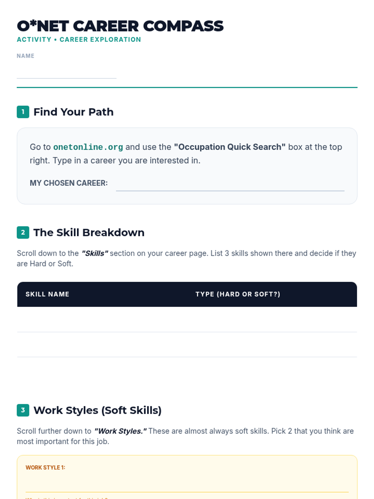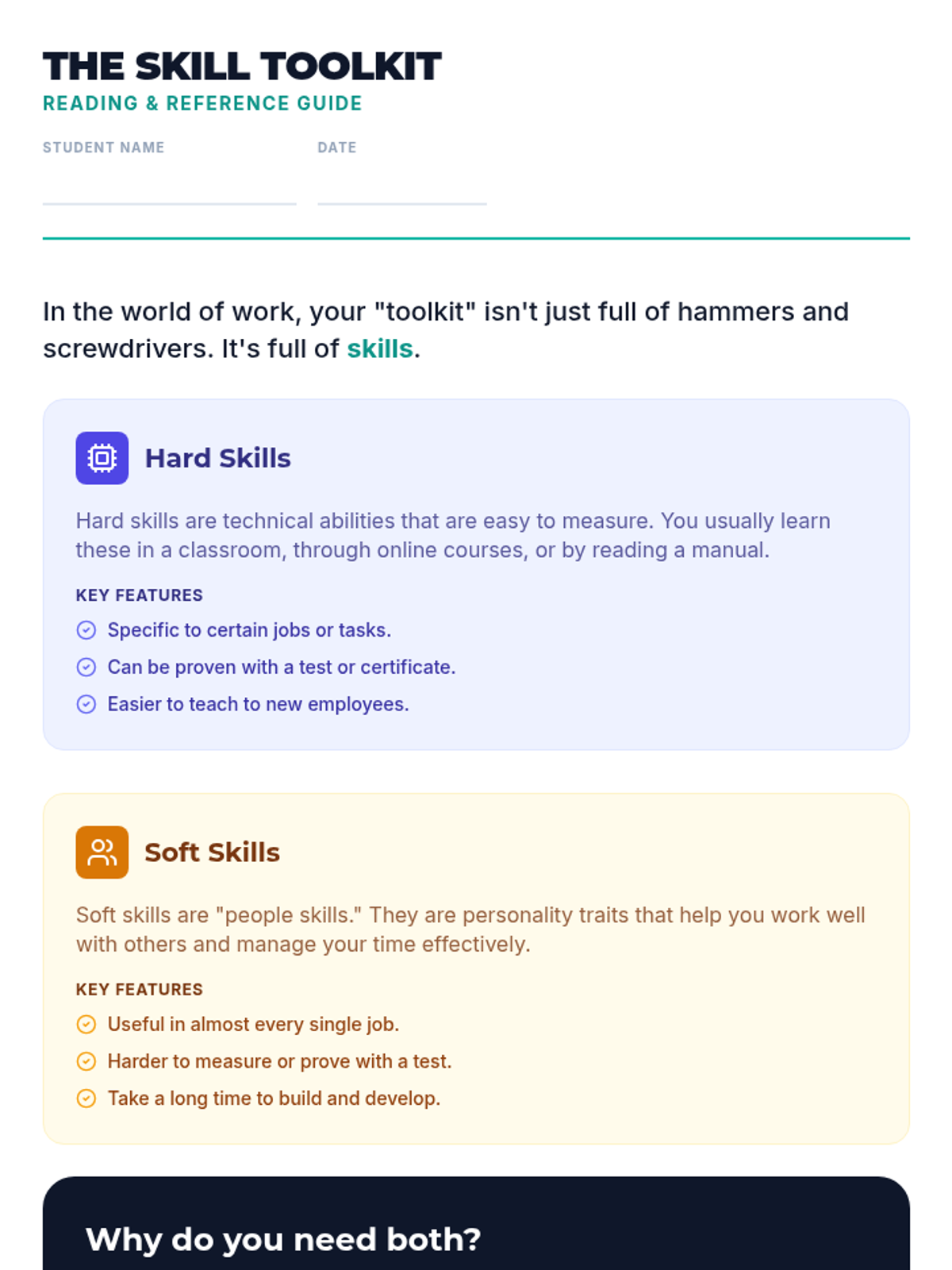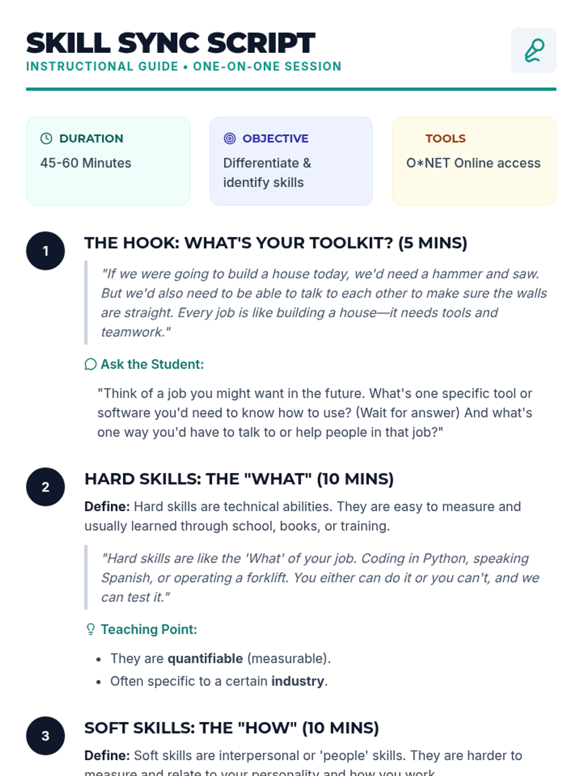 A comprehensive one-on-one lesson exploring the differences between hard and soft skills, their importance in the workplace, and how to use O*NET to align personal skills with career paths.