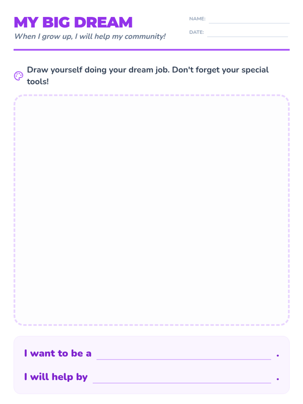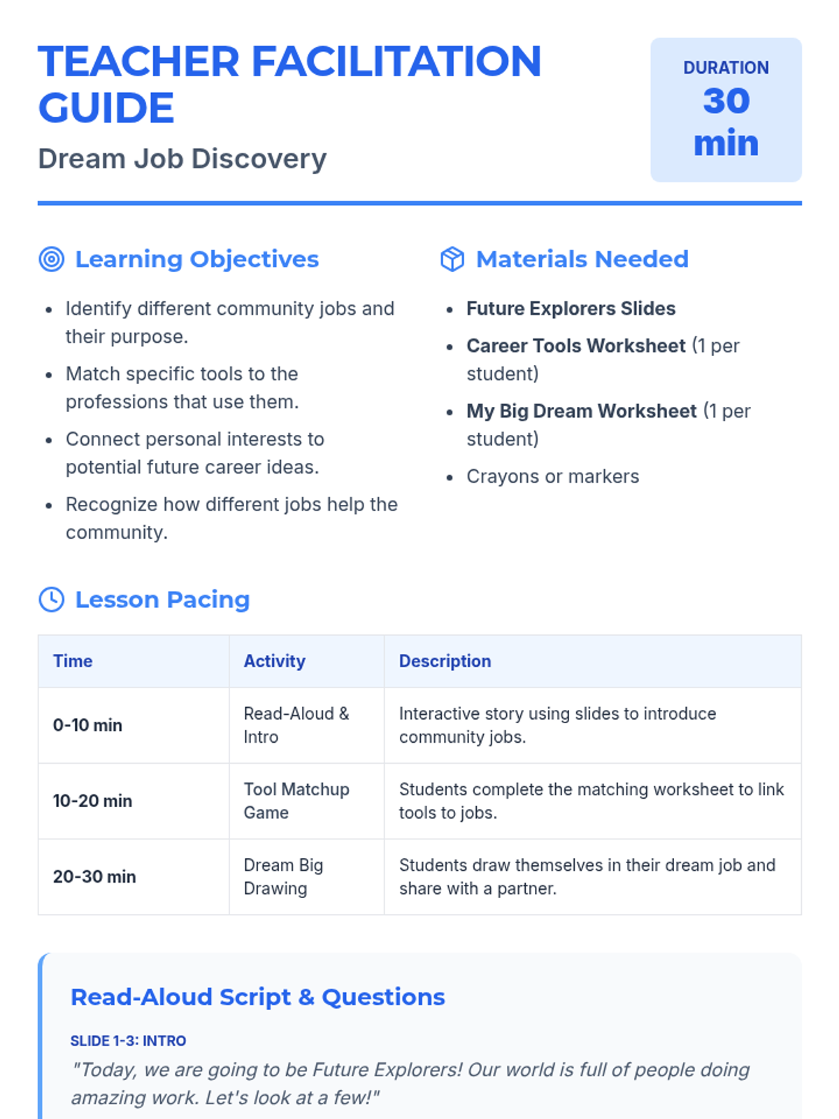 A 30-minute career exploration lesson for 1st graders focusing on identifying jobs, tools, and connecting interests to future work. Students will participate in a guided read-aloud, match tools to professions, and draw their future career.