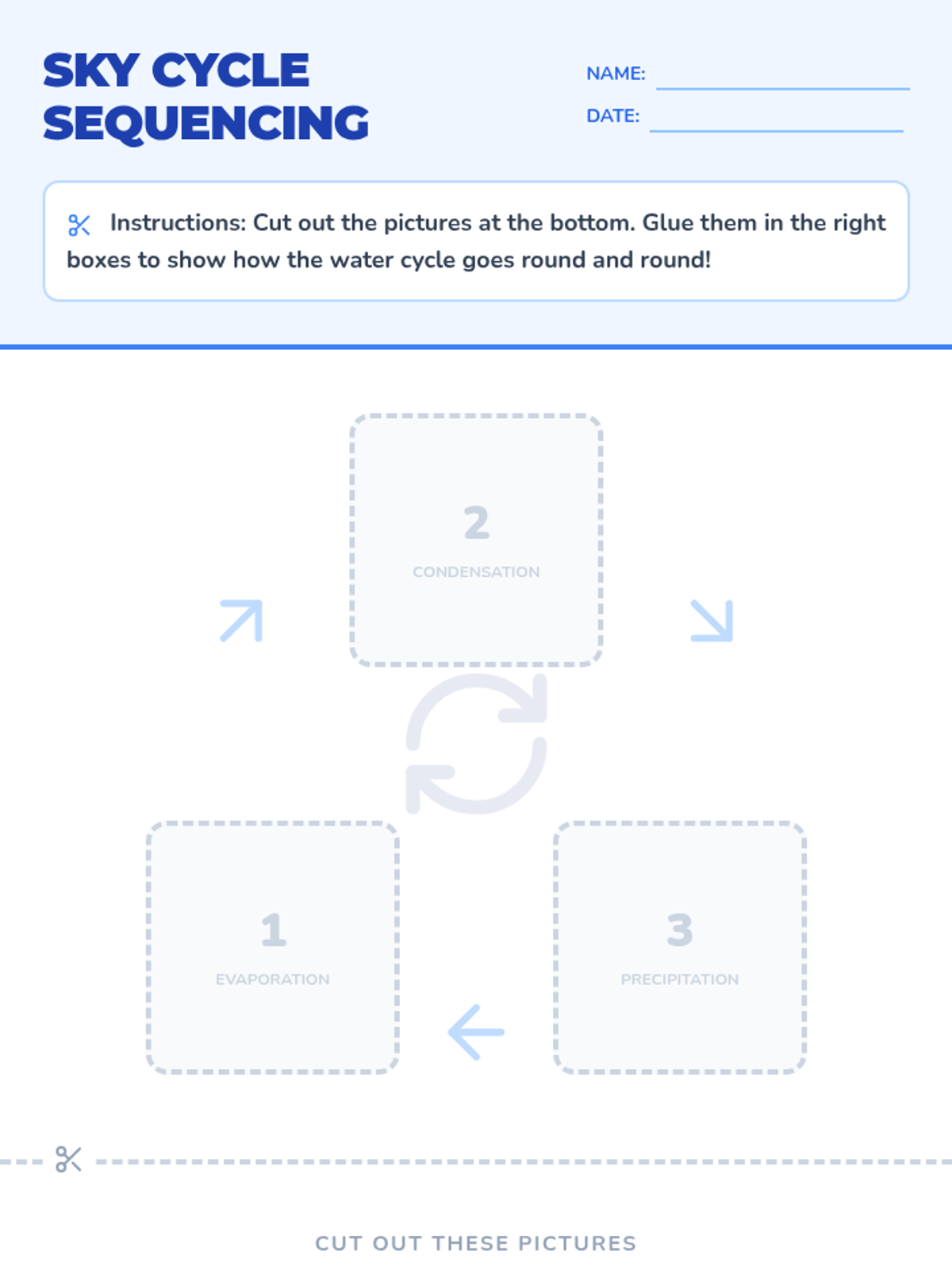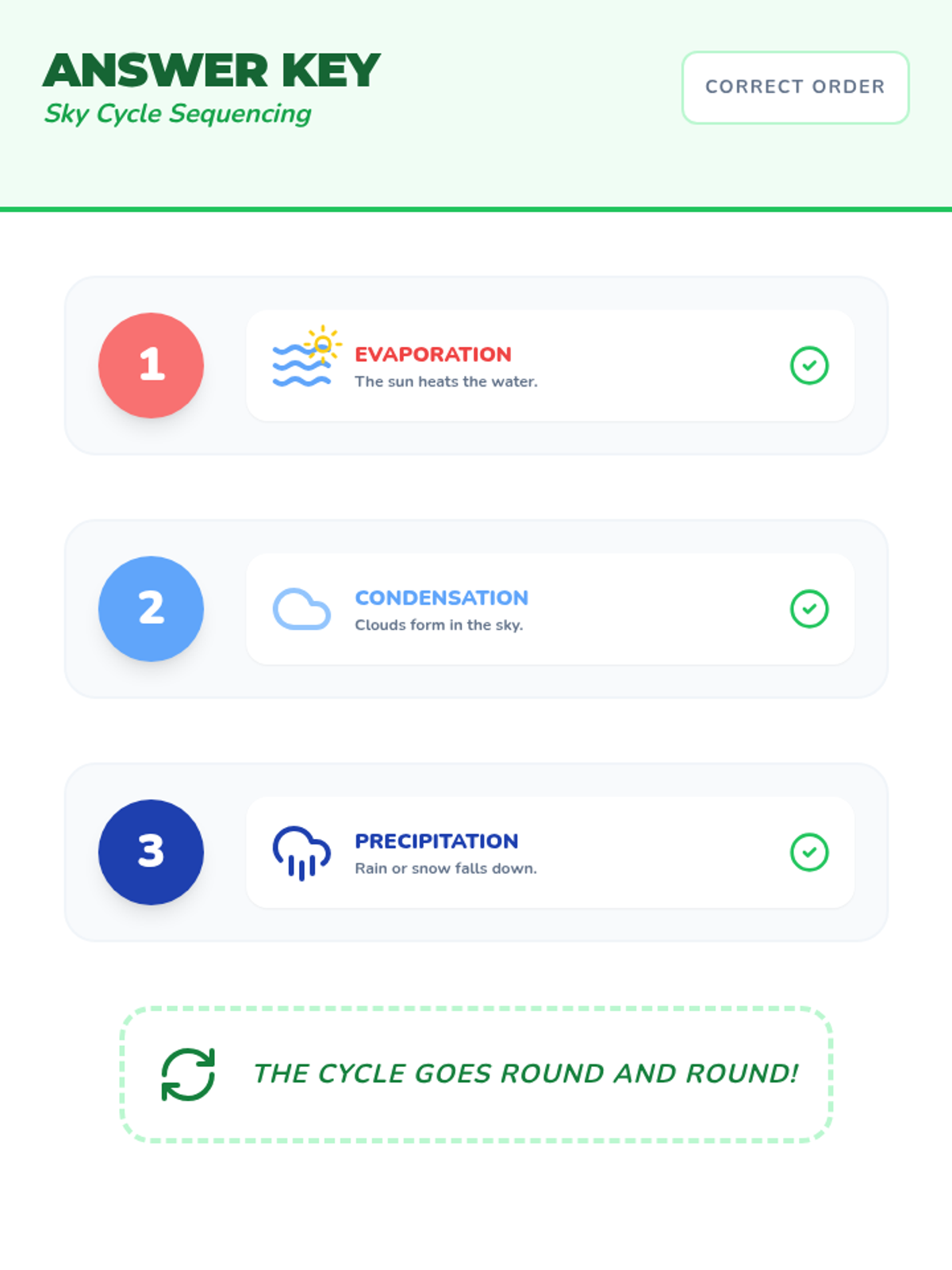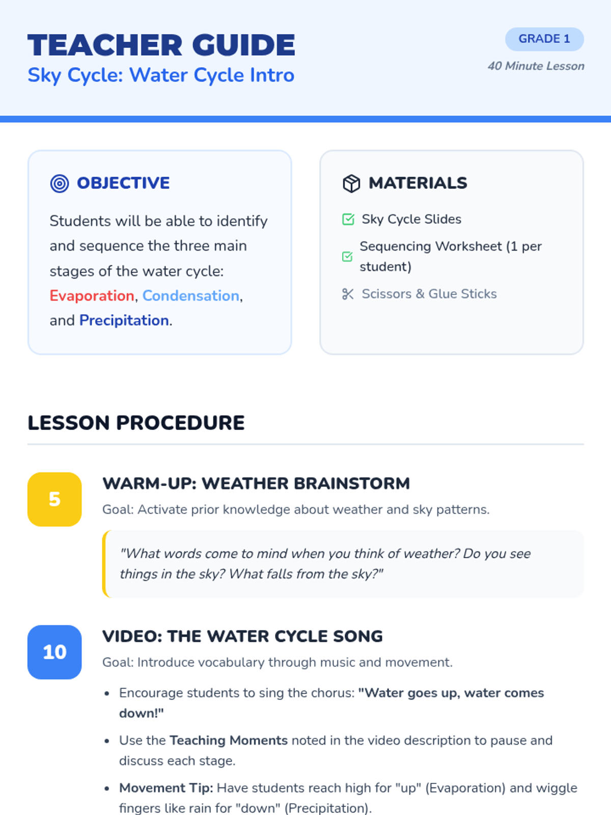 A fun, interactive introduction to the water cycle for 1st graders, featuring a catchy song and a hands-on sequencing activity. Students will learn the three main stages: evaporation, condensation, and precipitation.