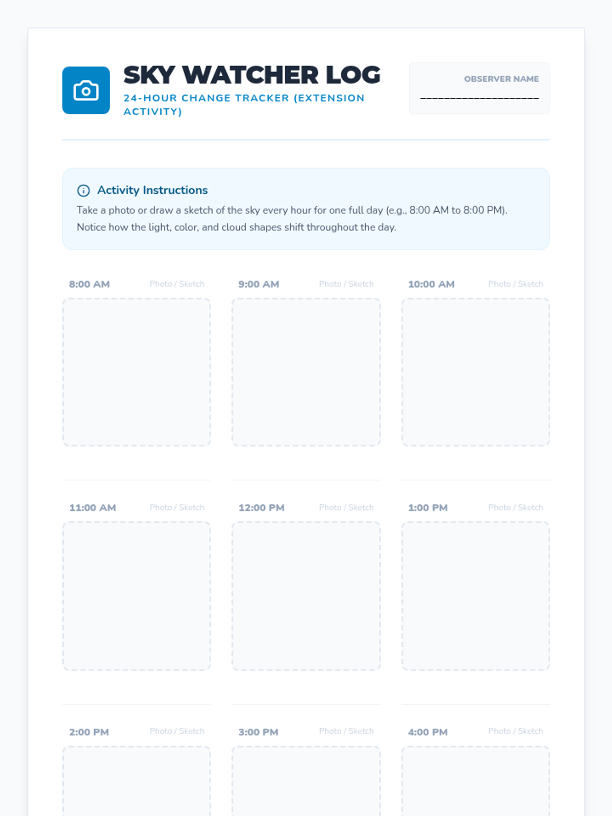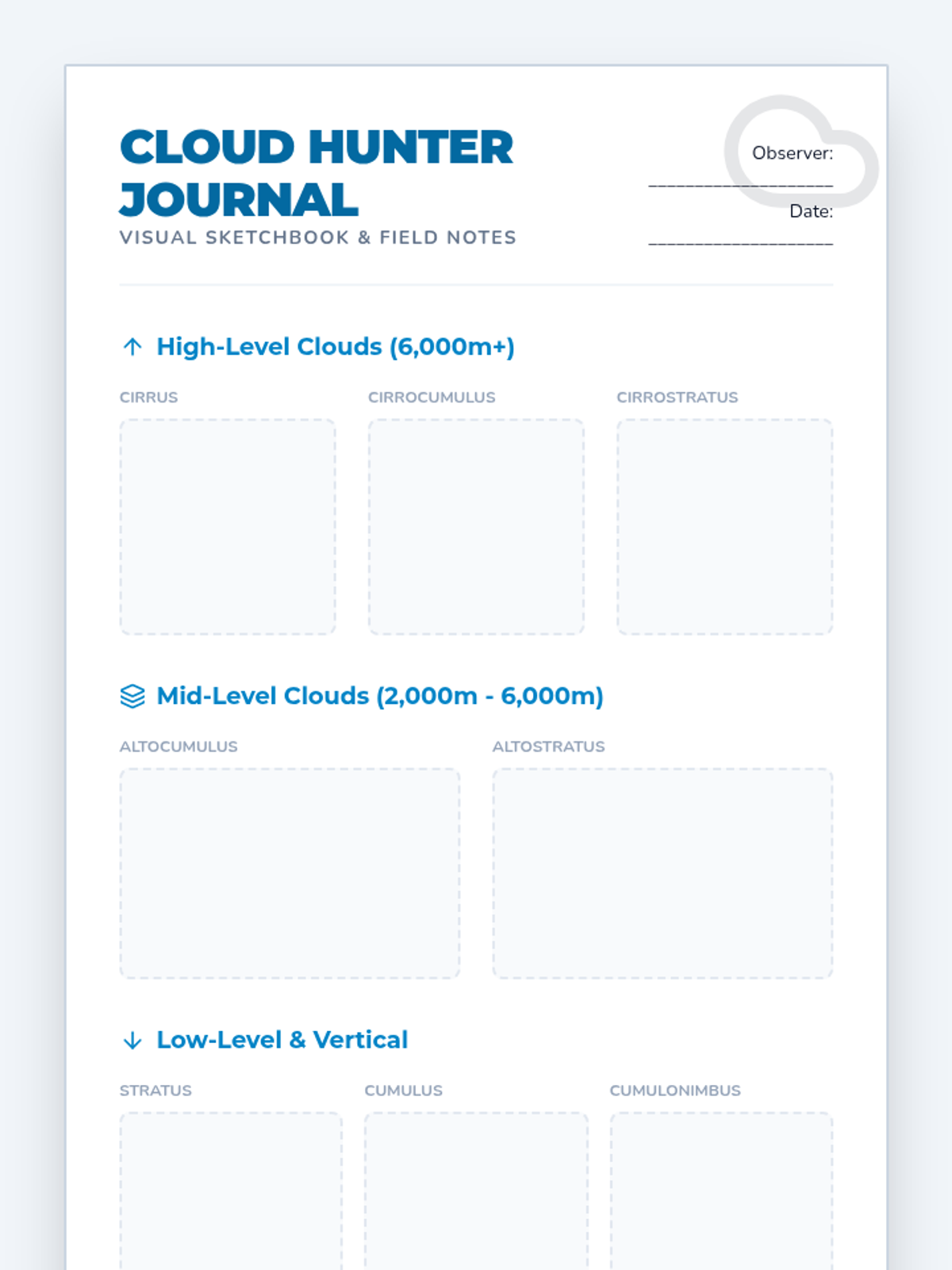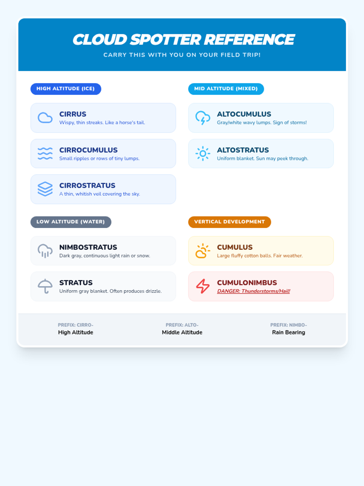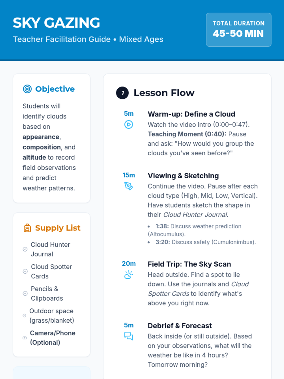 A hands-on homeschool lesson for mixed ages focused on identifying cloud types through video observation and real-world field recording. Students will learn how altitude and appearance classify clouds and use their skills to predict the weather.