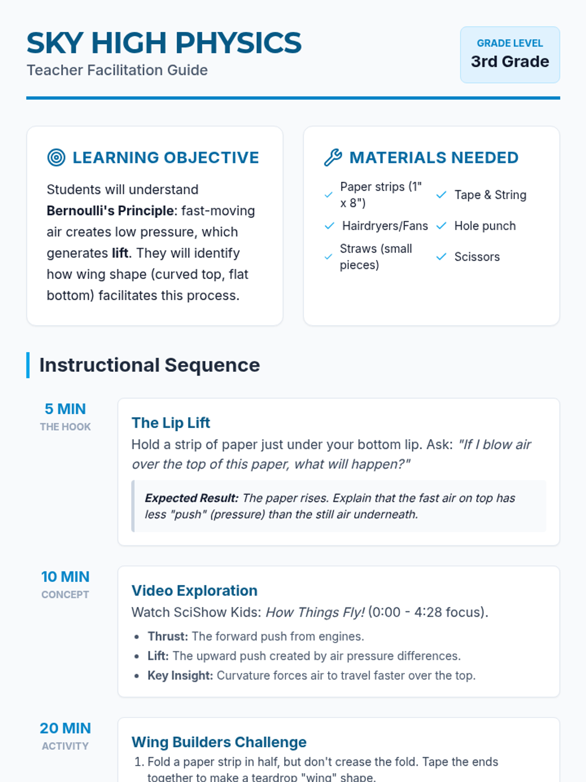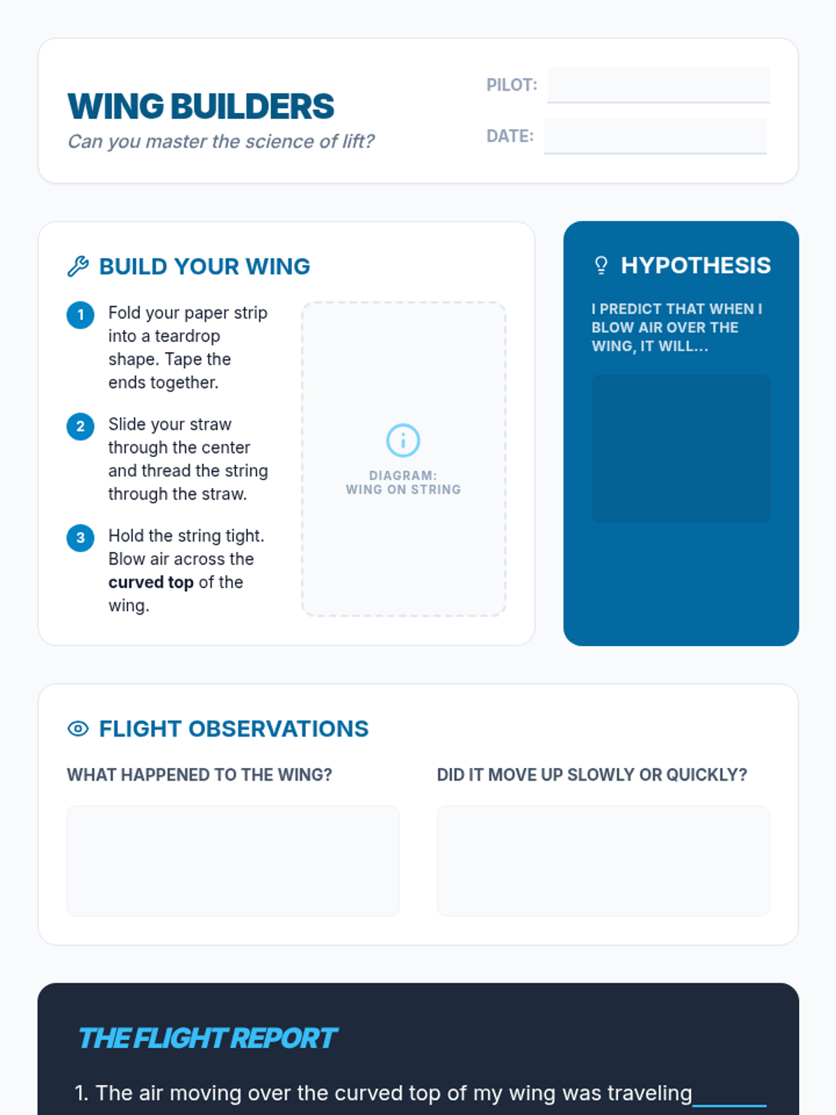 A hands-on exploration of Bernoulli's principle and the science of lift, featuring a paper-strip hook, an engaging video from SciShow Kids, and a 'Wing Builders' engineering challenge. Students will discover how wing shape and air speed create the forces needed for flight.