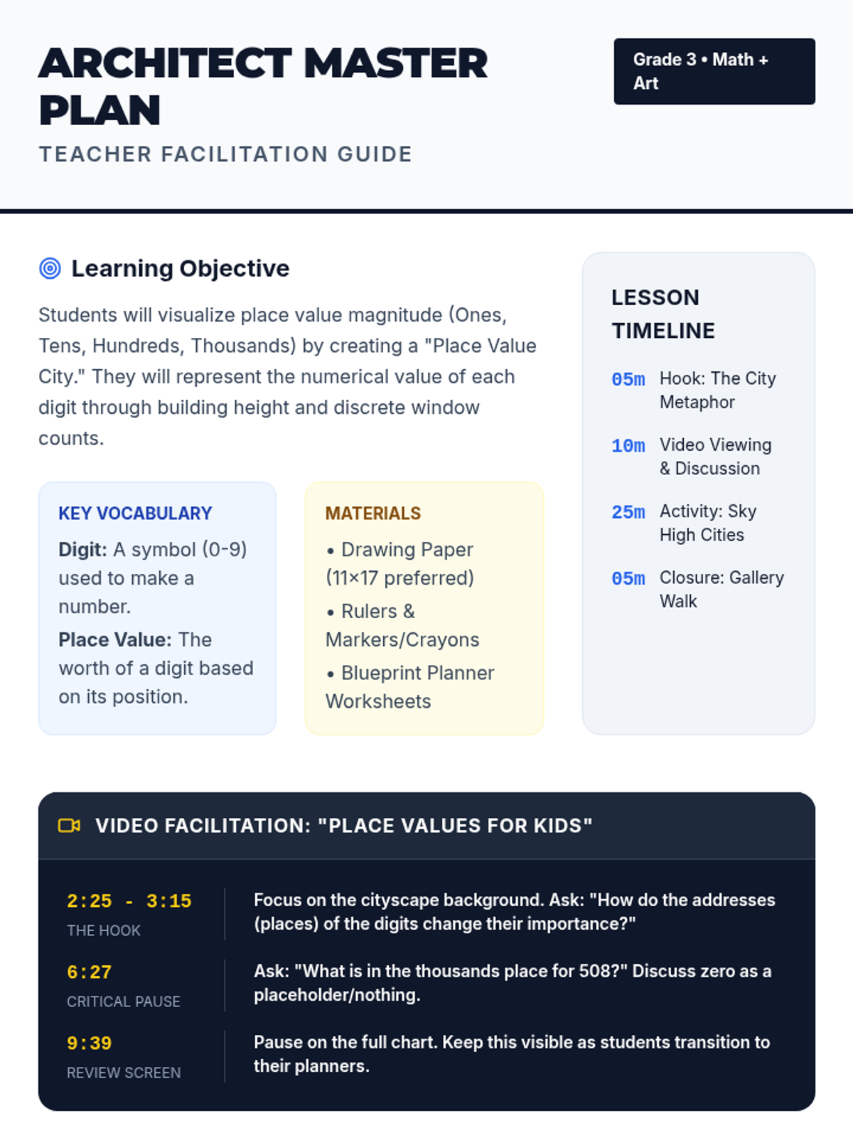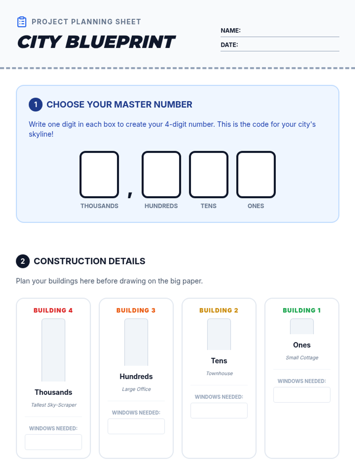A creative math and art integration lesson where students visualize the magnitude of ones, tens, hundreds, and thousands by building a 'Place Value City' with skyscrapers. Students use a specific video to learn the concept and then apply it by drawing buildings with heights and window counts corresponding to a 4-digit number.