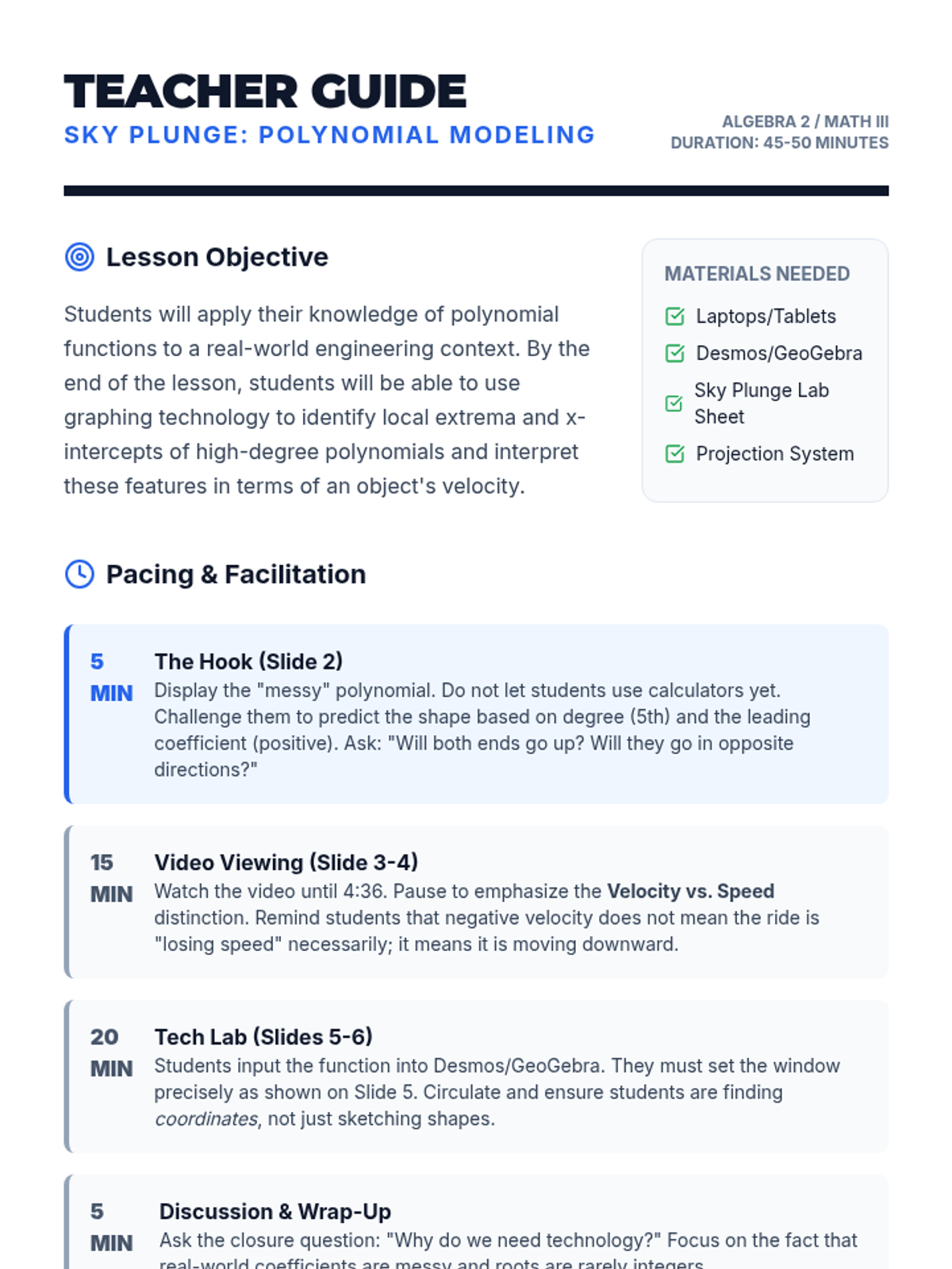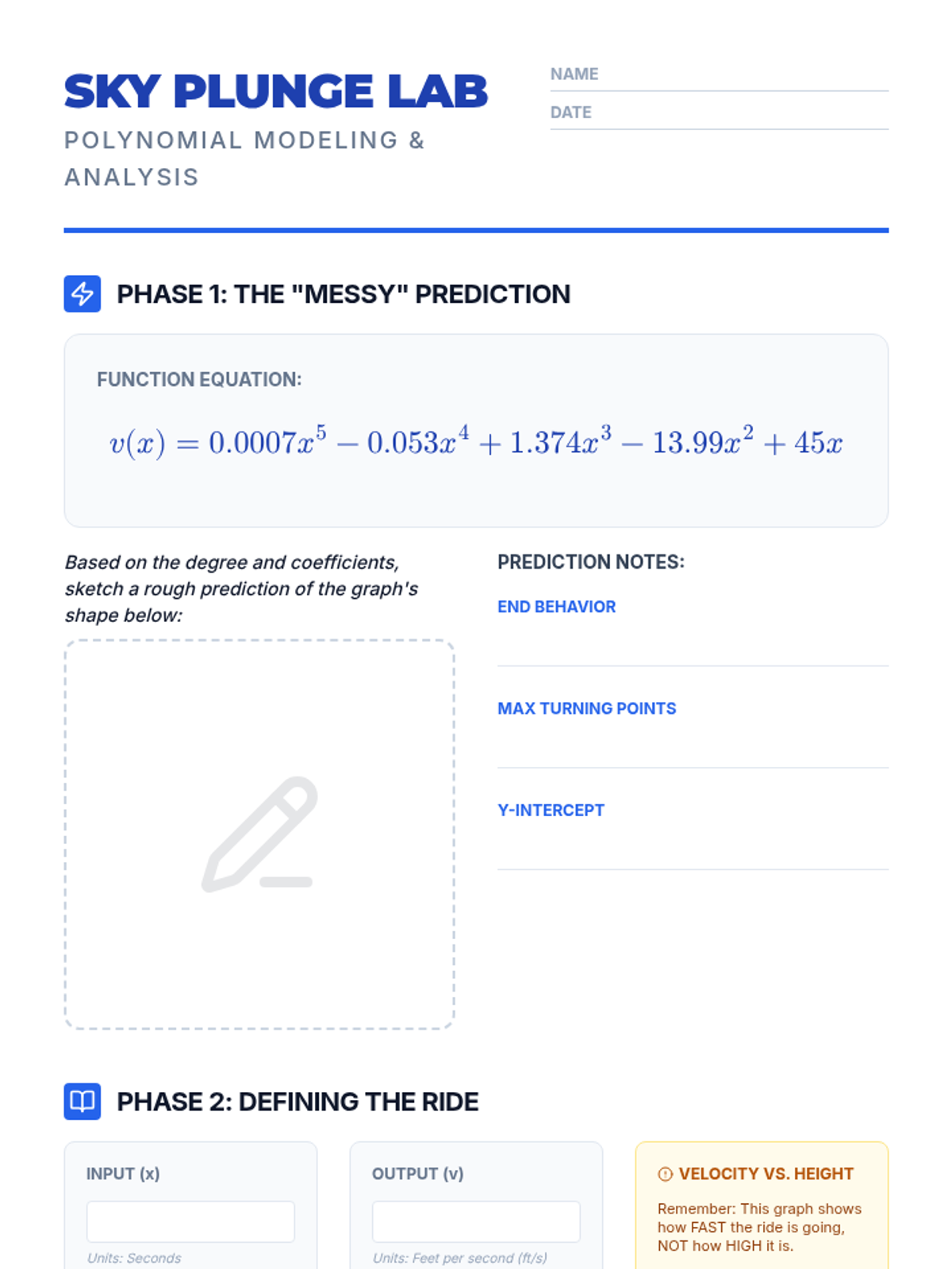 A high-energy Algebra 2 lesson where students use graphing technology to analyze the velocity of a drop tower ride, modeled by a 5th-degree polynomial. Students differentiate between speed and velocity and interpret key graph features in a real-world context.