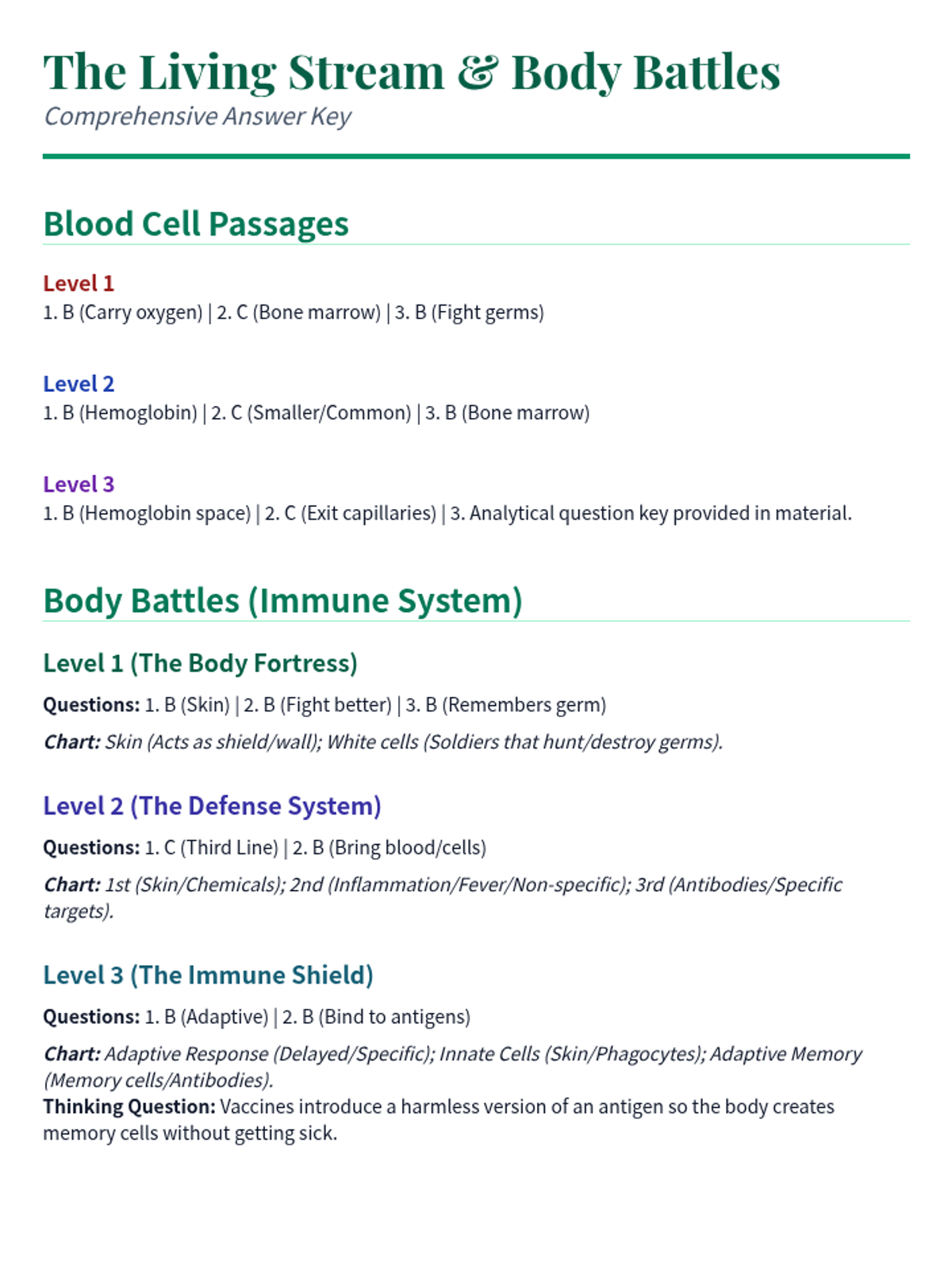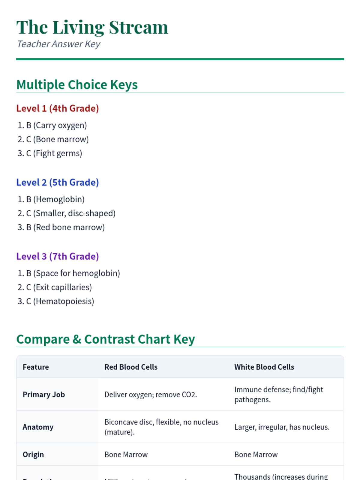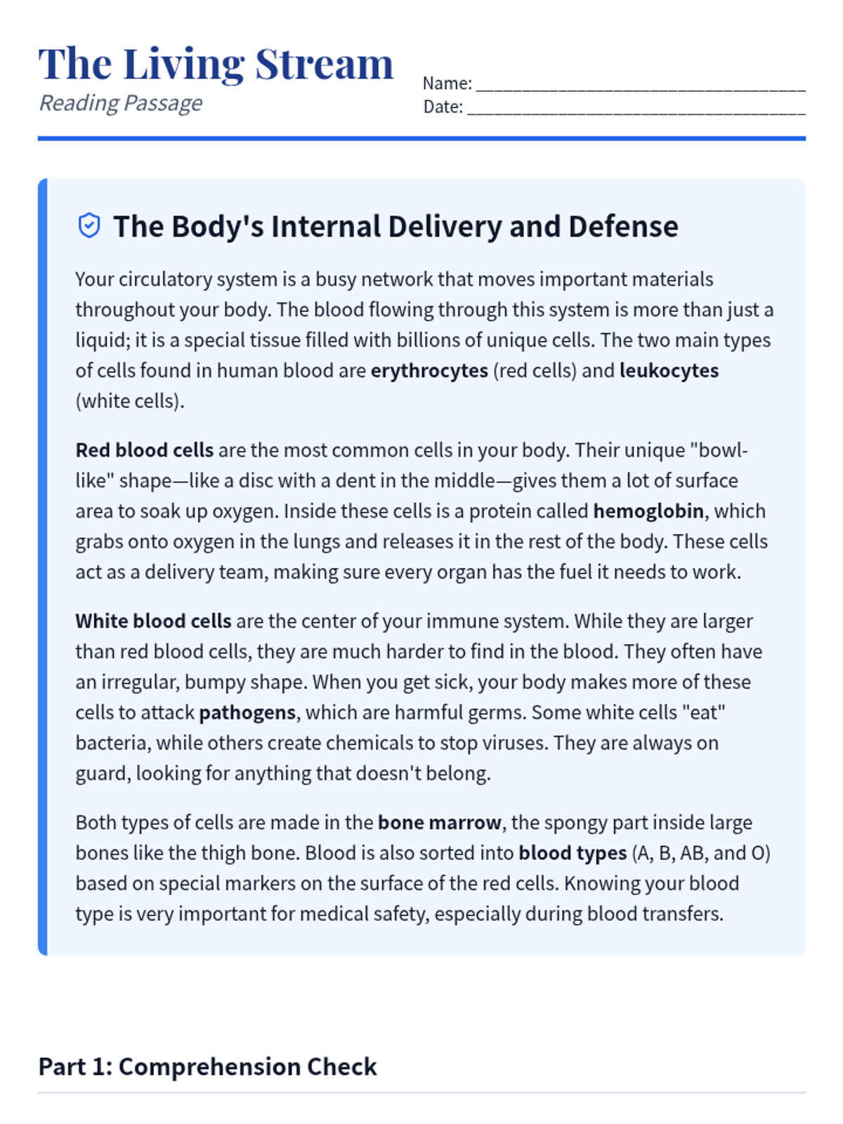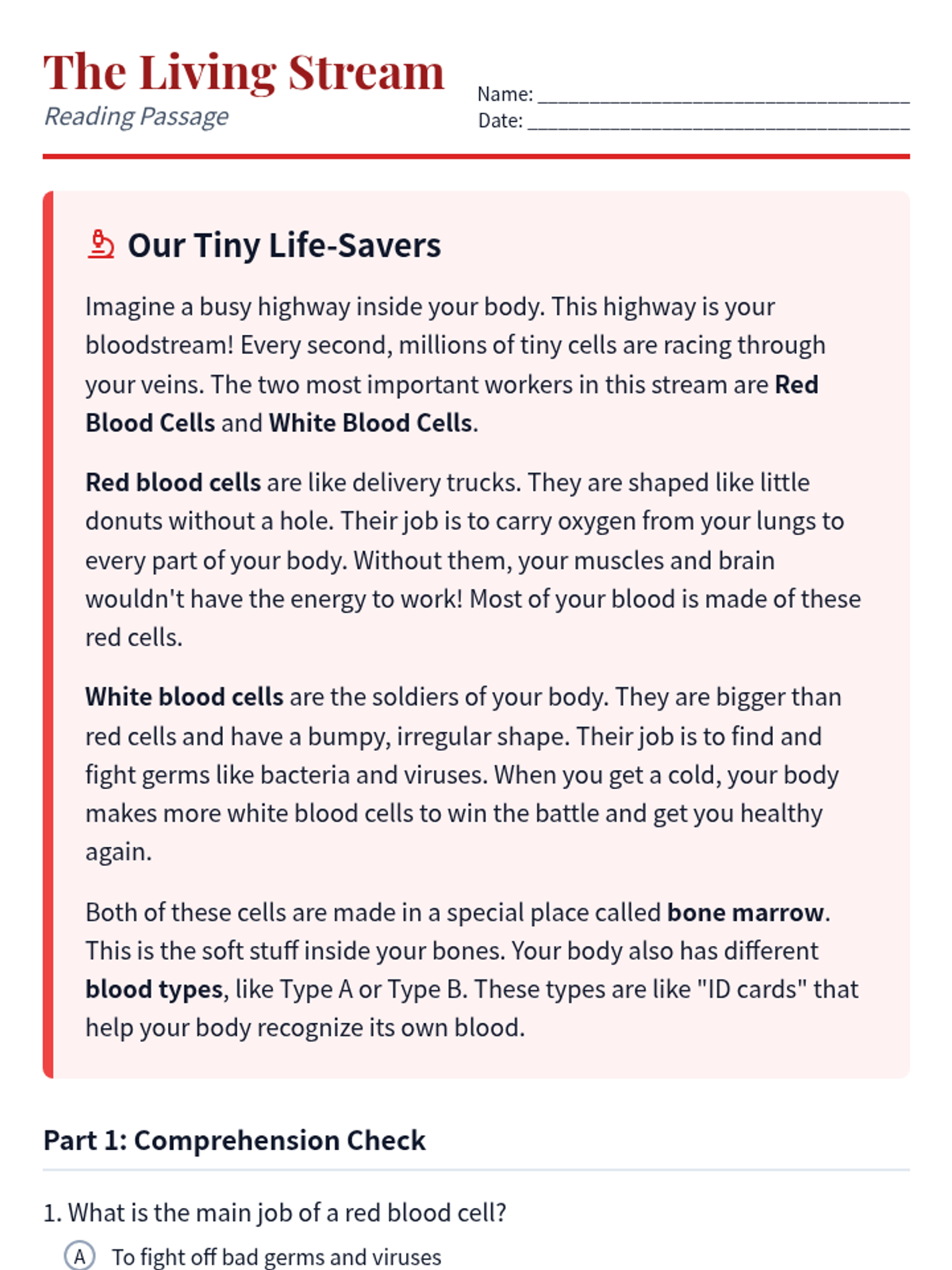 A lesson exploring the specialized roles of red and white blood cells, their production in bone marrow, and their vital functions in oxygen transport and immune defense. Includes differentiated reading materials for various reading levels.