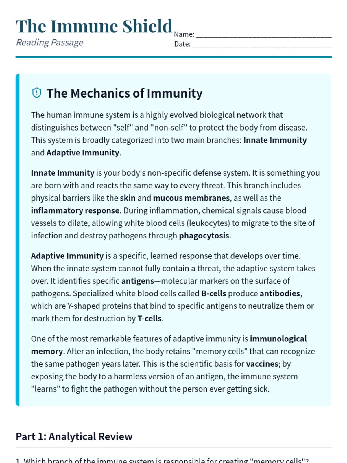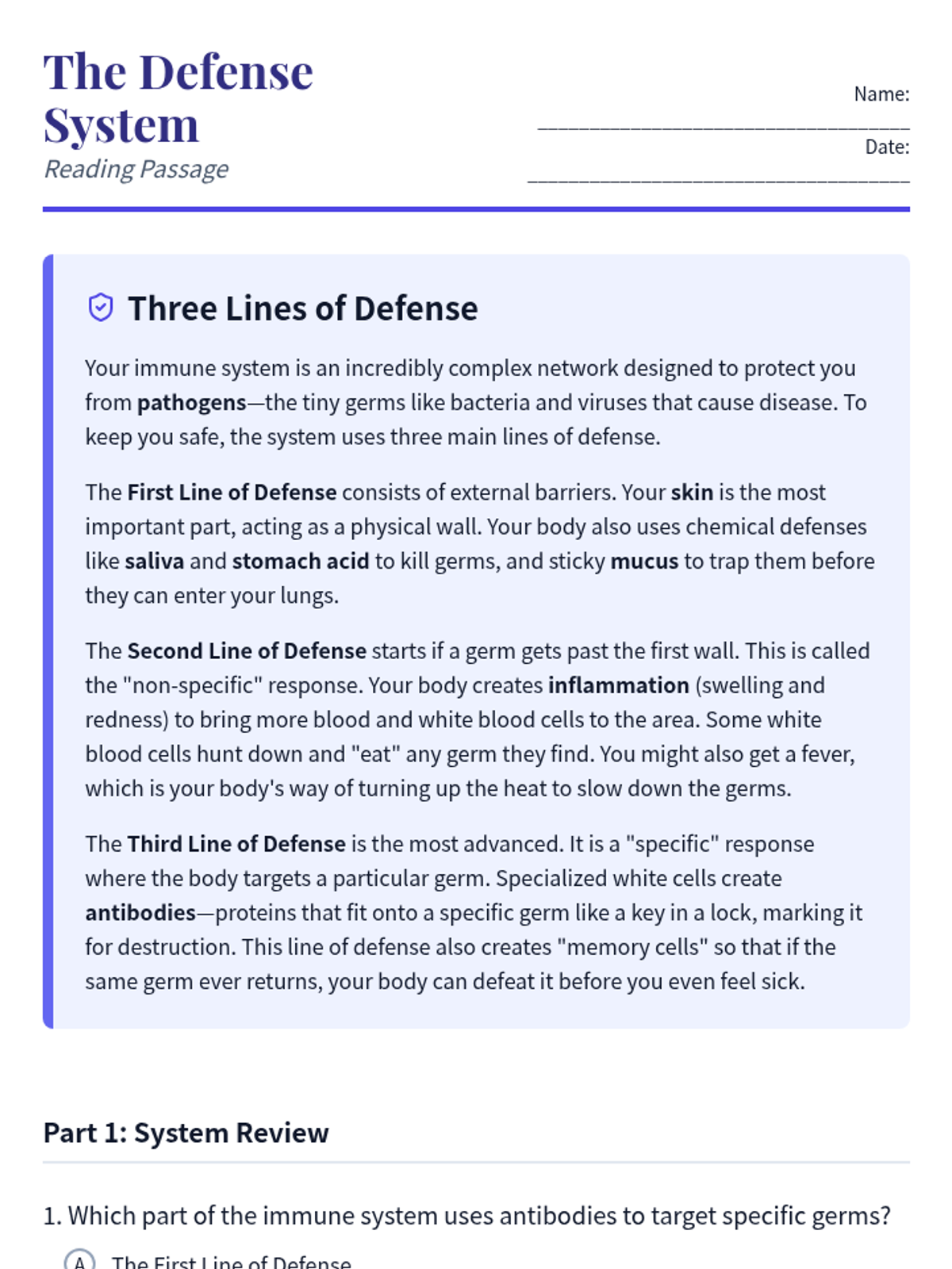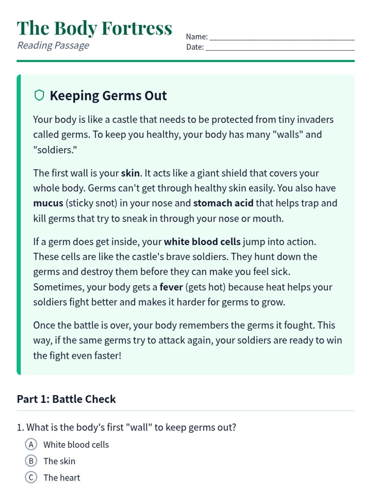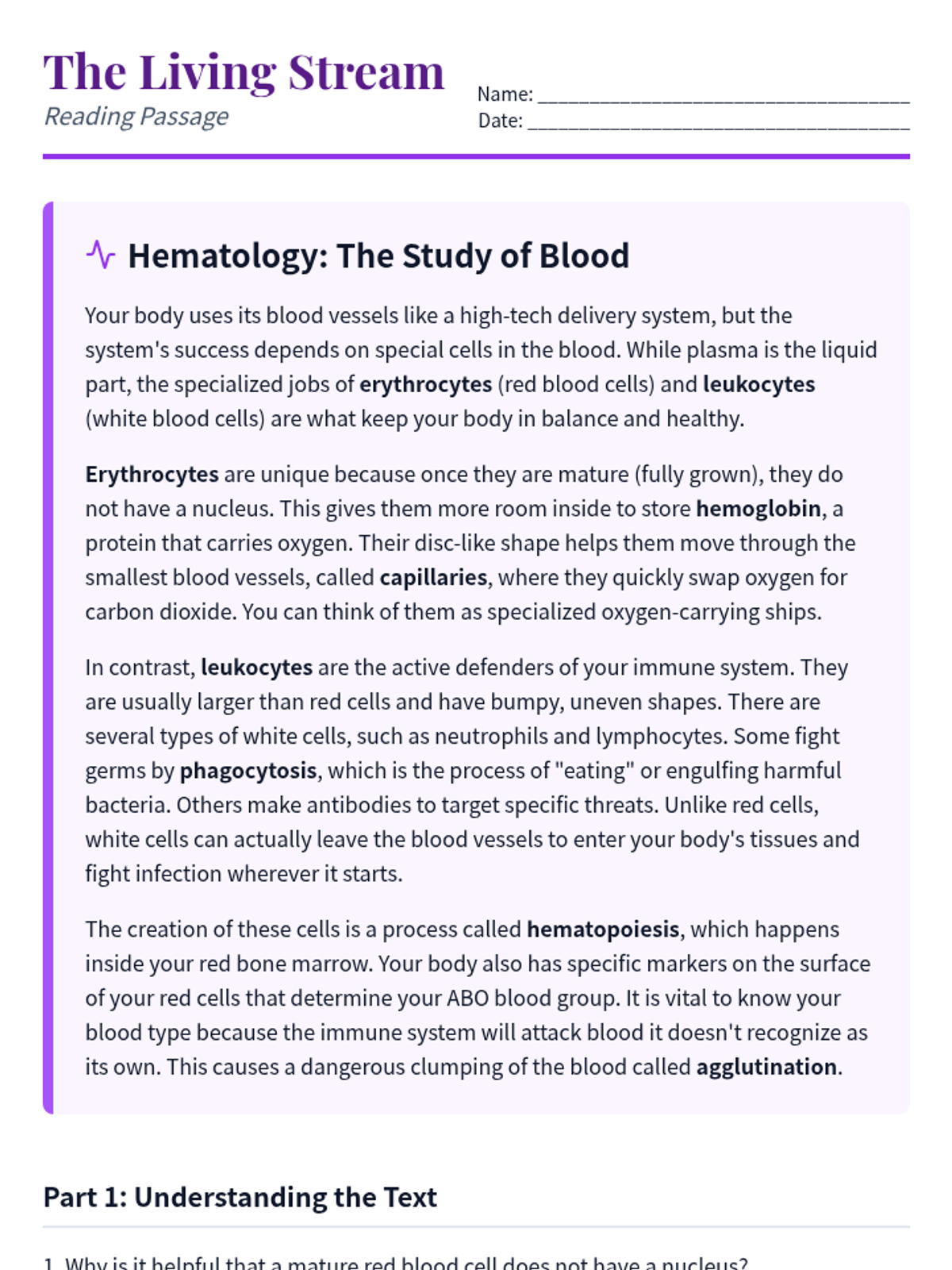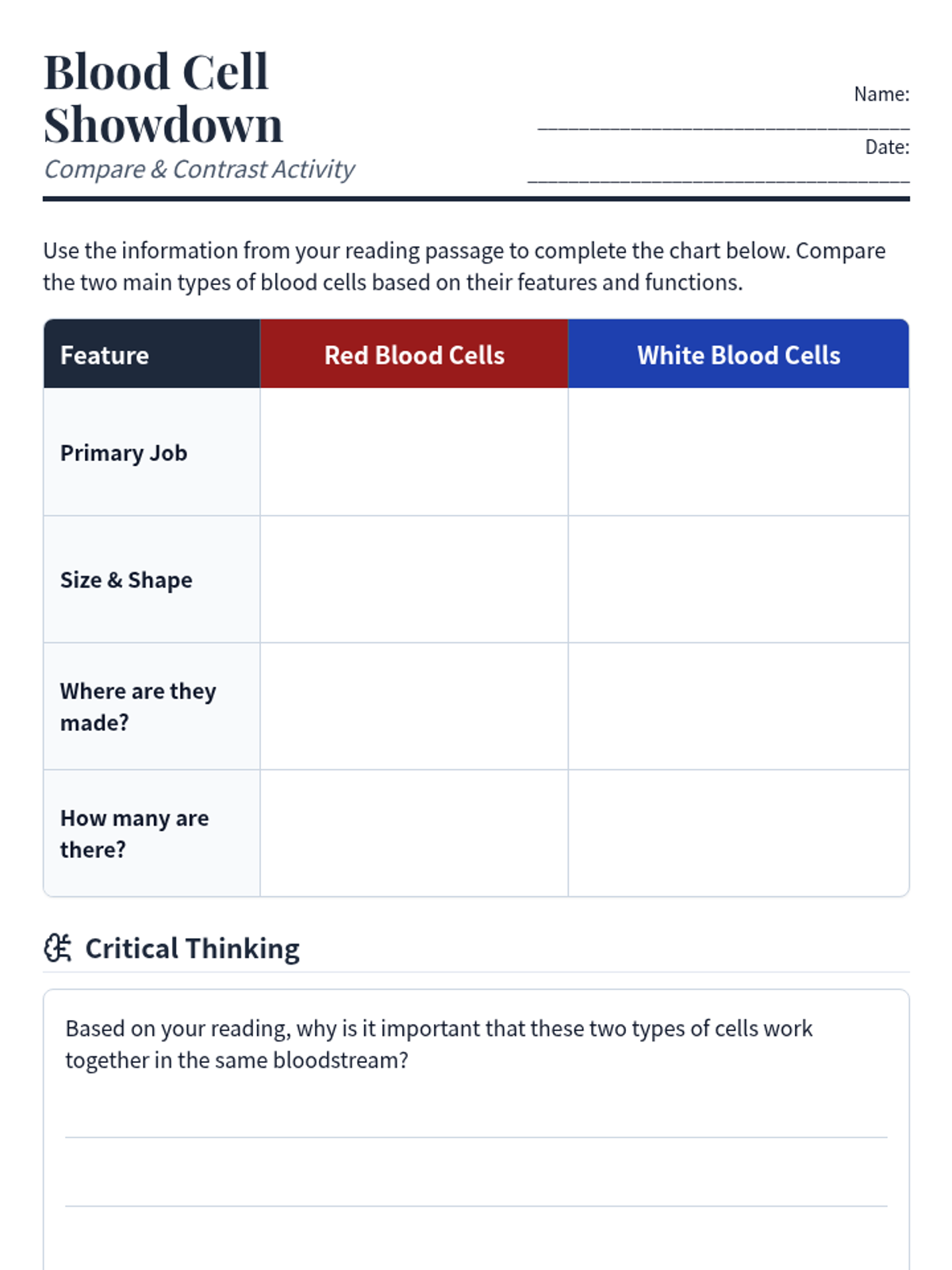 A lesson exploring the specialized roles of red and white blood cells, their production in bone marrow, and their vital functions in oxygen transport and immune defense. Includes differentiated reading materials for various reading levels.