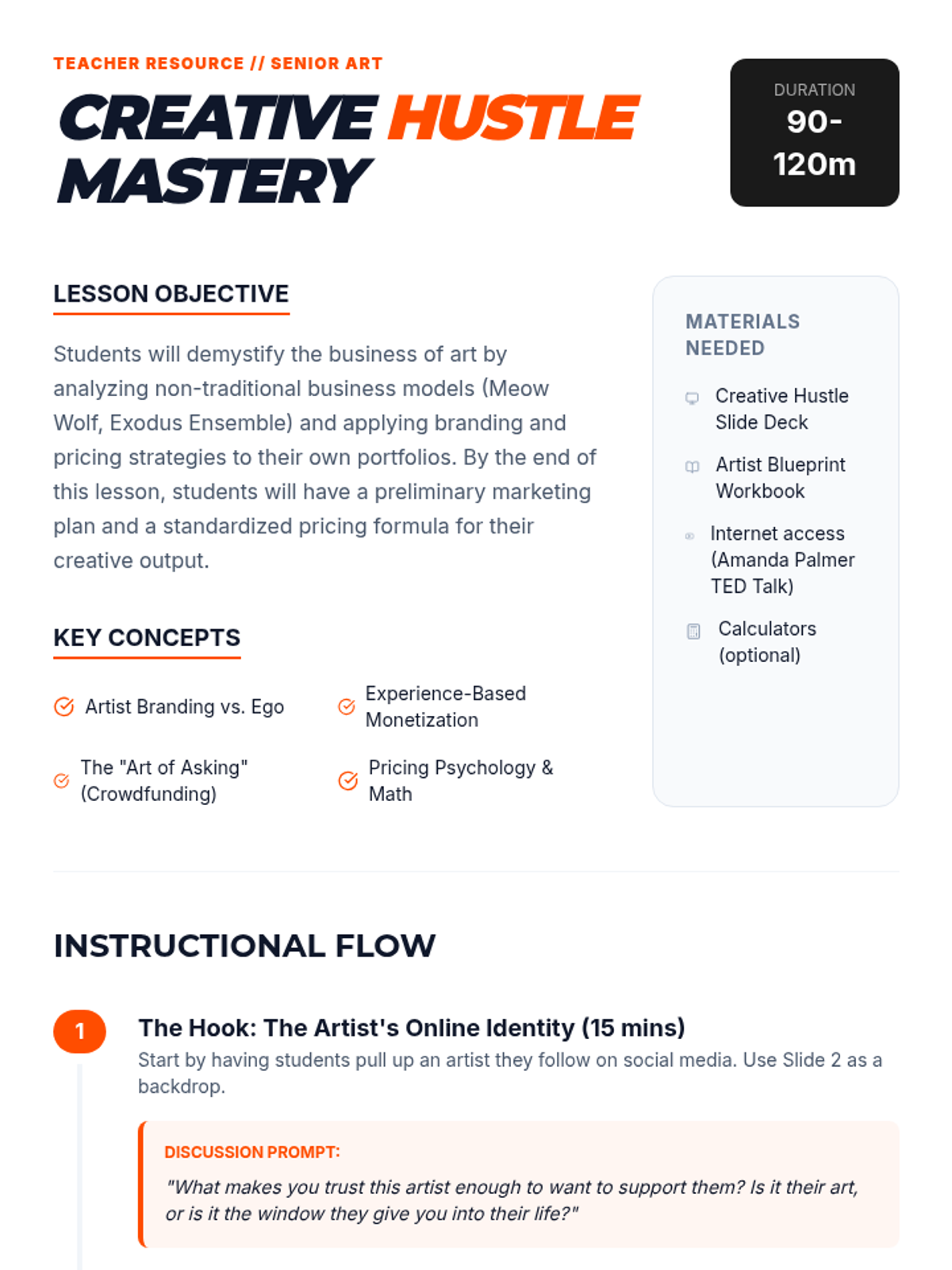 A comprehensive lesson for senior art students on the business and promotion of their work, featuring case studies like Meow Wolf and Exodus Ensemble. Students will learn about personal branding, pricing, and the 'Art of Asking' to build sustainable creative careers.