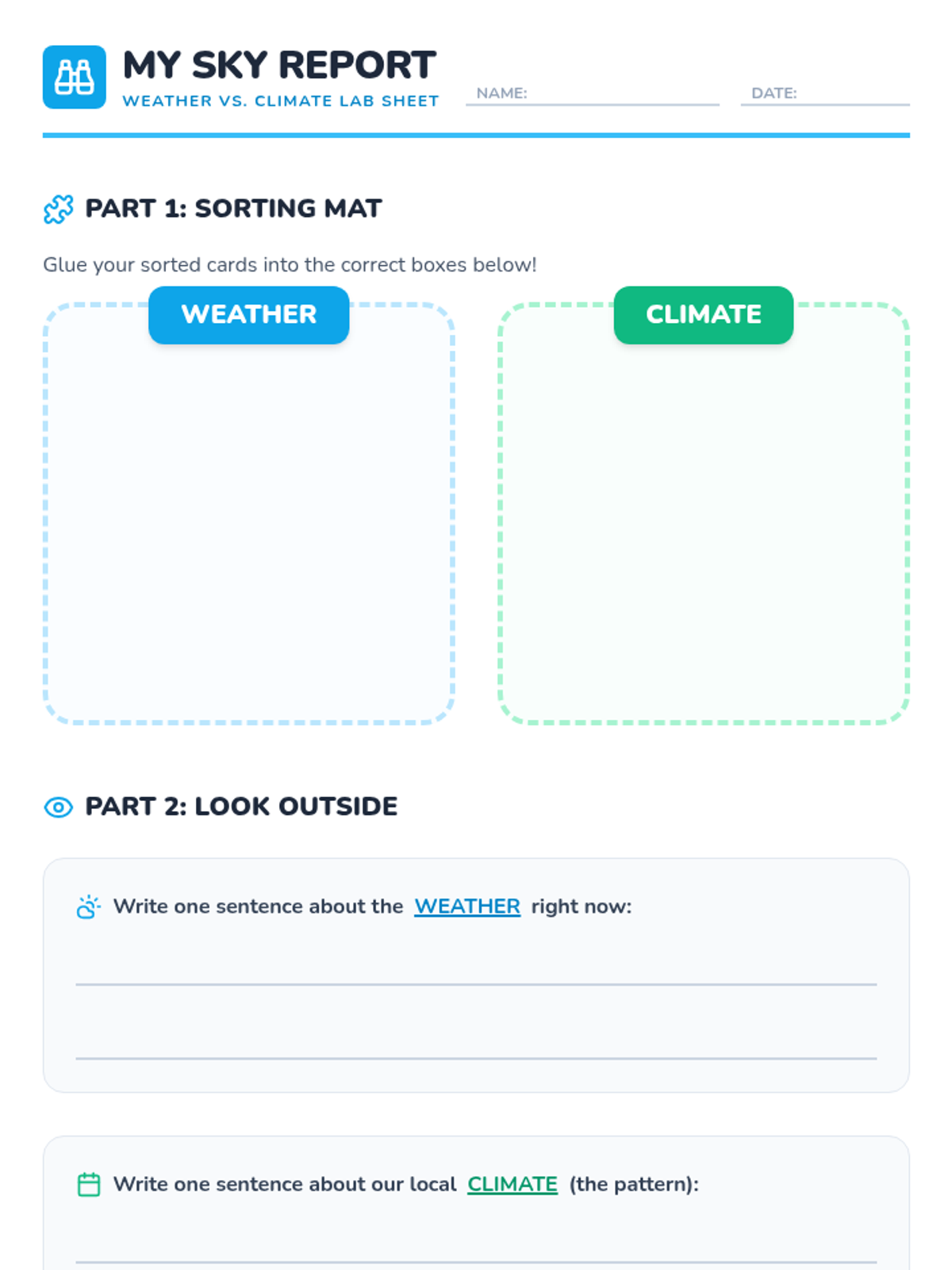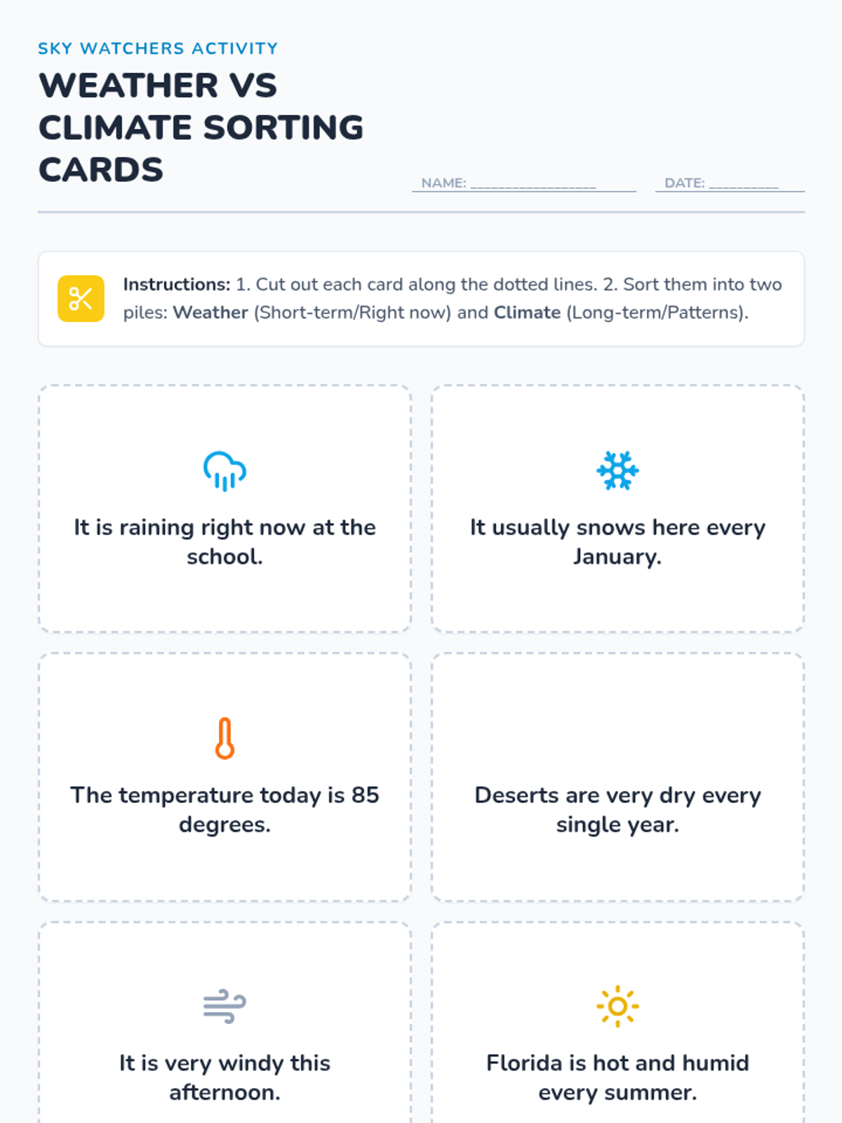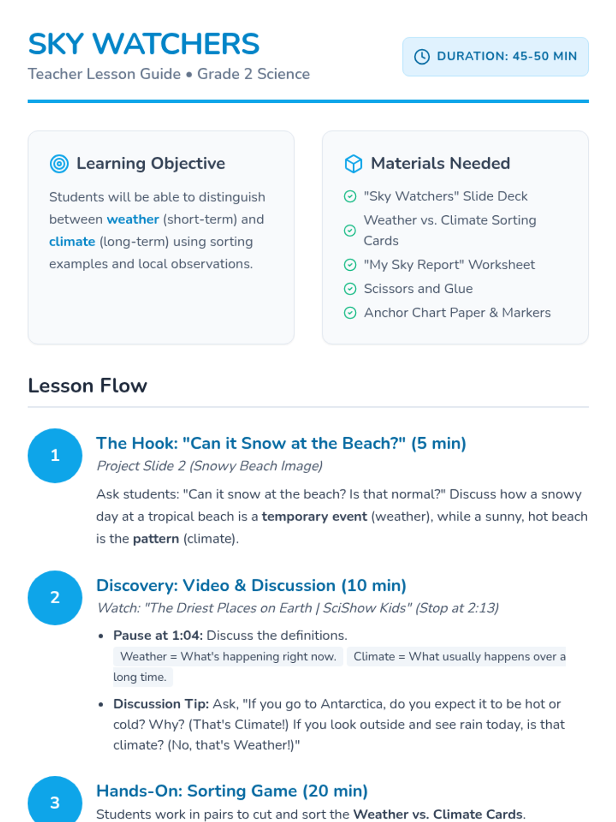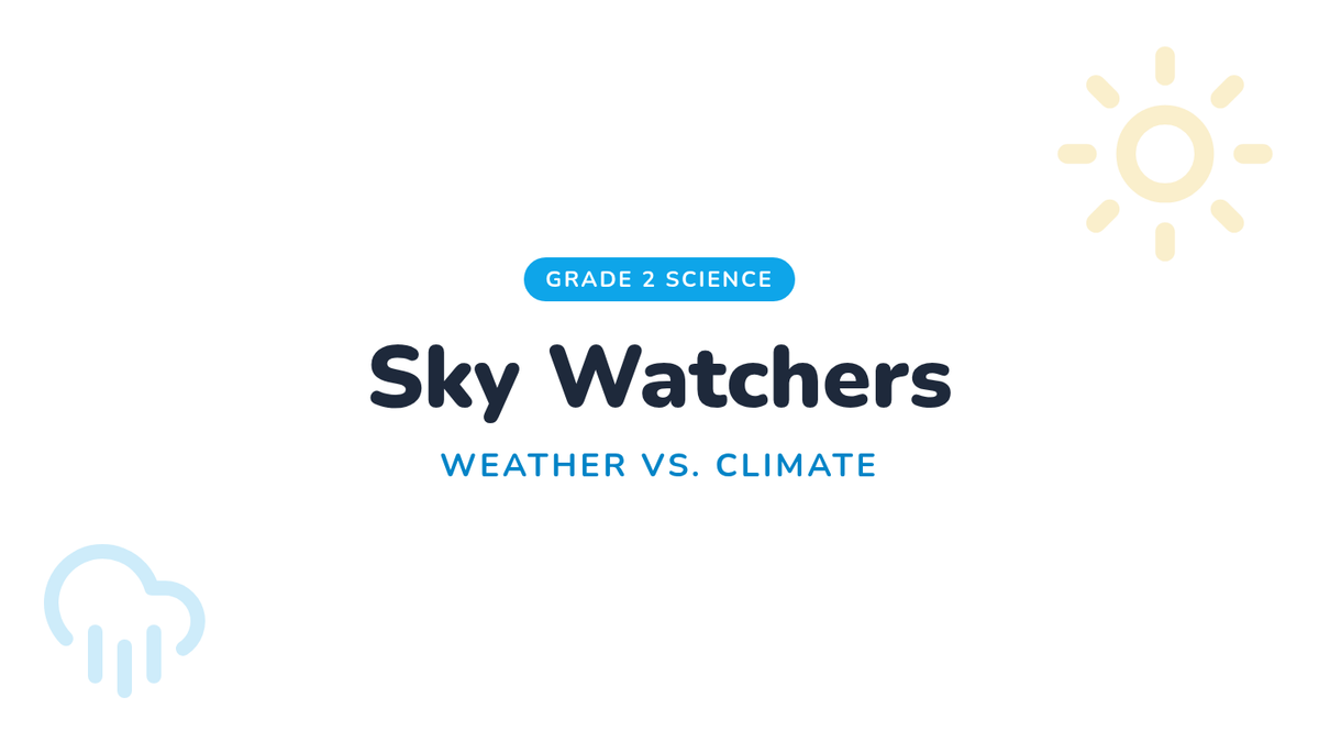 A 2nd-grade science lesson that distinguishes between weather (temporary, current conditions) and climate (long-term patterns) using a SciShow Kids video and a hands-on sorting activity.