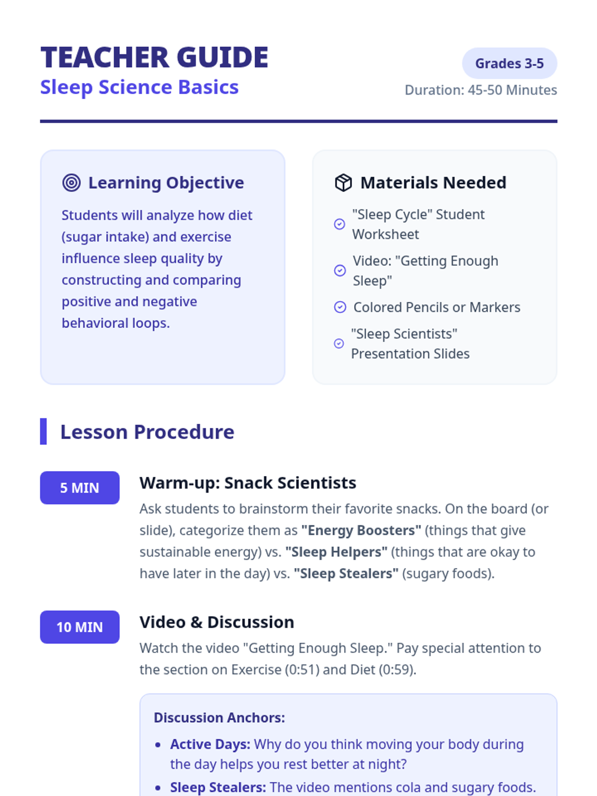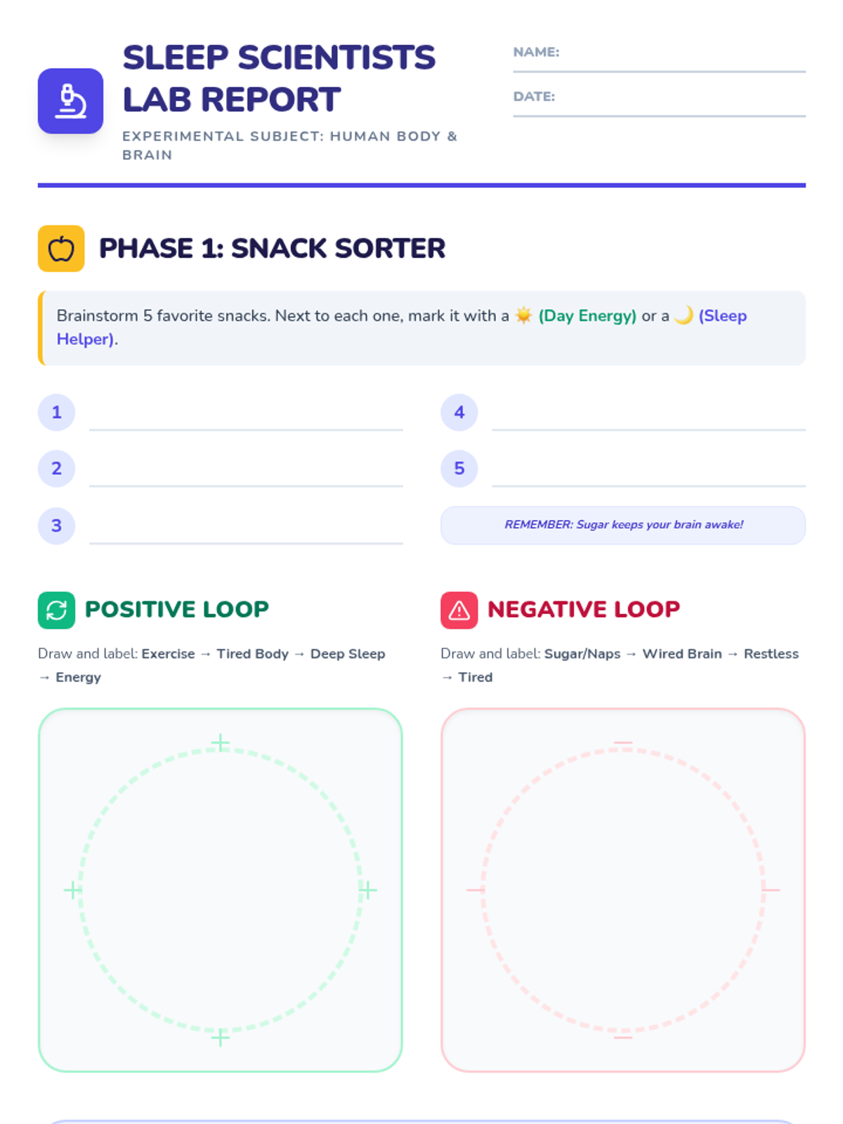 A lesson for grades 3-5 focusing on the connection between physical activity, diet, and sleep quality through the concept of positive and negative feedback loops.