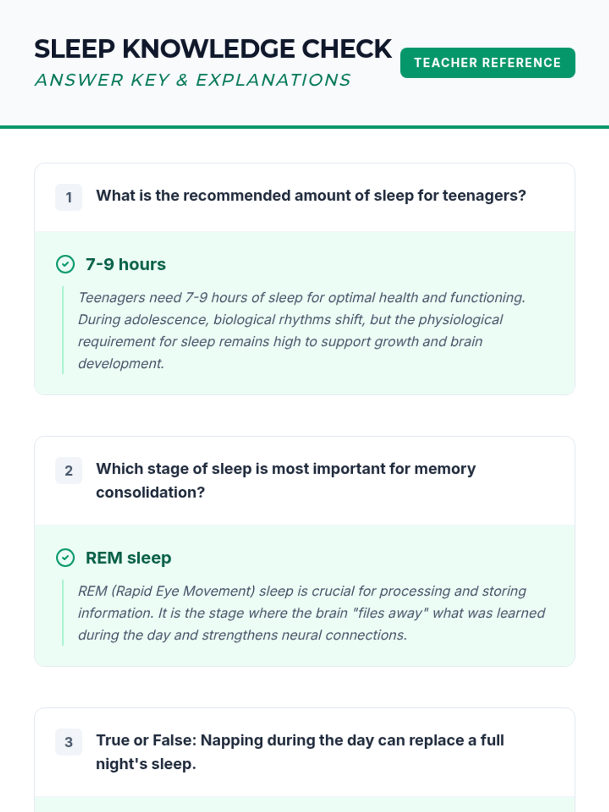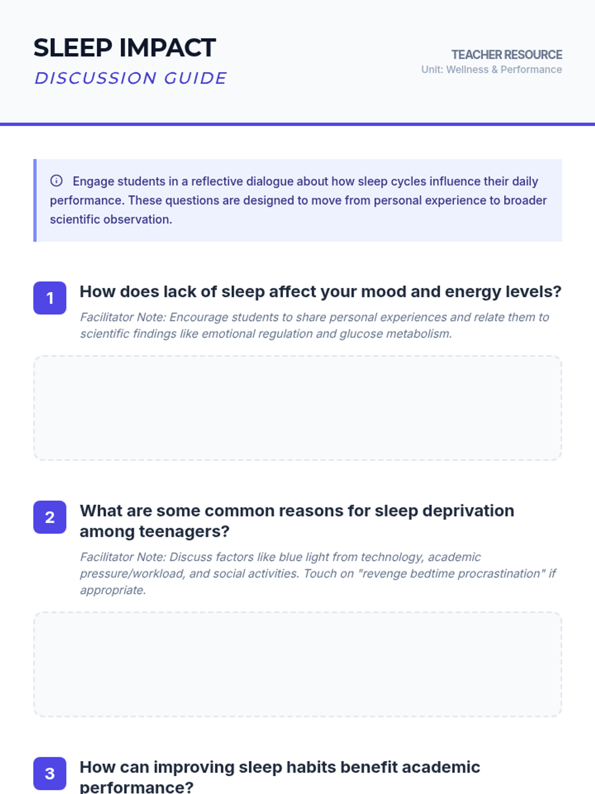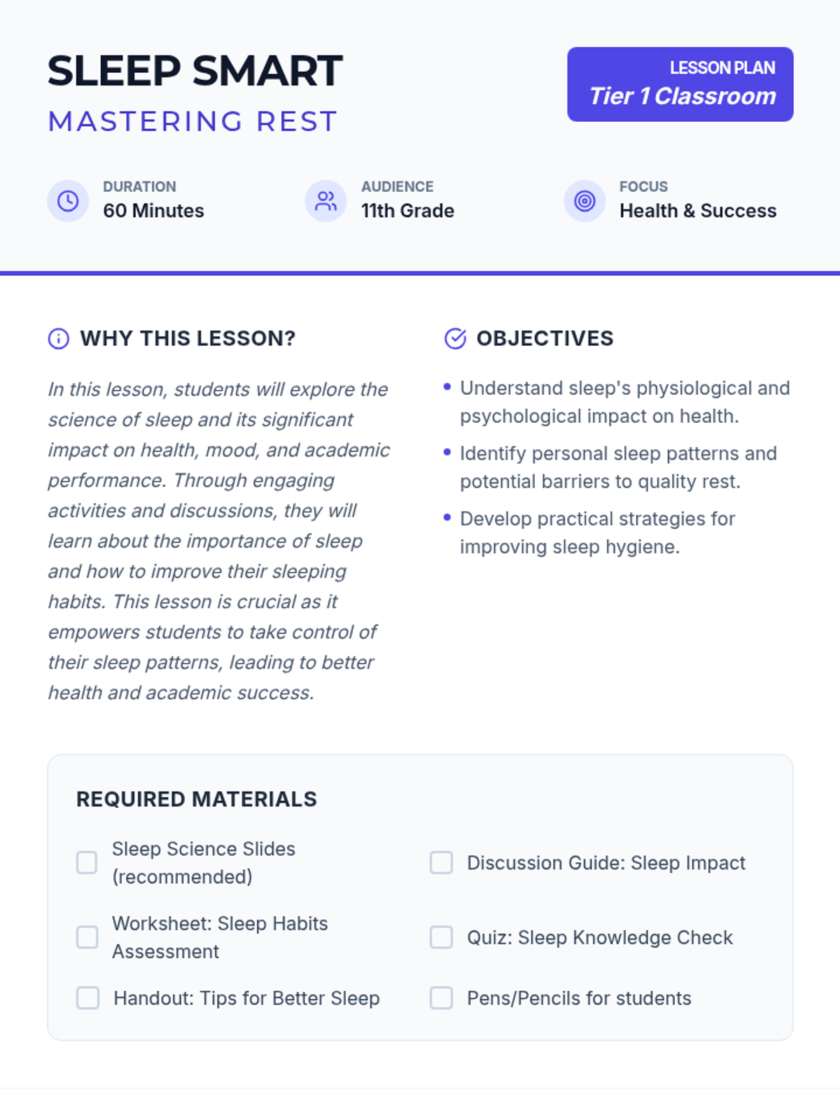 Students will explore the science of sleep, its impact on health and academic performance, and develop personalized strategies for better rest. This lesson covers sleep cycles, common teenage sleep challenges, and practical tips for improving sleep hygiene.