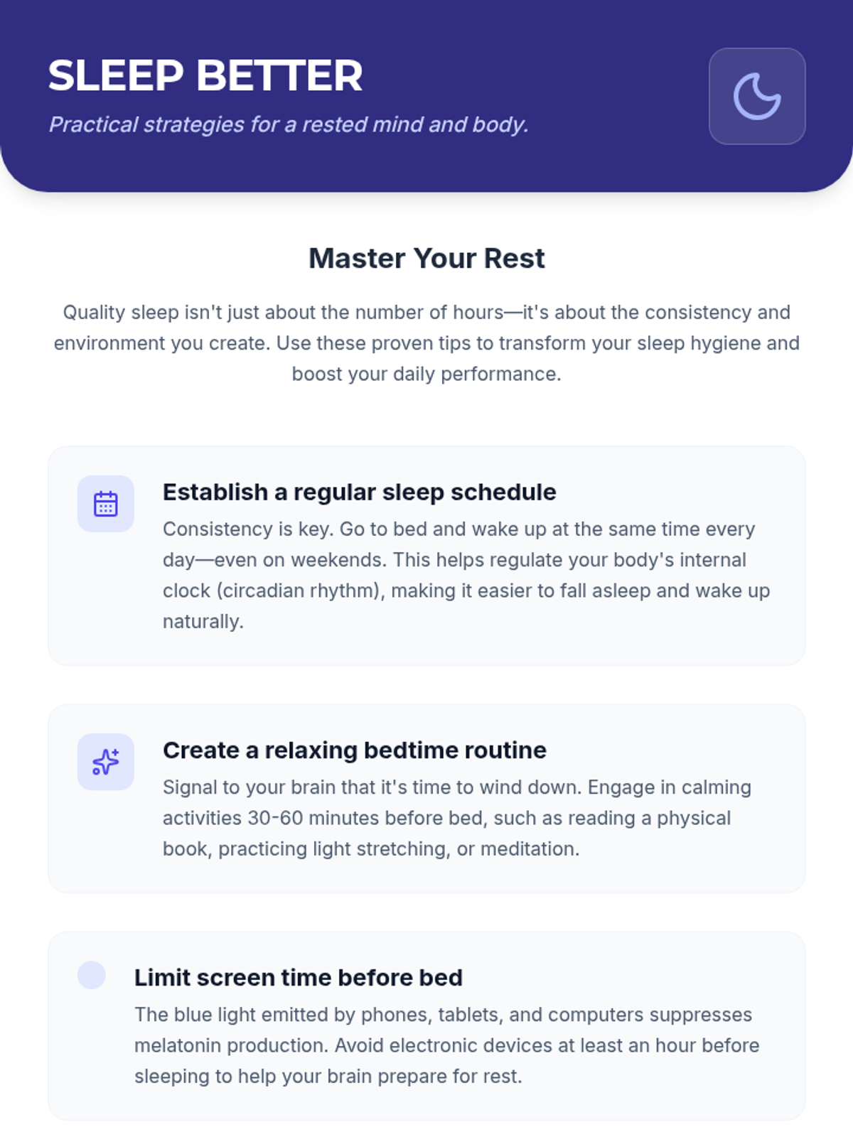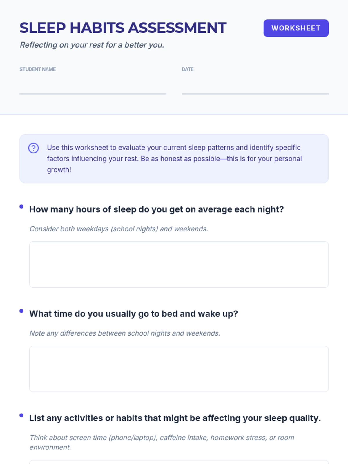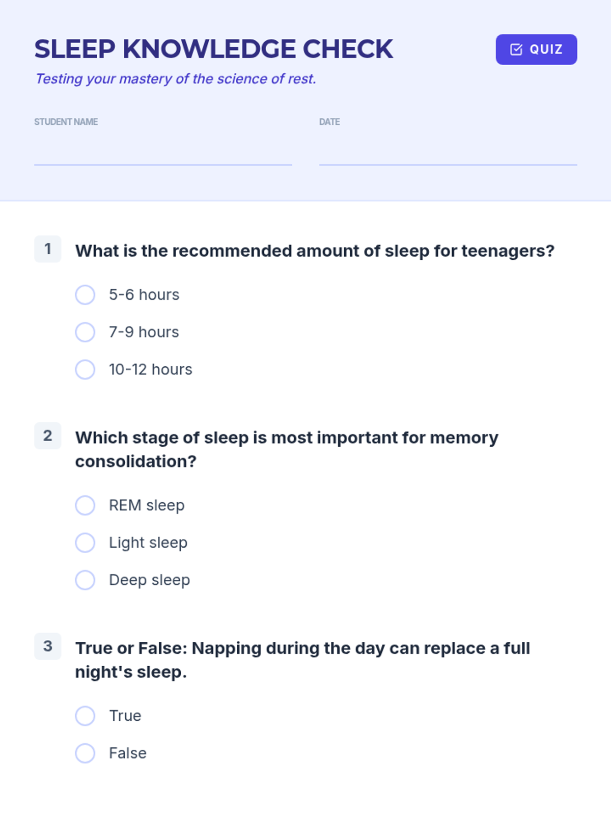 Students will explore the science of sleep, its impact on health and academic performance, and develop personalized strategies for better rest. This lesson covers sleep cycles, common teenage sleep challenges, and practical tips for improving sleep hygiene.
