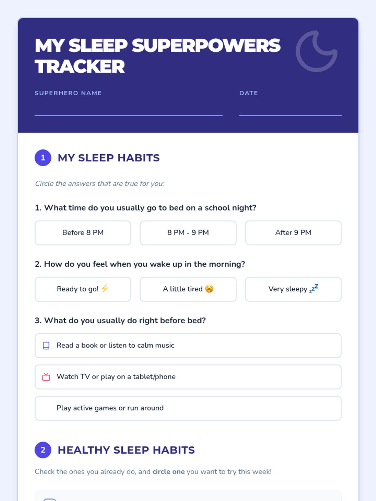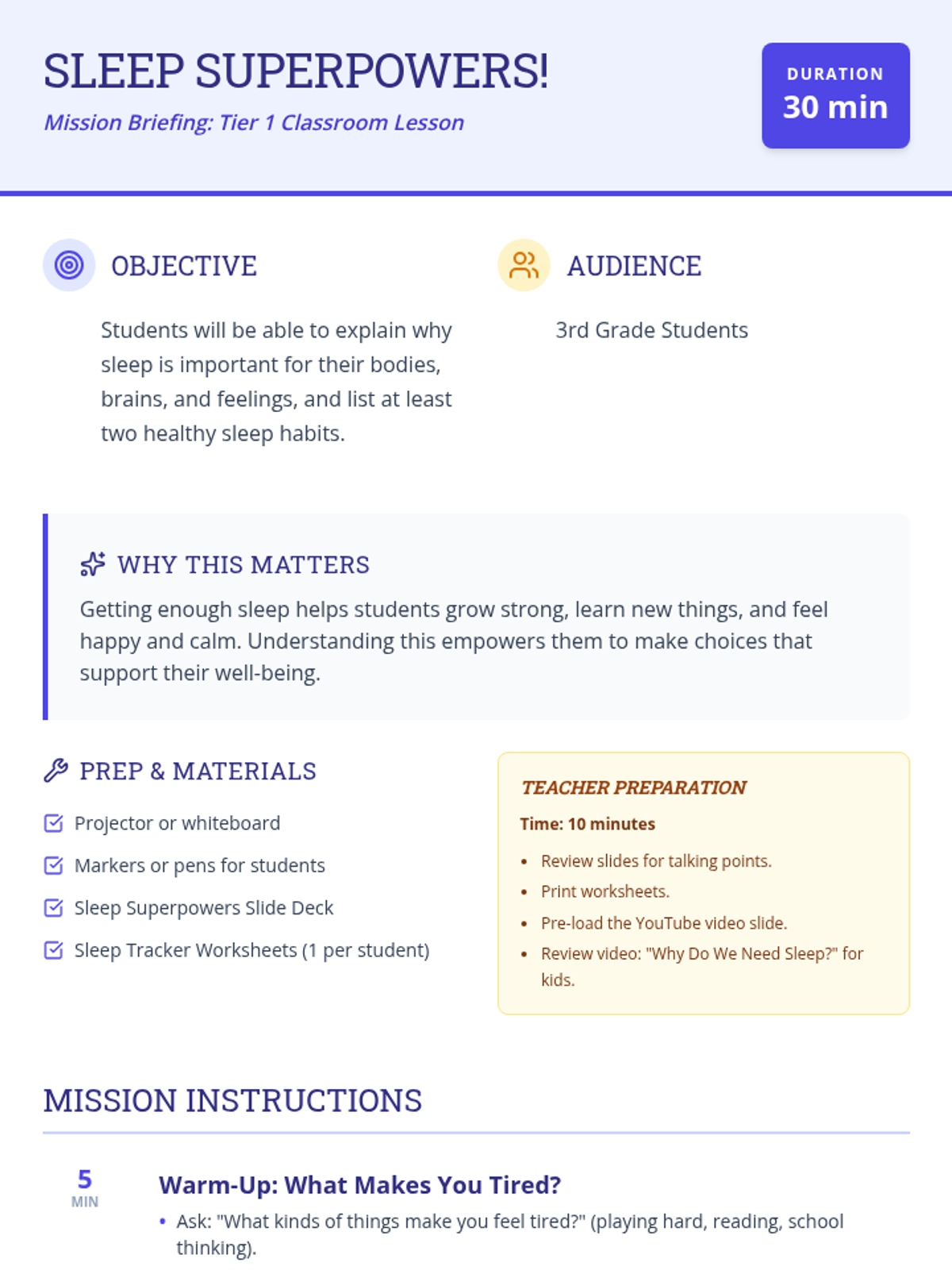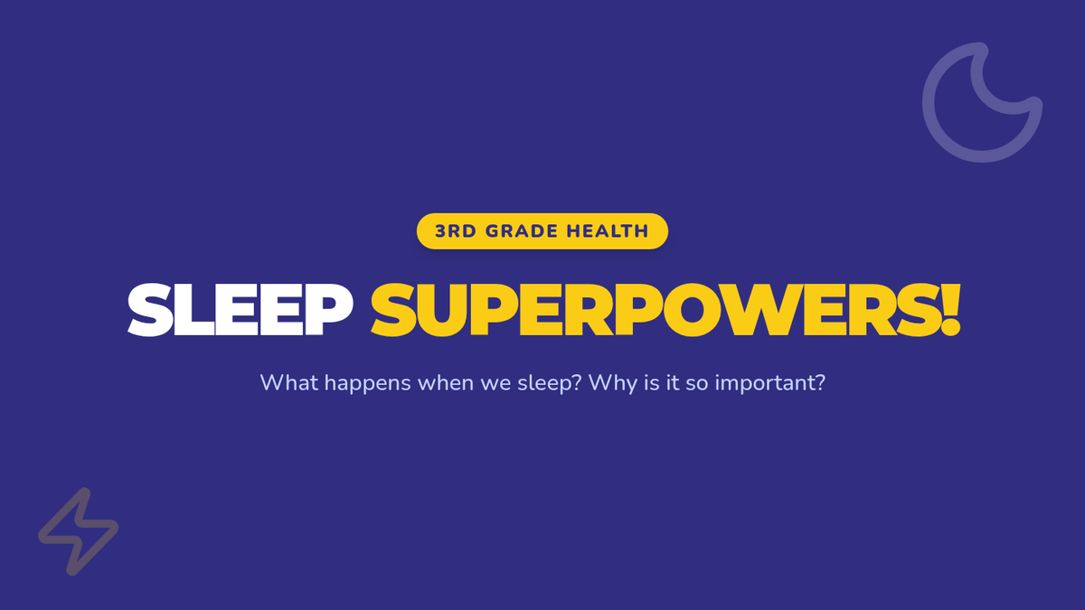 A 30-minute lesson for 3rd graders exploring why sleep is a 'superpower' for their bodies, brains, and emotions. Includes a slide deck, worksheet, and comprehensive lesson plan.