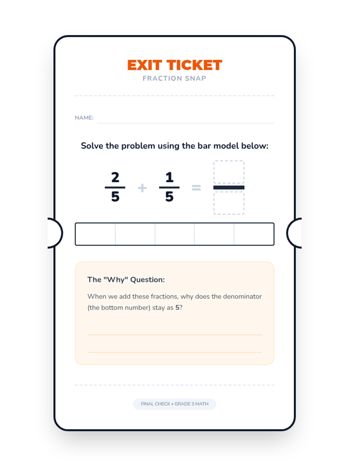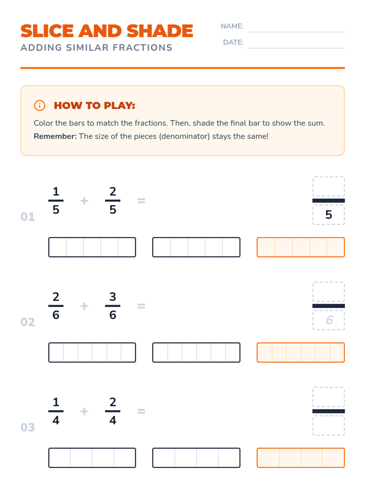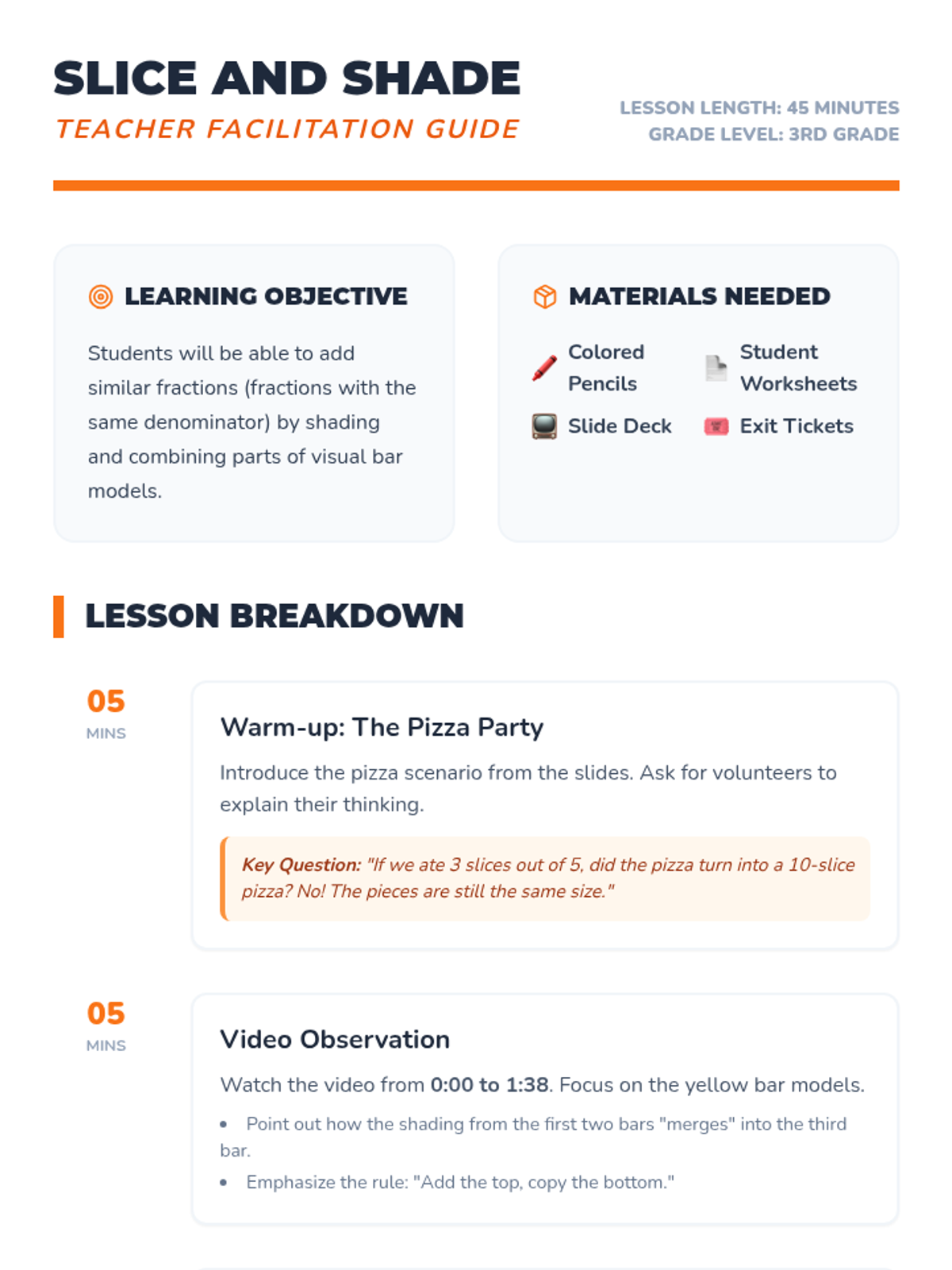 A foundational lesson on adding similar fractions using visual bar models and a pizza-themed warm-up. Students will watch a guided video and practice shading their own fraction bars to understand why the denominator remains the same.