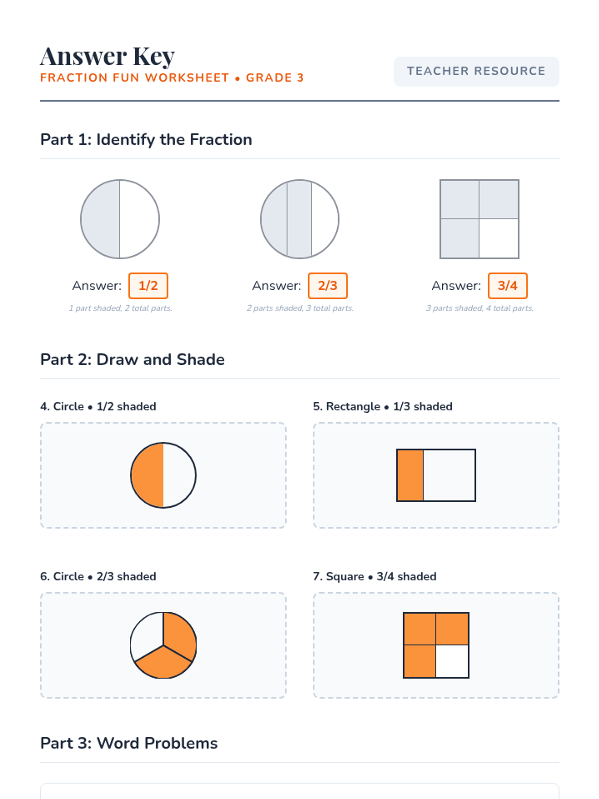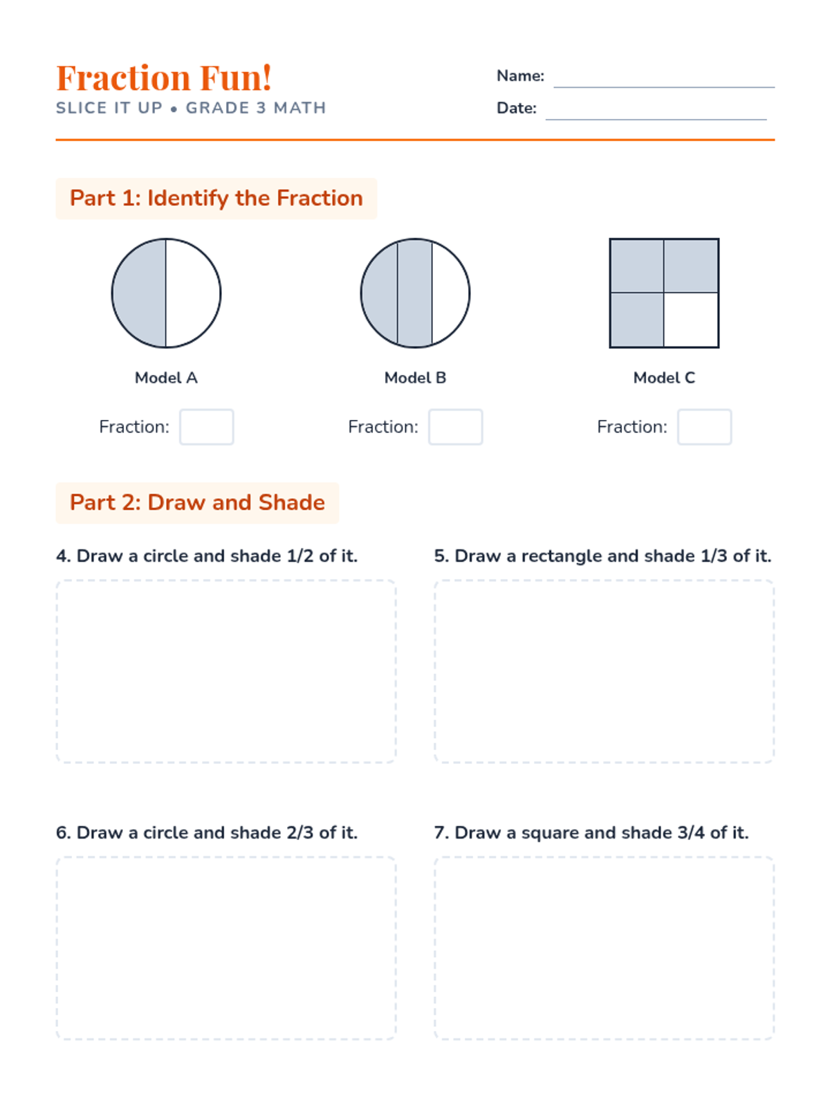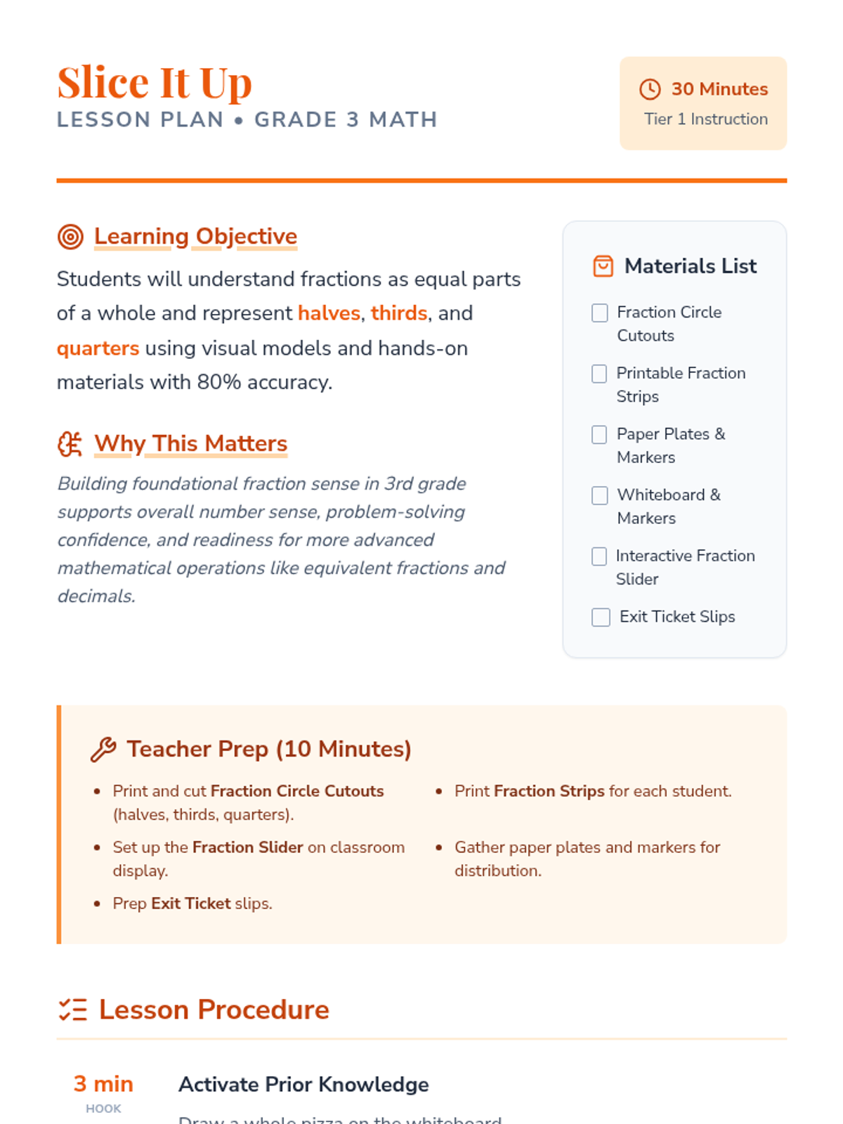 A 30-minute introductory lesson for 3rd graders on identifying and creating basic fractions (halves, thirds, and quarters) through hands-on models and visual exploration.