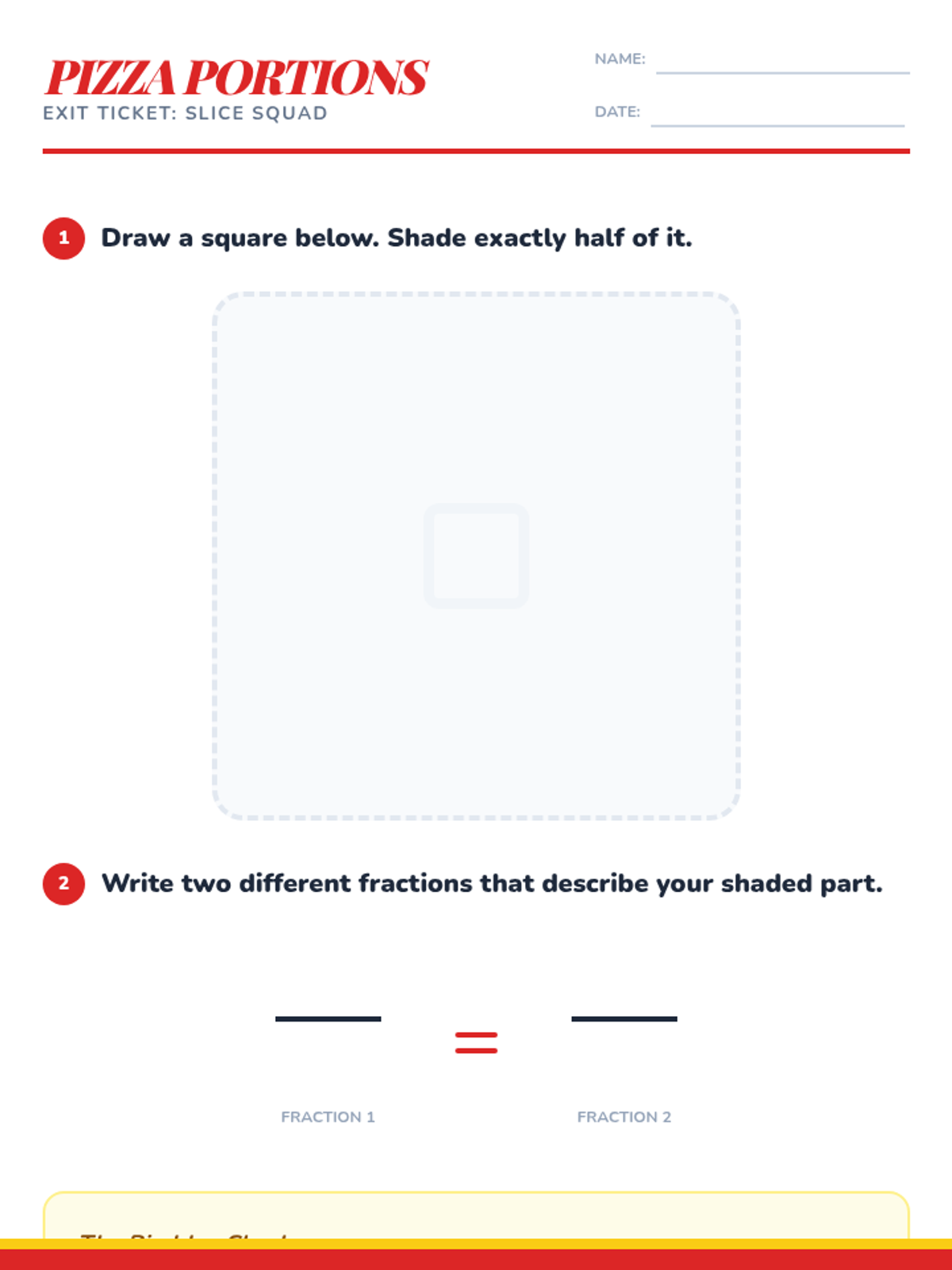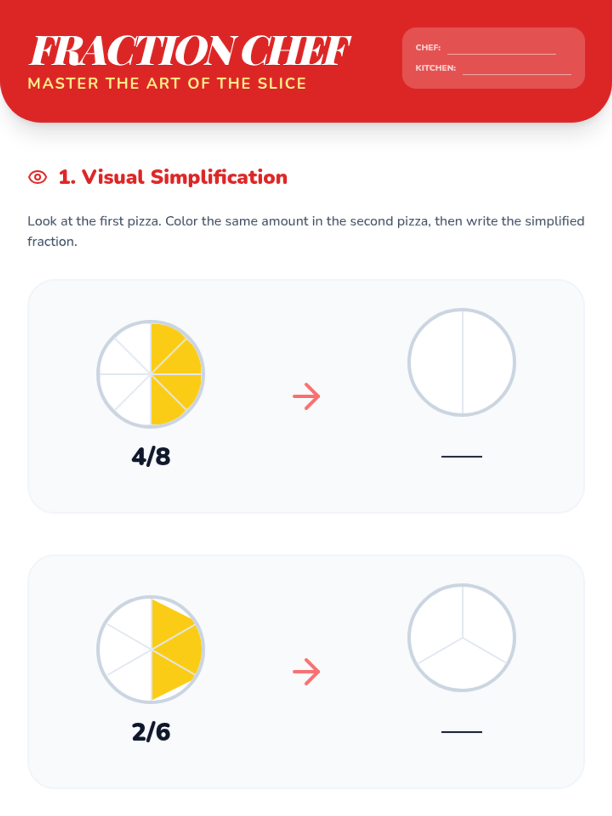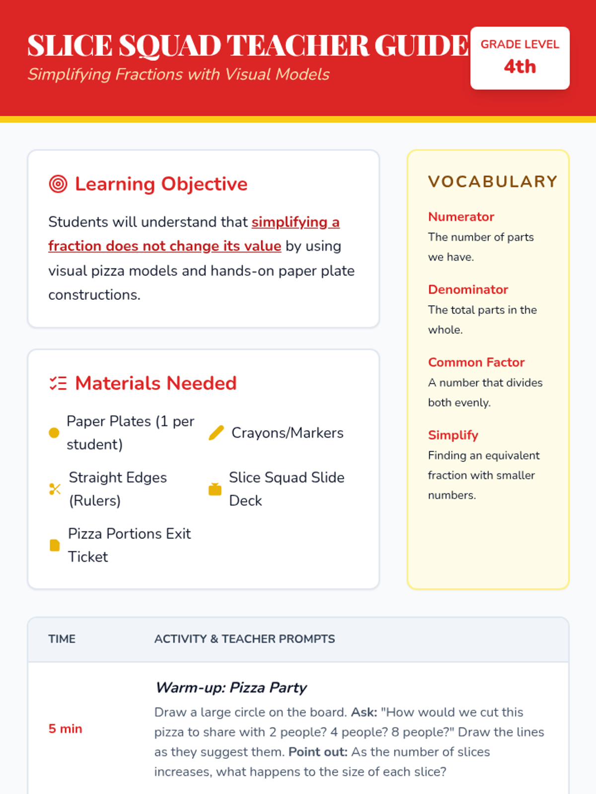 Students explore equivalent fractions and simplification through a pizza-themed lens, using visual models, a catchy rap video, and hands-on paper plate activities to understand that the value remains the same even when the numbers change.