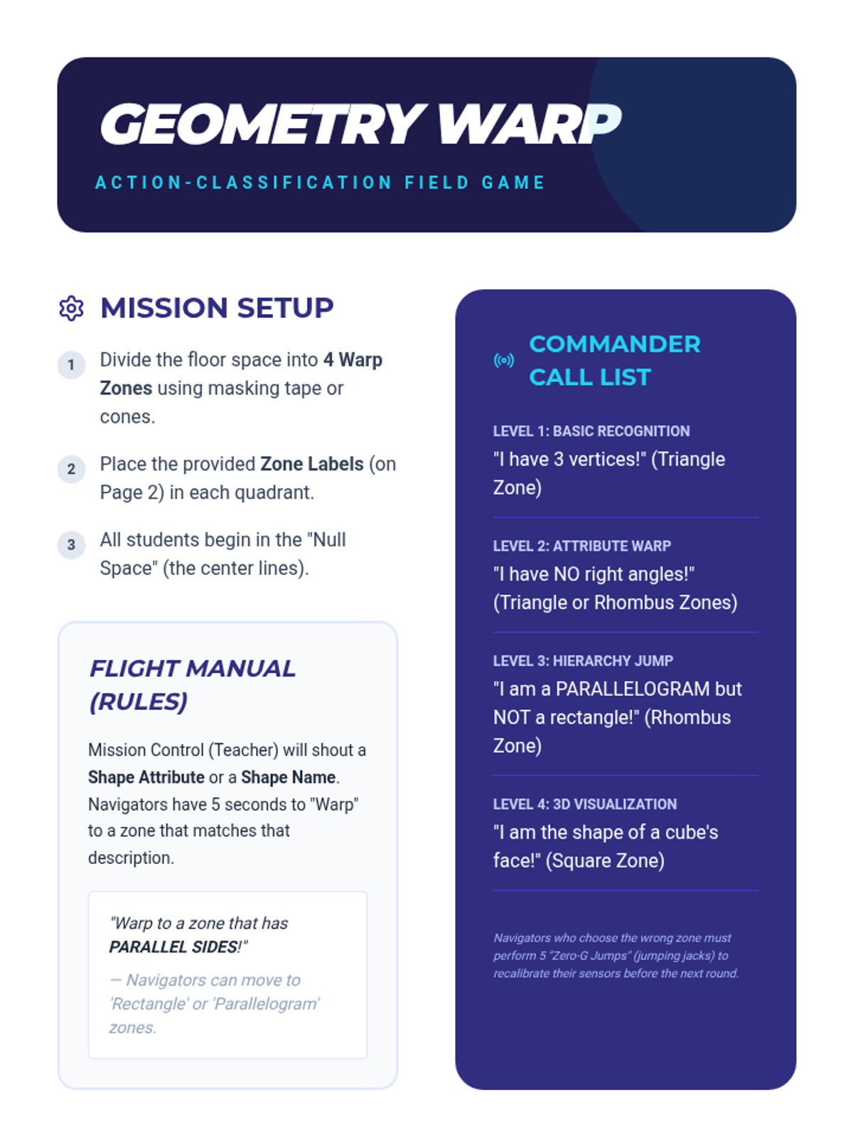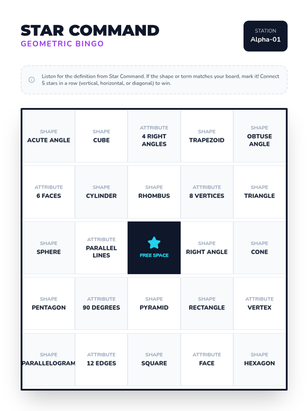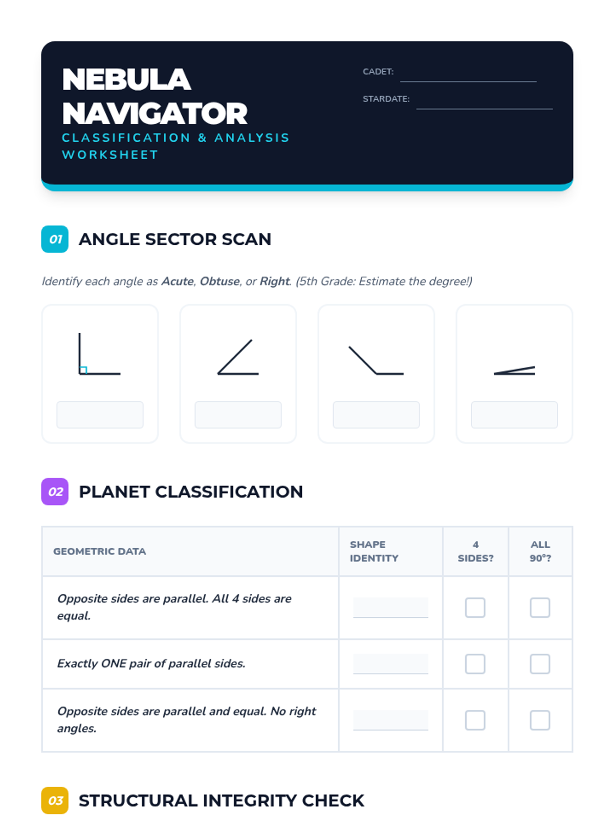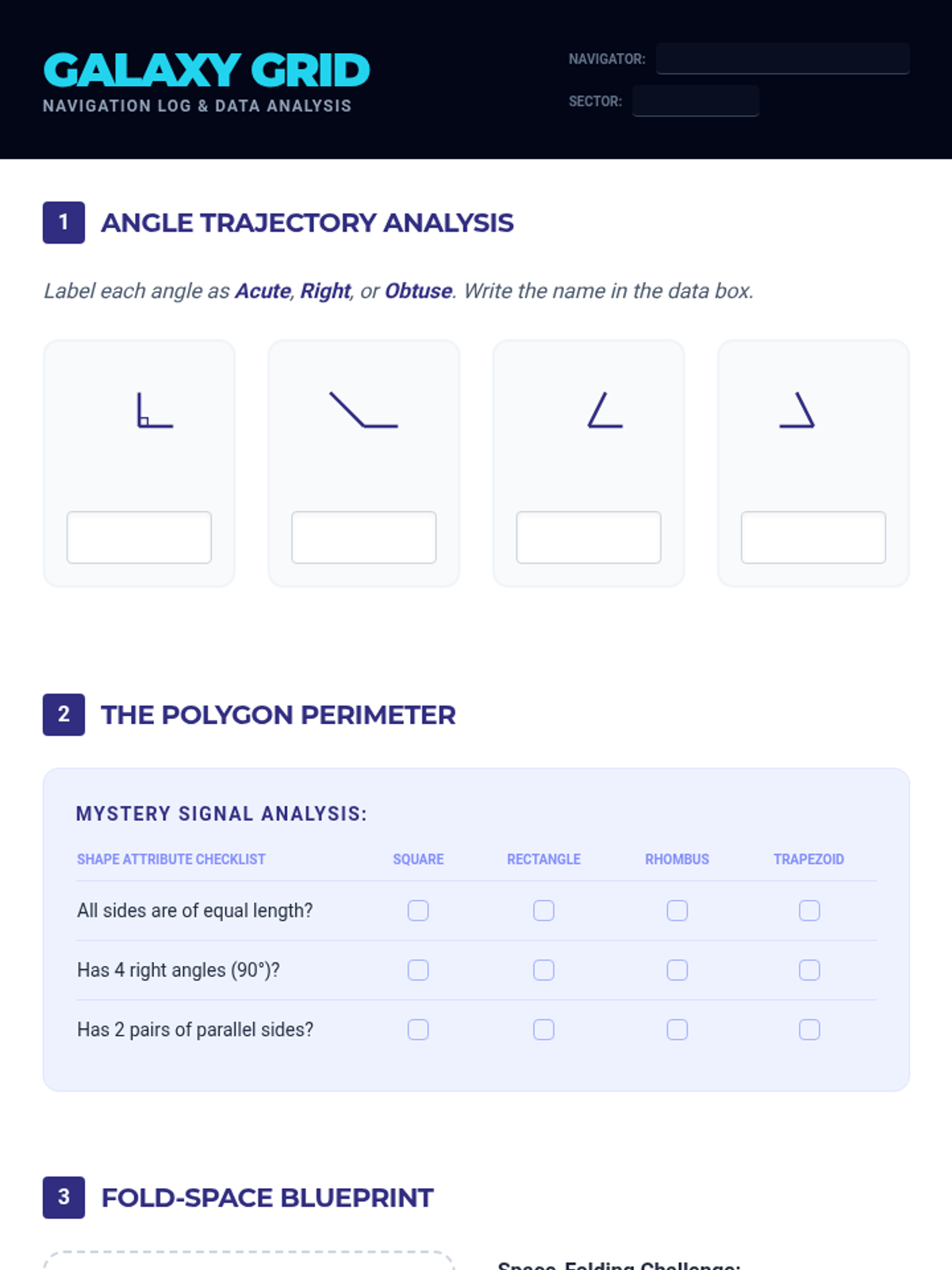 A comprehensive geometry lesson that explores 2D and 3D shapes and angles through a space exploration lens, designed for 3rd and 5th-grade students. Students will navigate the 'Geometry Galaxy' to identify, classify, and build geometric figures using spatial reasoning.