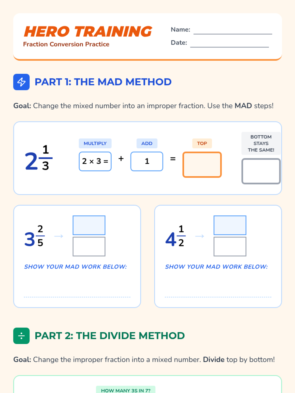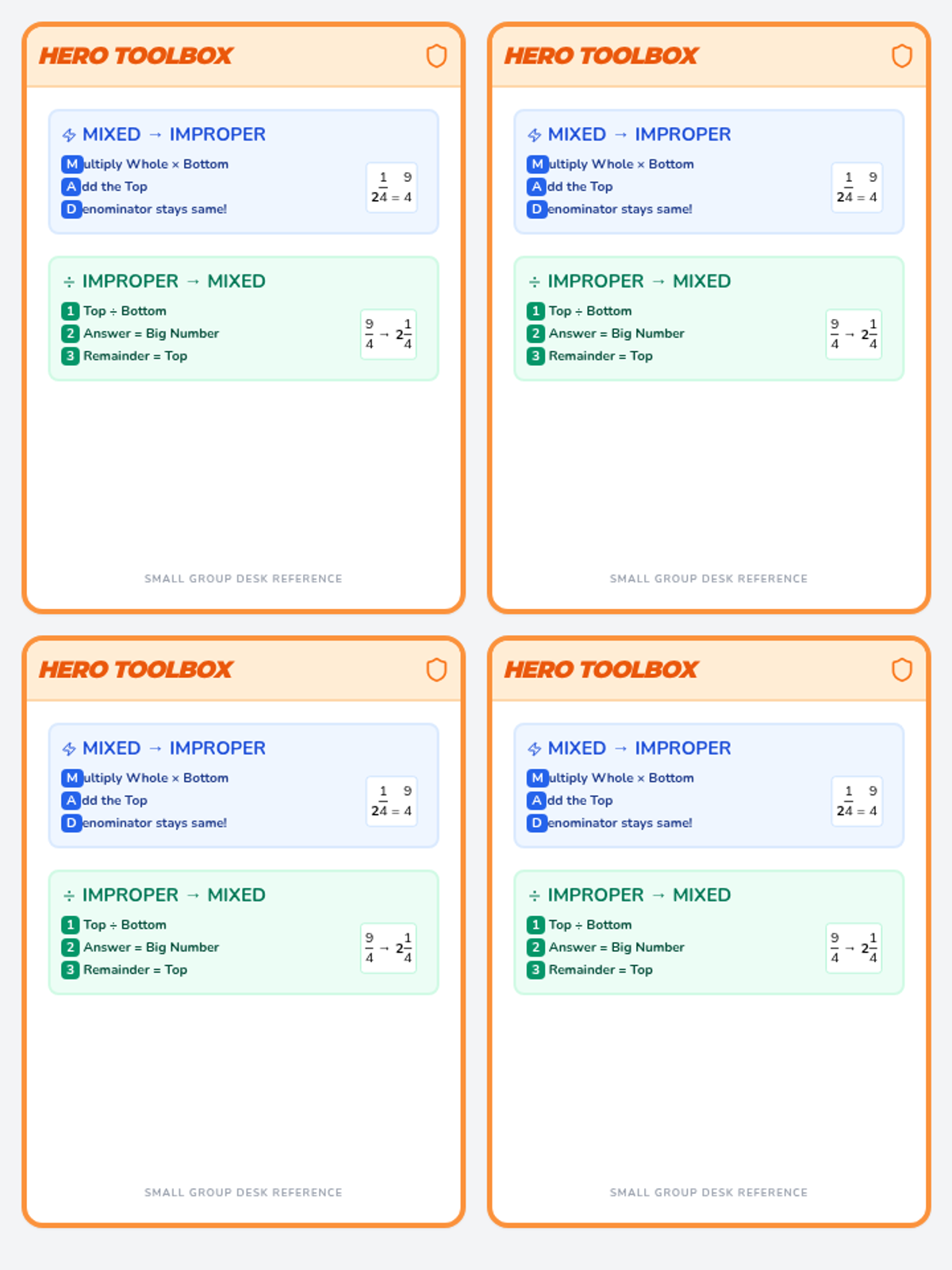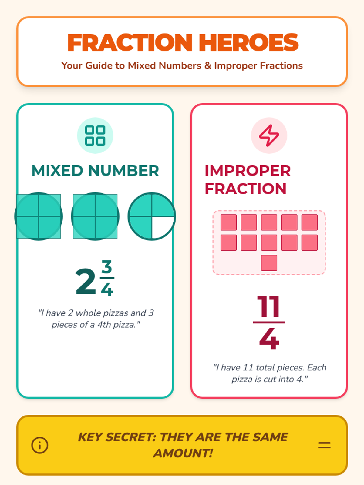 Tier 2 intervention materials for students needing extra support with mixed numbers and improper fractions. This lesson provides visual scaffolds, simplified language for struggling readers, and hands-on practice activities to reinforce foundational fraction concepts.