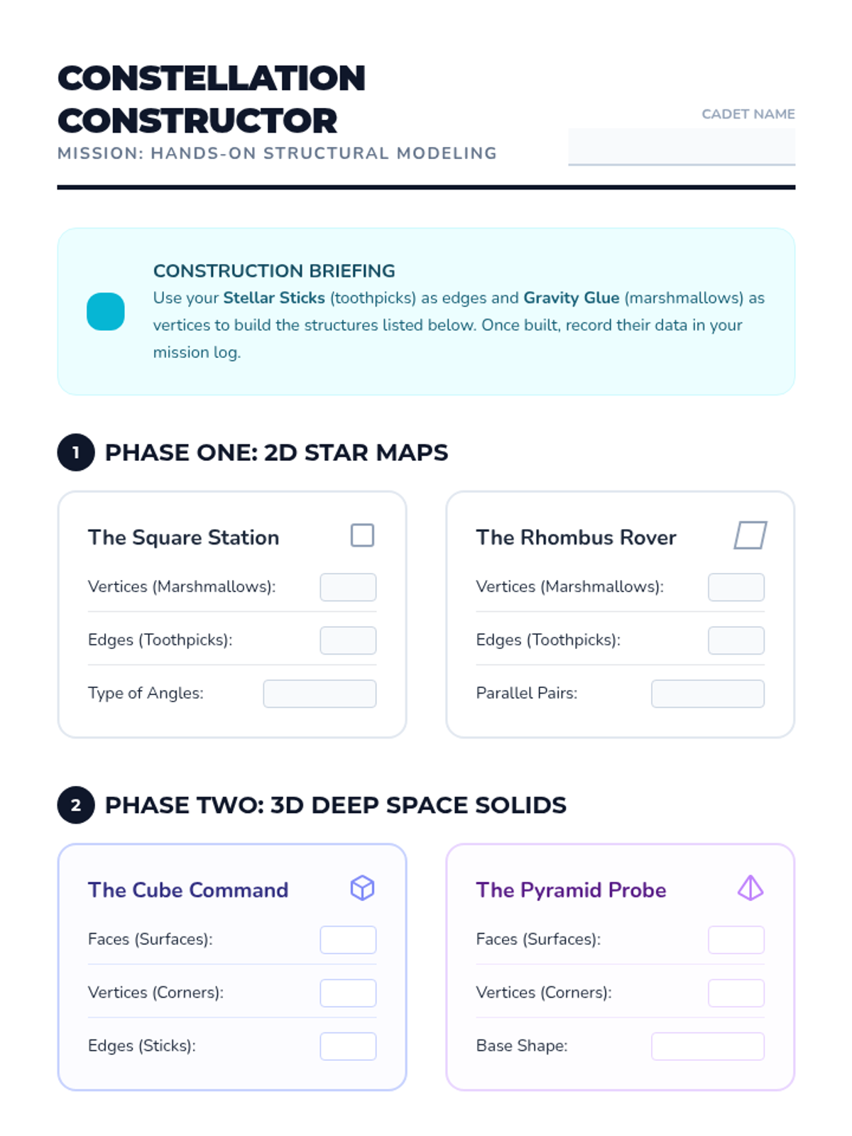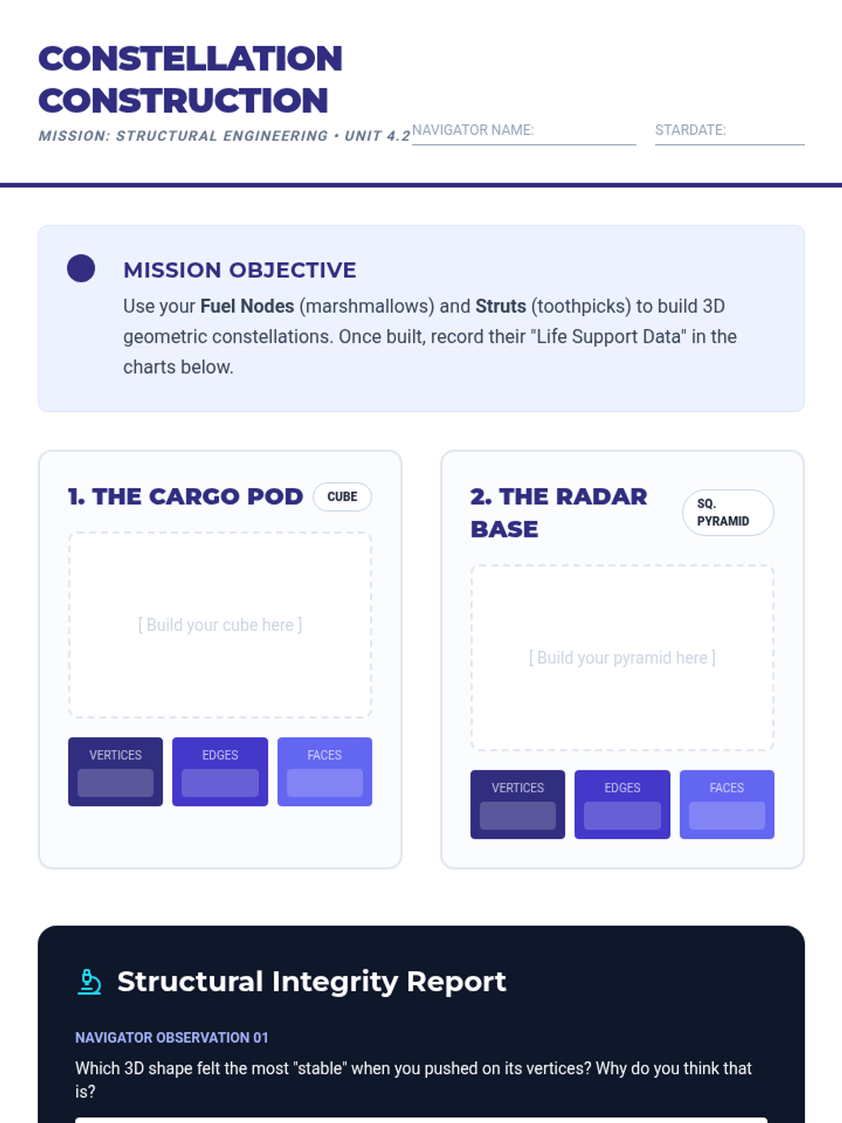 A comprehensive geometry lesson exploring 2D and 3D shapes, properties, and angles through a space-themed mission. Students engage in classification, modeling, and spatial reasoning to master geometric concepts.