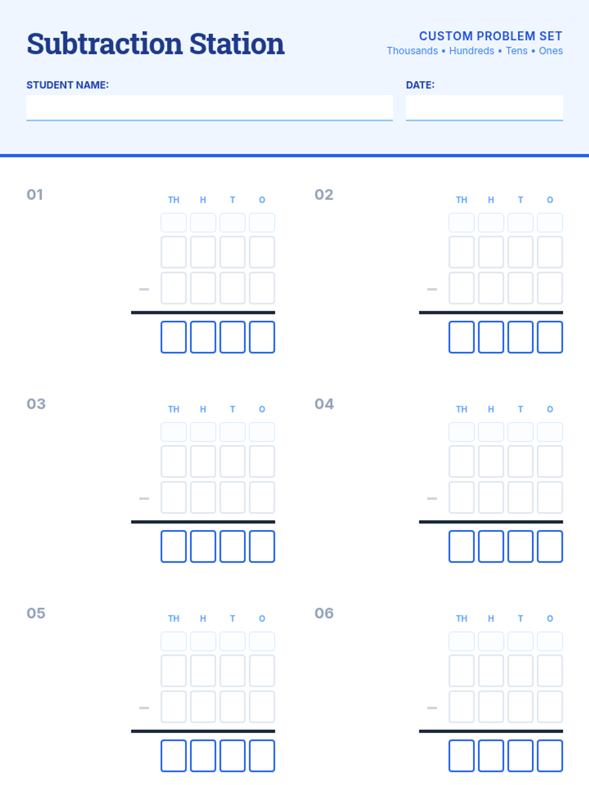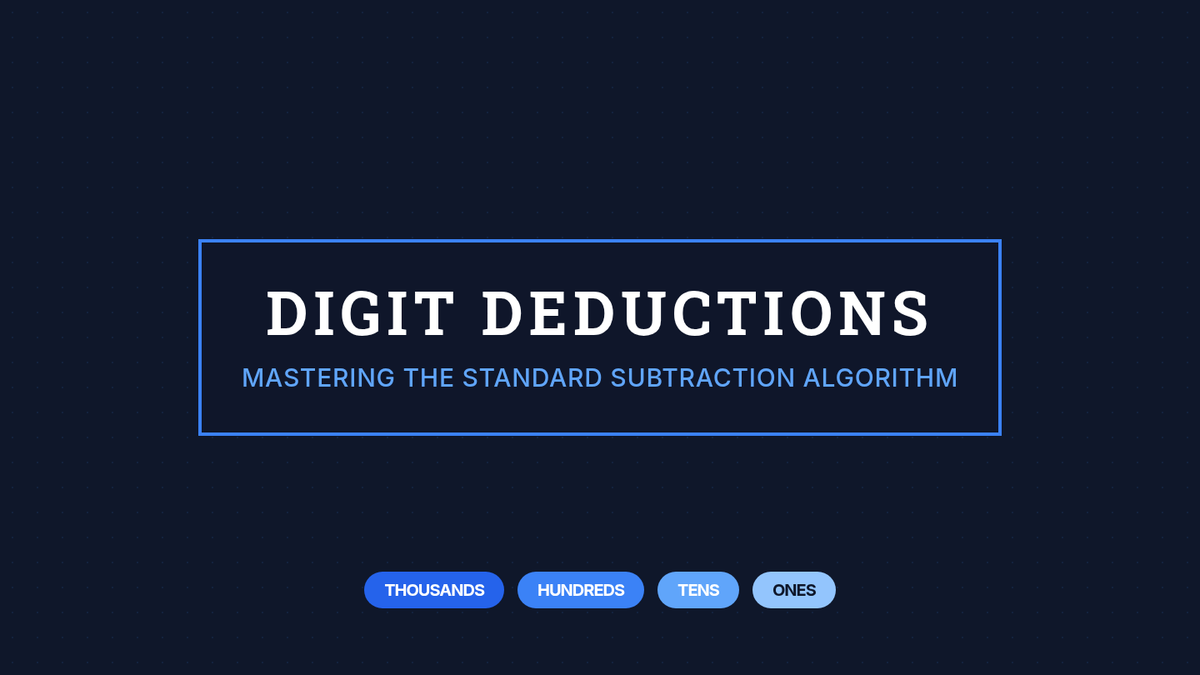 A comprehensive lesson on mastering the US standard subtraction algorithm up to the thousands place using structured grids and visual guides.