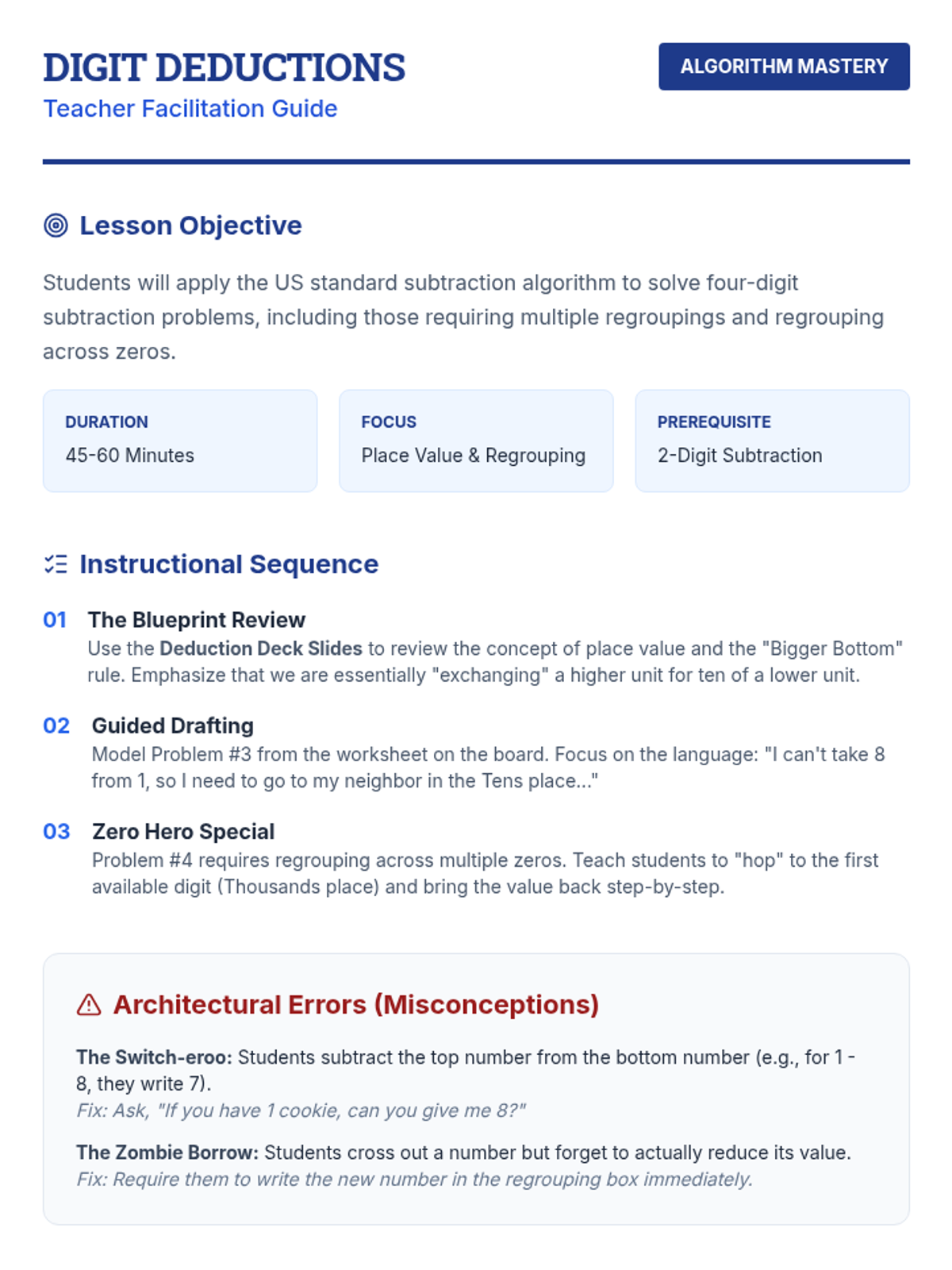 Addresses the specific challenge of regrouping when the minuend contains one or more zeros. Students learn the 'Middle Man' strategy to pass value from the hundreds place through the tens to the ones.