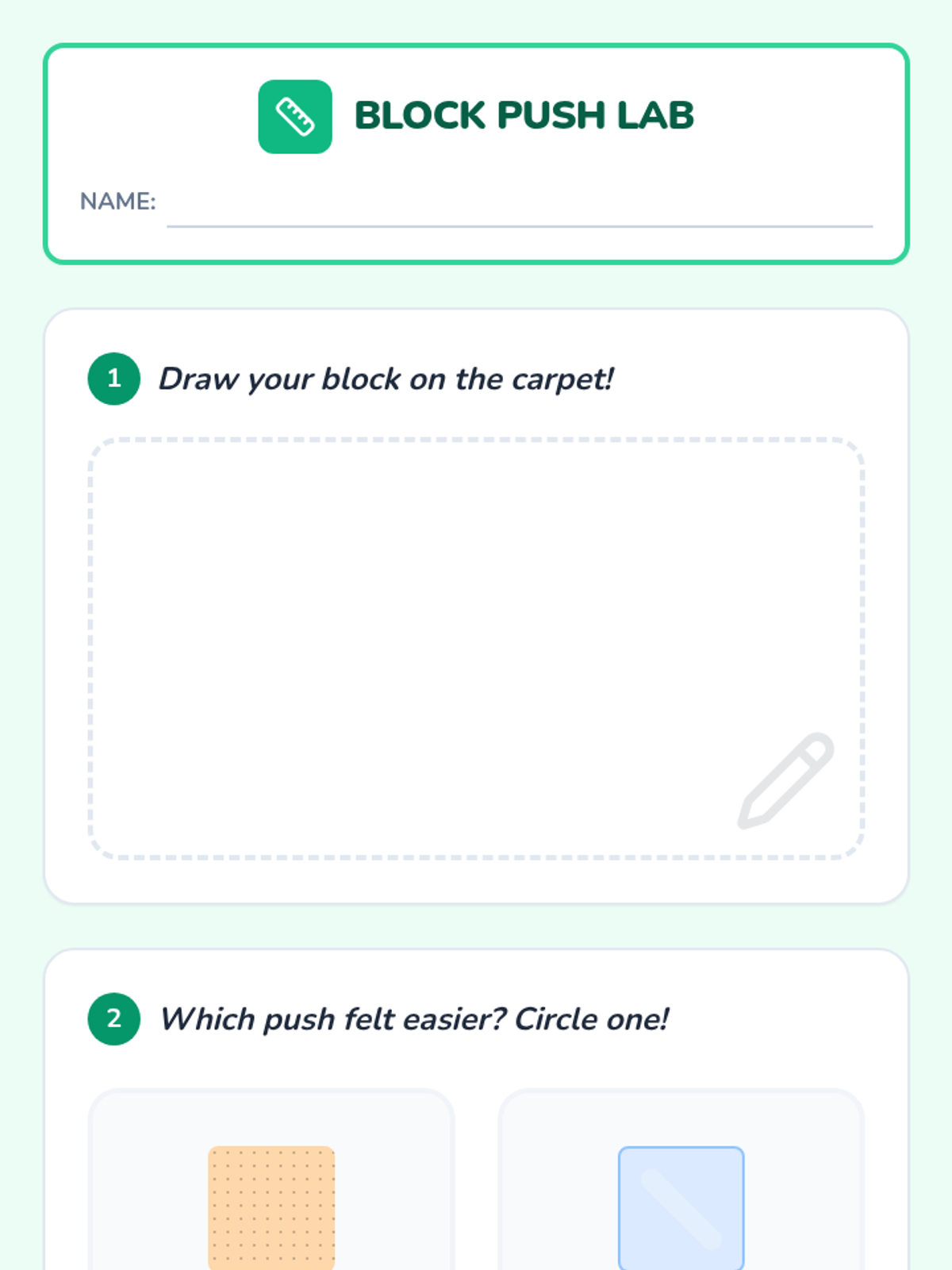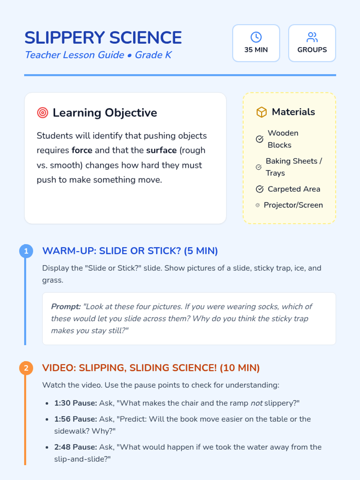 A hands-on Kindergarten science lesson introducing the concepts of force and friction through sliding experiments and a real-world video connection.