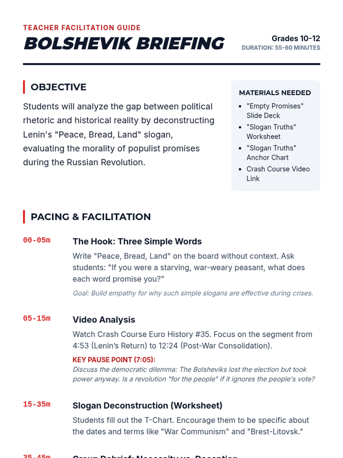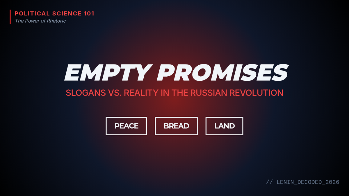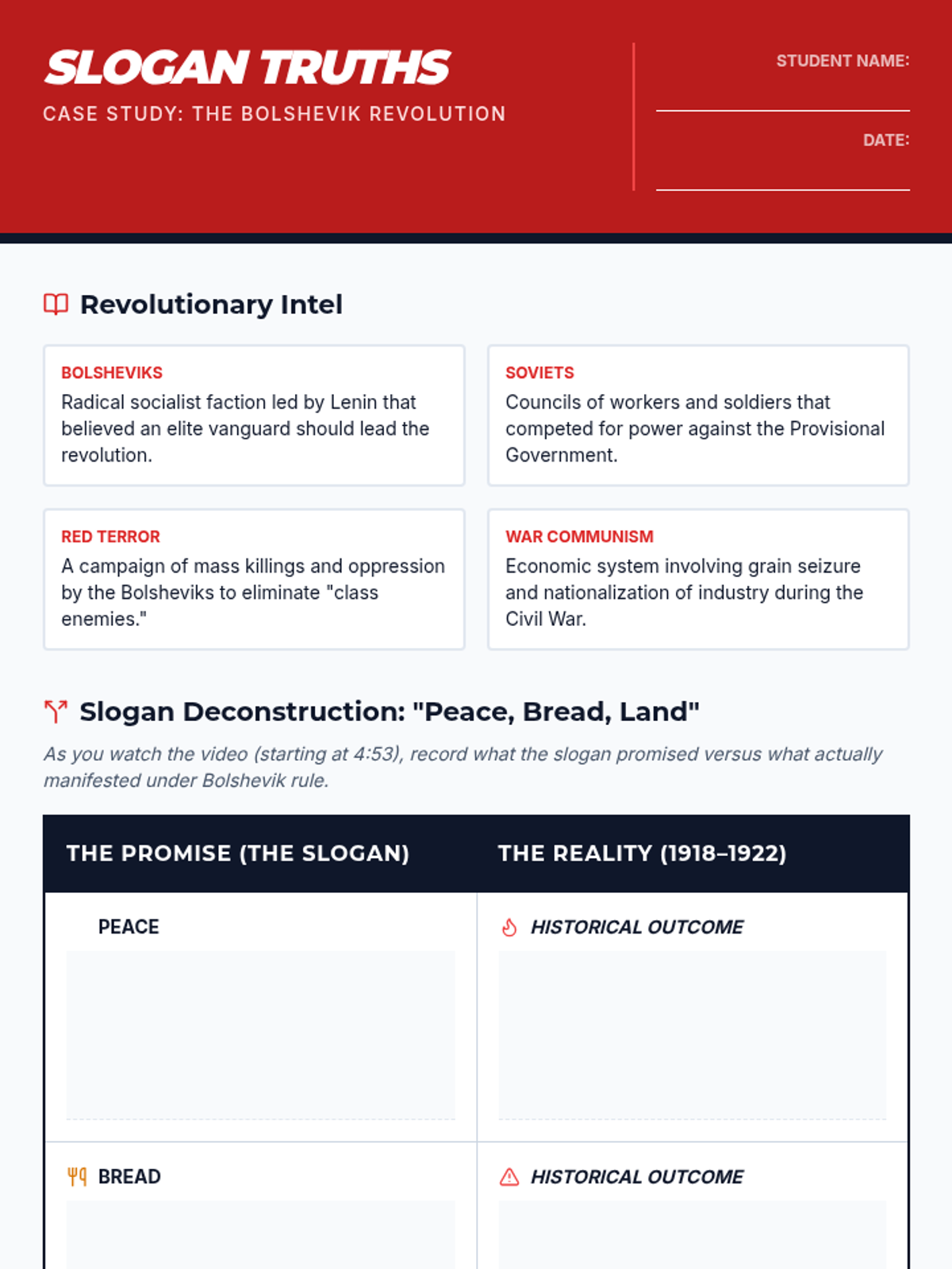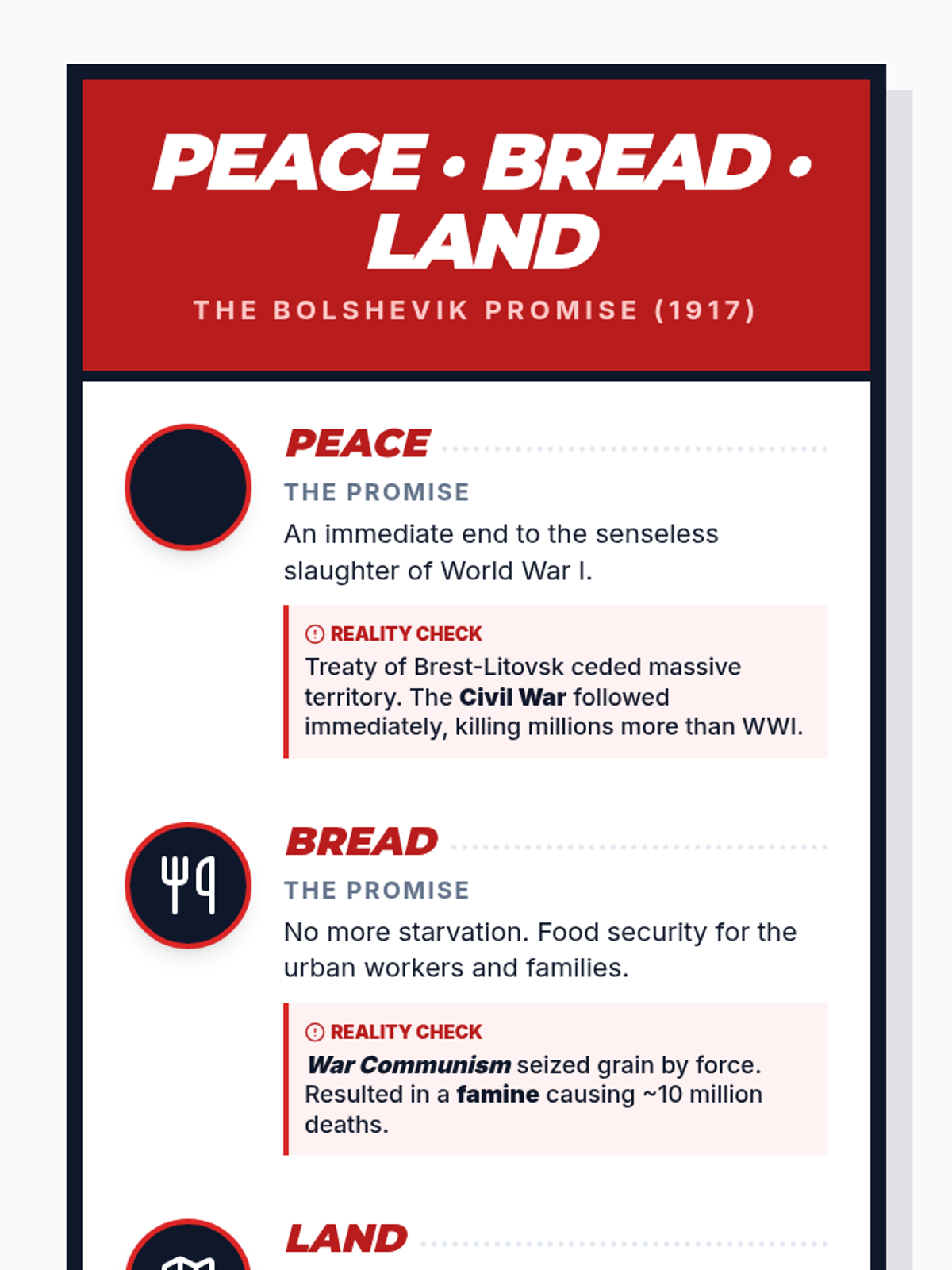 A deep dive into the rhetoric vs. reality of the Russian Revolution, specifically analyzing Lenin's 'Peace, Bread, Land' slogan and the subsequent Civil War and famine. Students evaluate the morality and effectiveness of populist slogans in political movements.