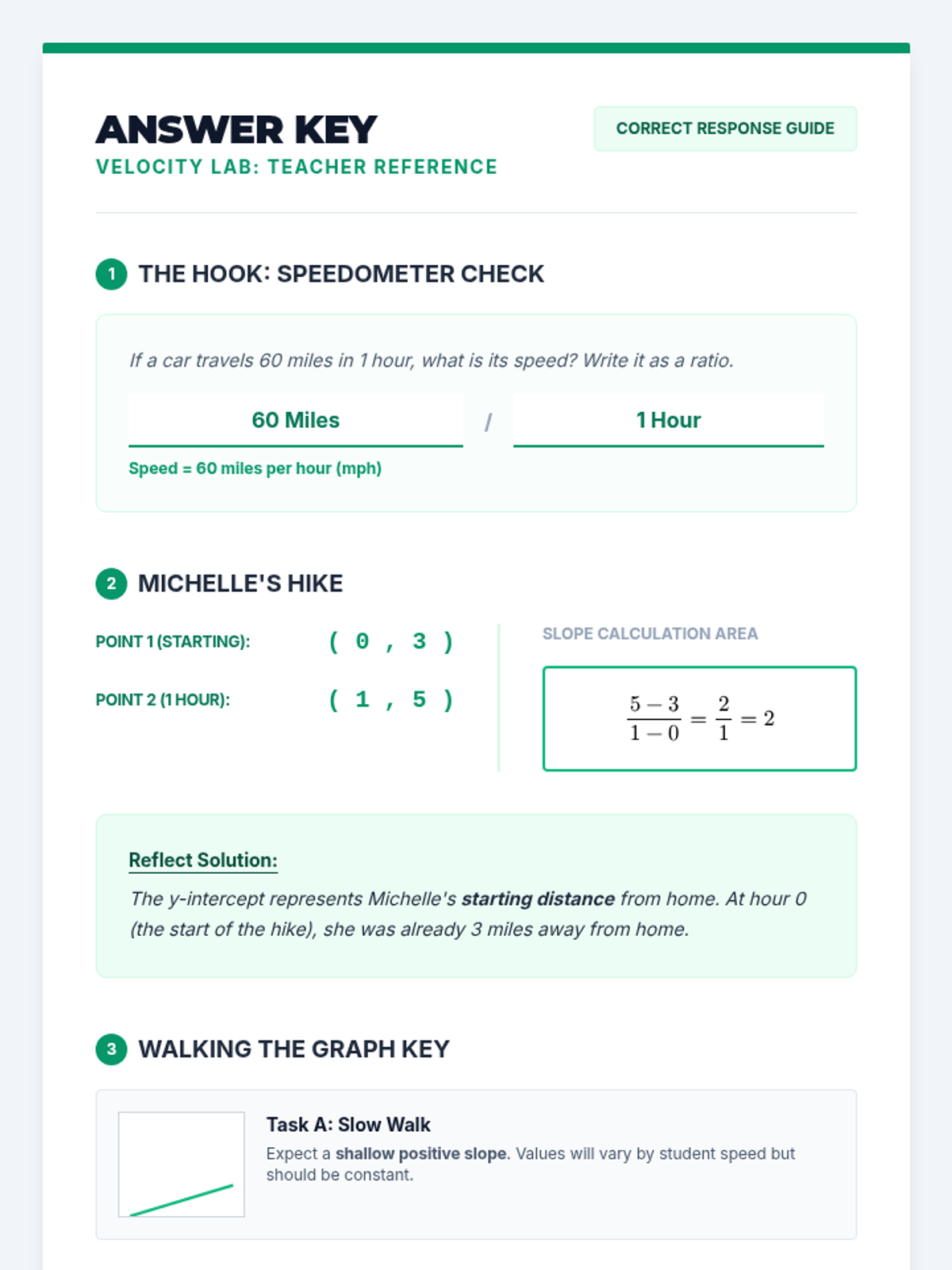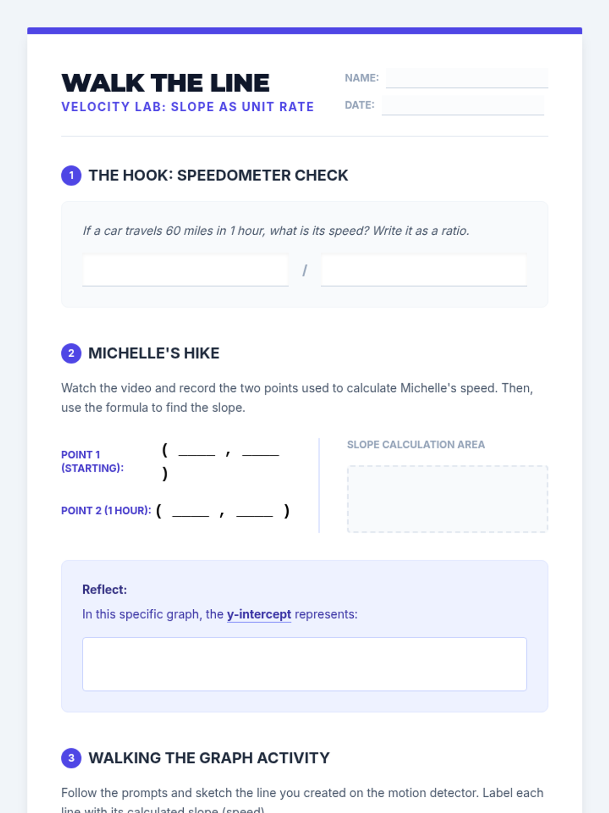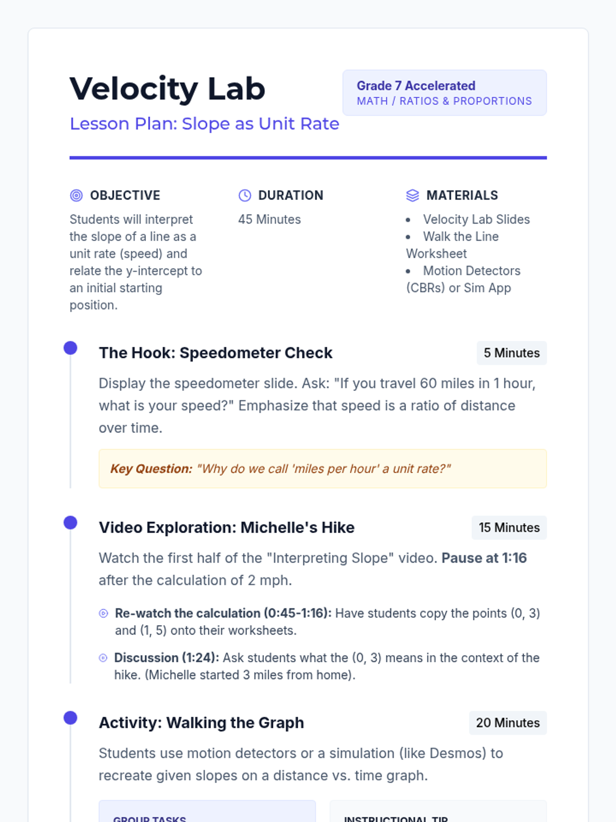 An introduction to slope as a unit rate for 7th grade accelerated math, featuring a video-based exploration of Michelle's hike and a 'Walking the Graph' motion detection activity.
