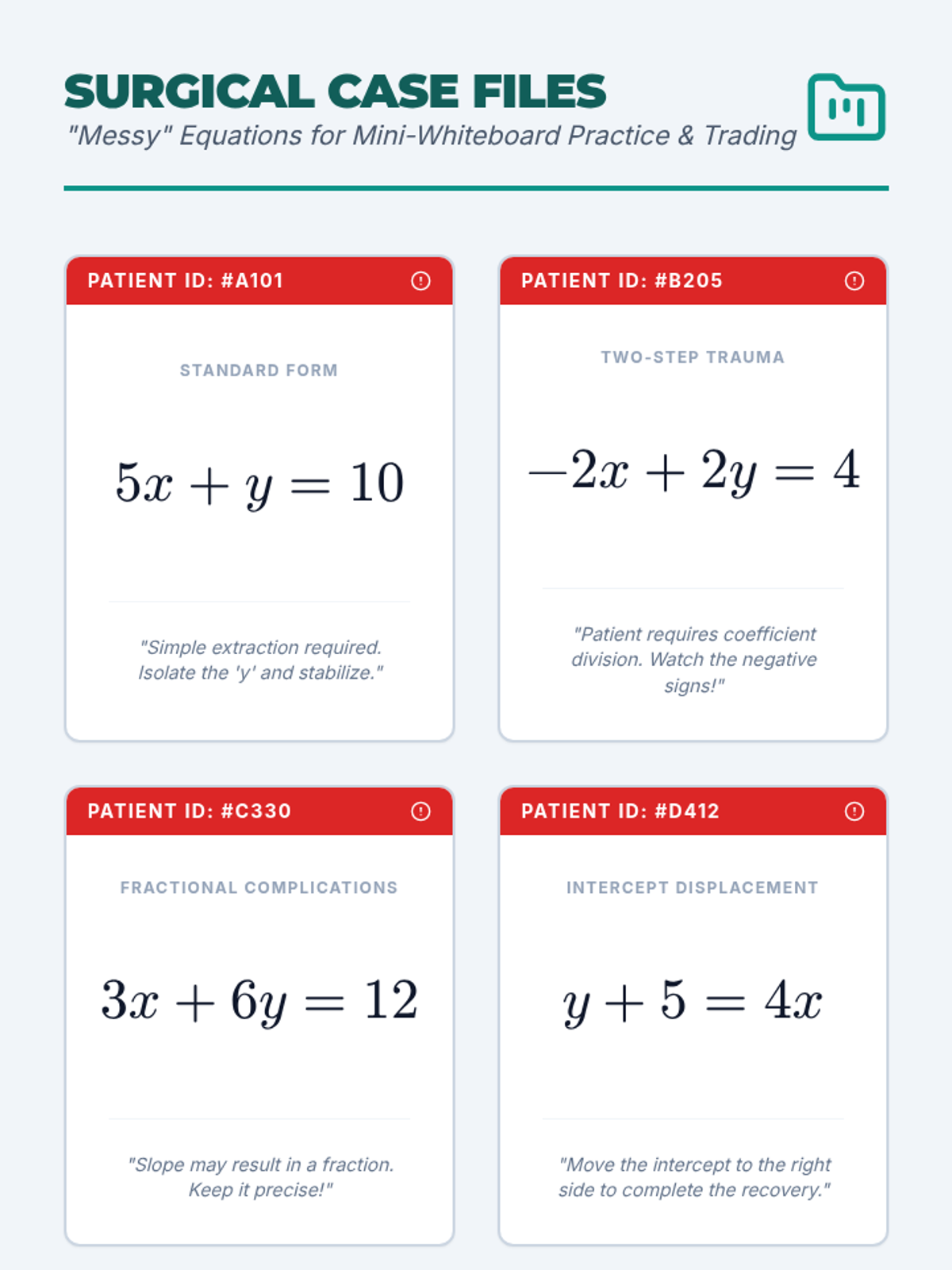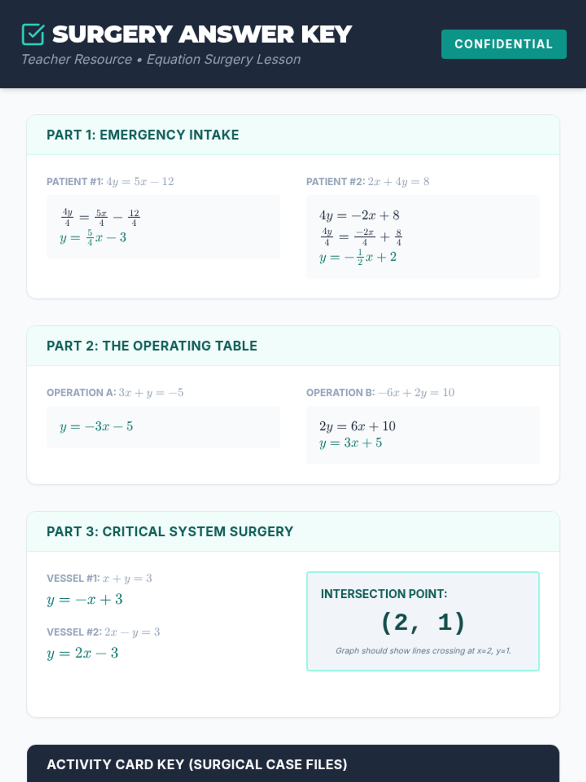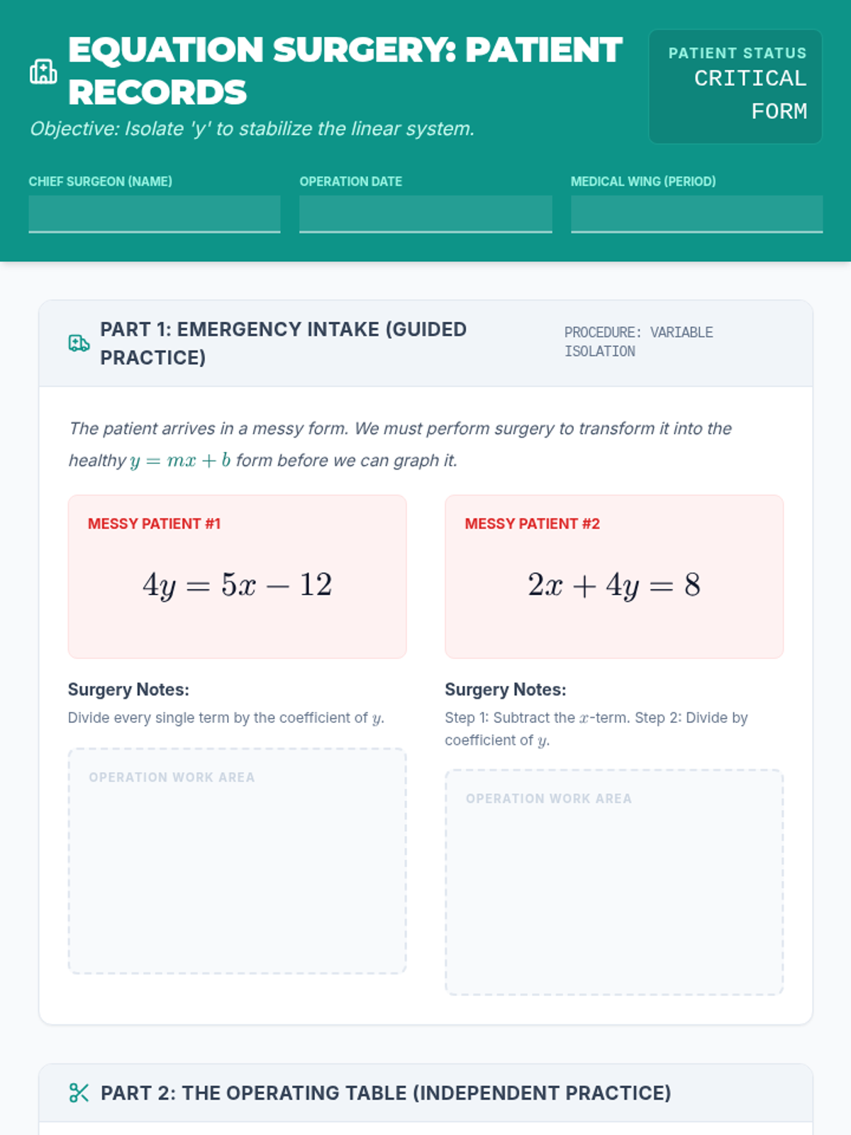 Students will learn to transform linear equations from standard and other forms into slope-intercept form ($y=mx+b$) to efficiently solve systems of equations by graphing. This lesson uses a 'surgical' theme to guide students through the algebraic steps of isolating variables.