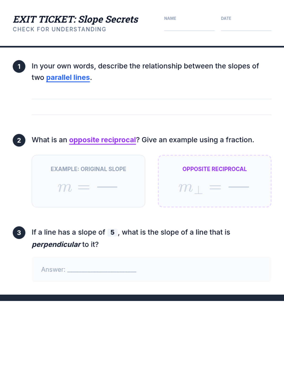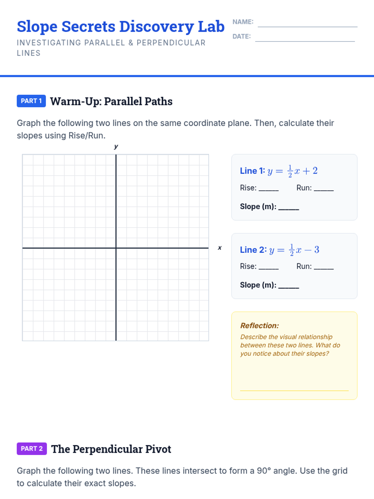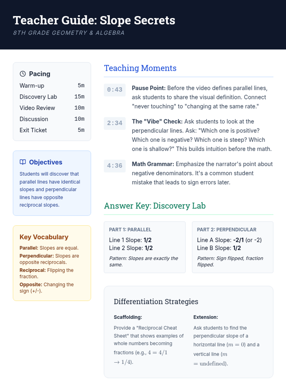 Students discover the relationship between slopes of parallel and perpendicular lines through manual graphing, calculation, and video analysis. The lesson emphasizes the concept of 'same slope' for parallel lines and 'opposite reciprocals' for perpendicular lines.