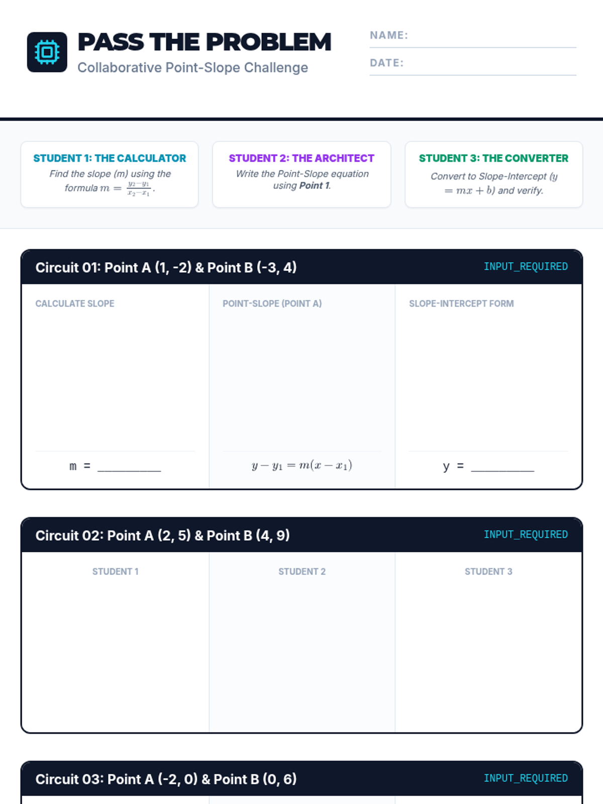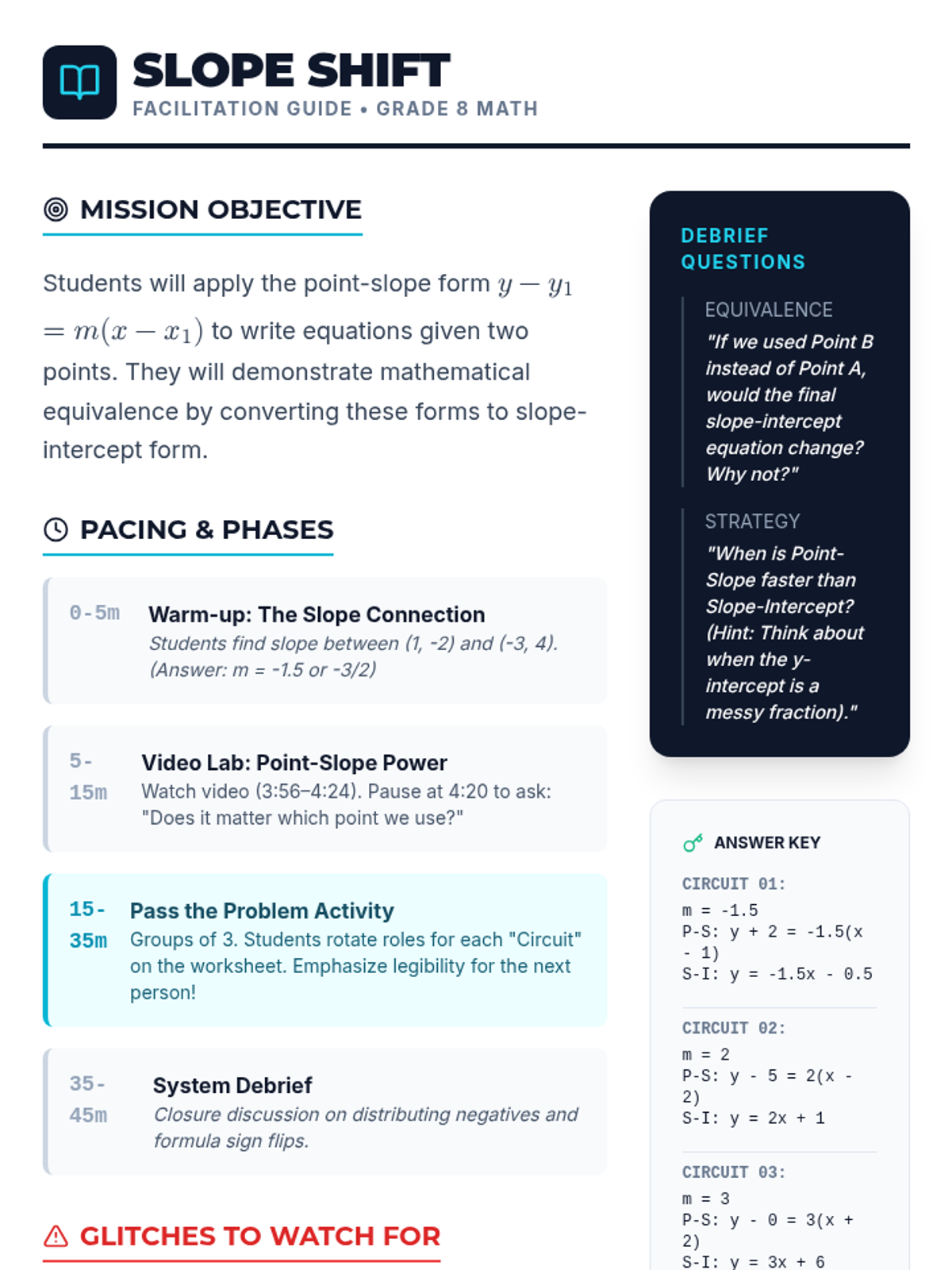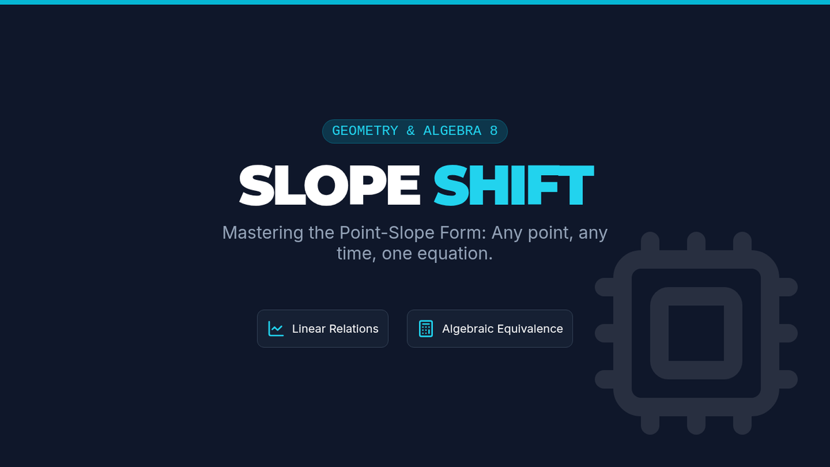 Students will master the point-slope form by calculating slope from two points and proving equivalence through a collaborative 'Pass the Problem' activity. The lesson emphasizes the flexibility of the form and its connection to slope-intercept form.