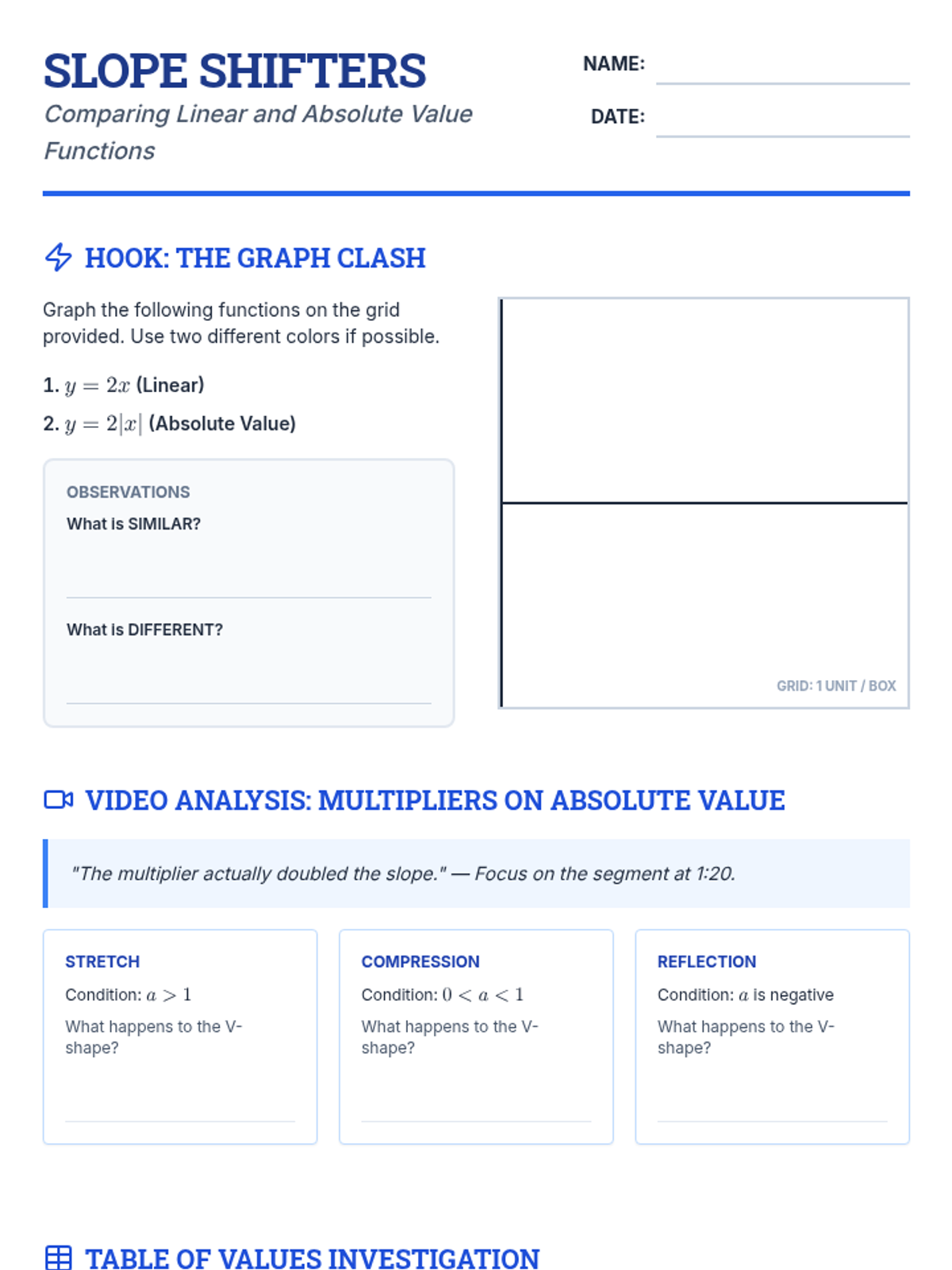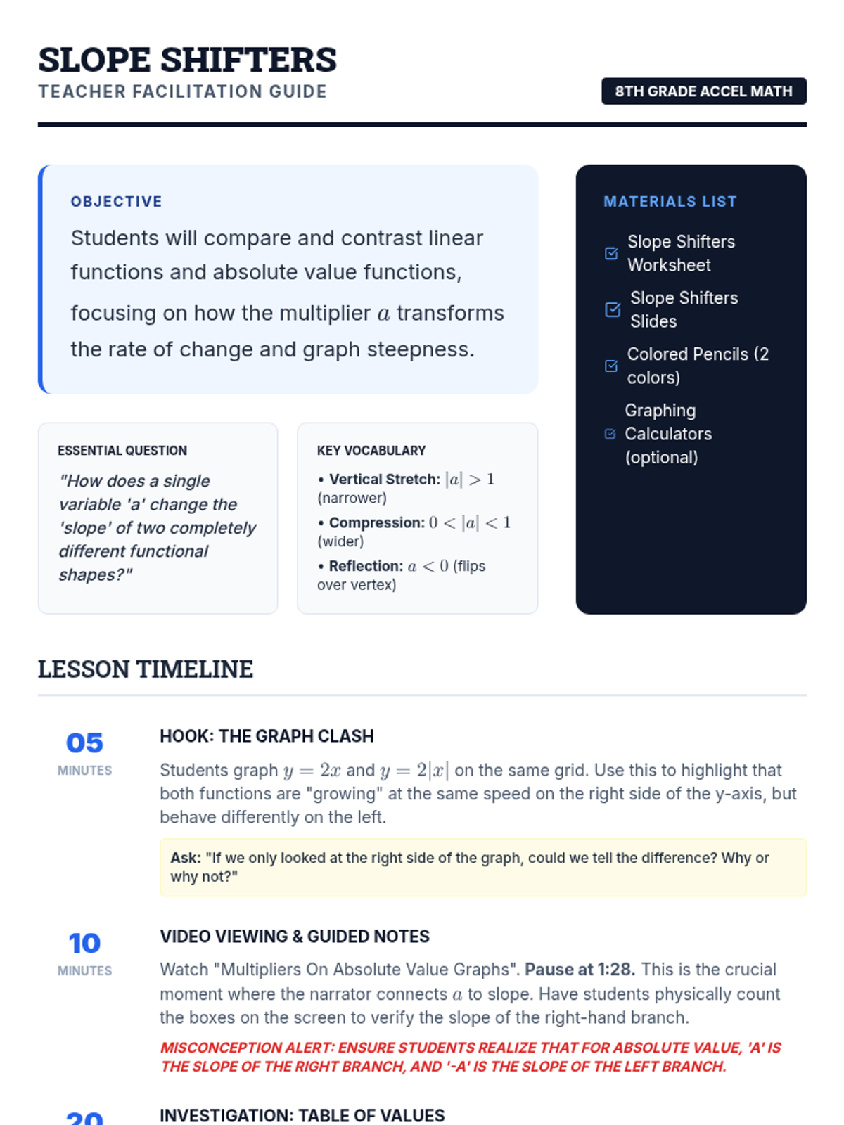 This lesson explores the relationship between linear functions and absolute value functions, focusing on how the multiplier 'a' affects the rate of change and slope of the graphs. Students will use tables of values to investigate vertical stretches and compressions.
