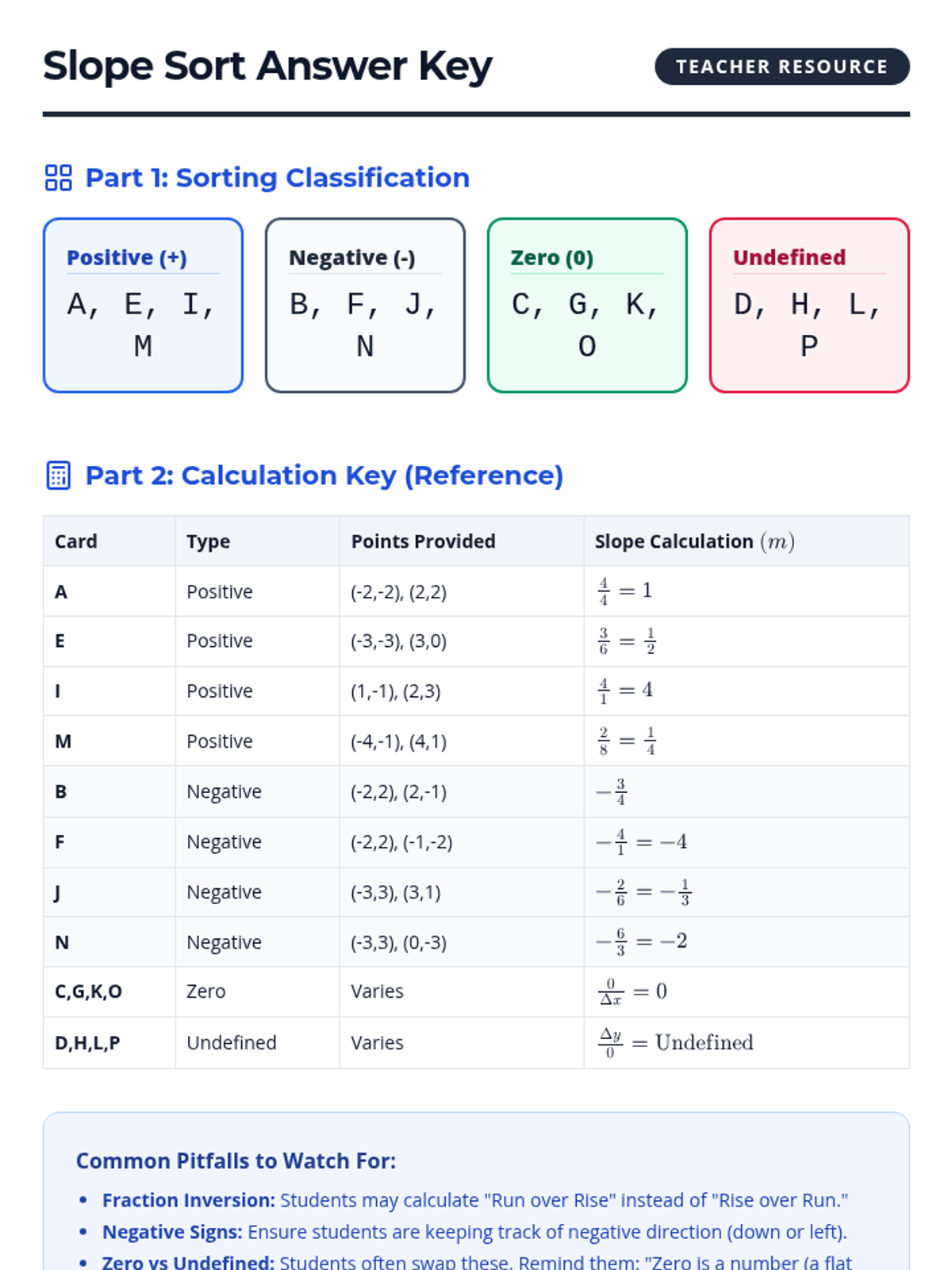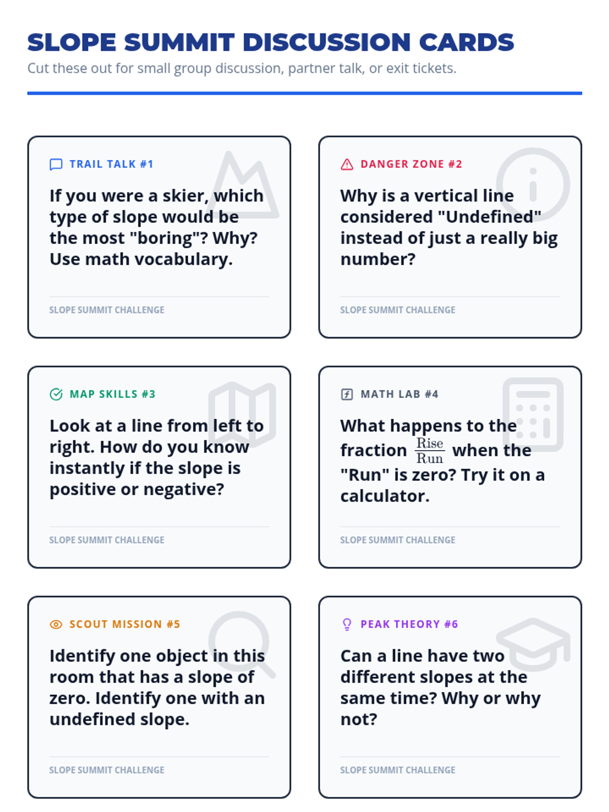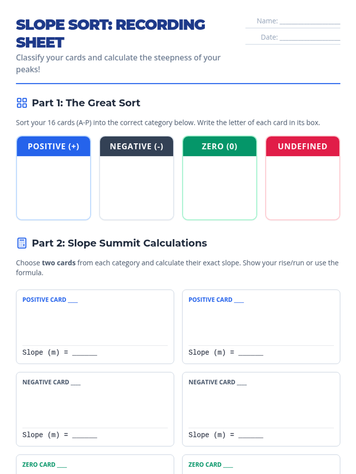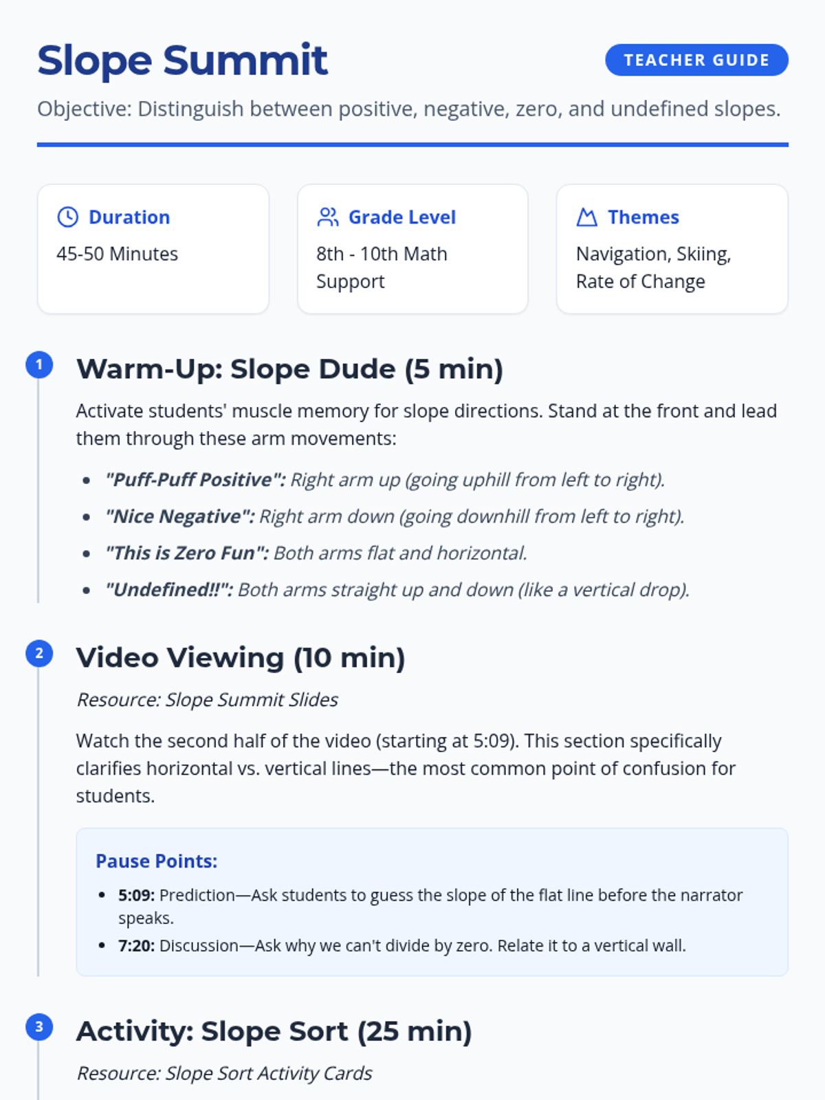A comprehensive lesson for 8th-10th grade math support students focused on identifying and calculating positive, negative, zero, and undefined slopes through physical movement, video analysis, and a hands-on sorting activity.