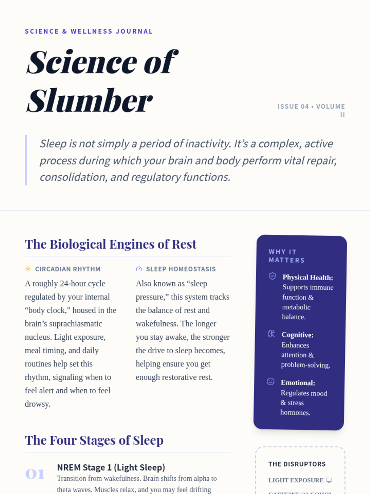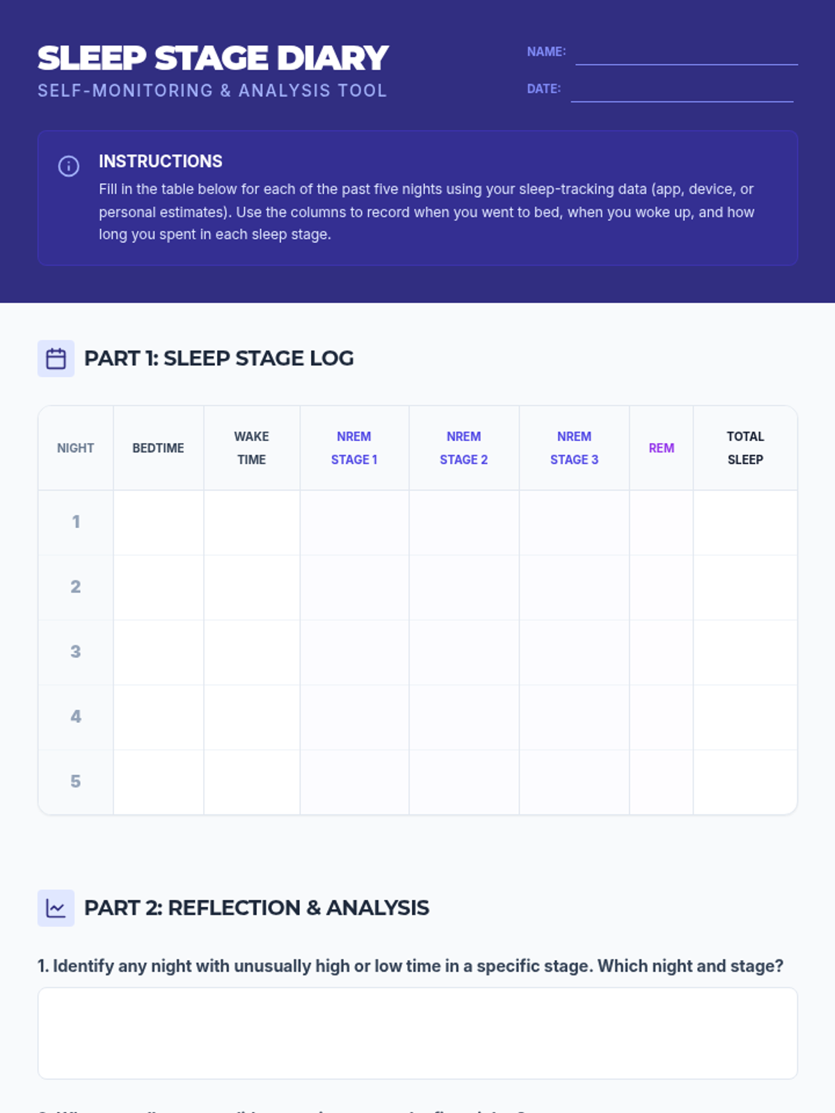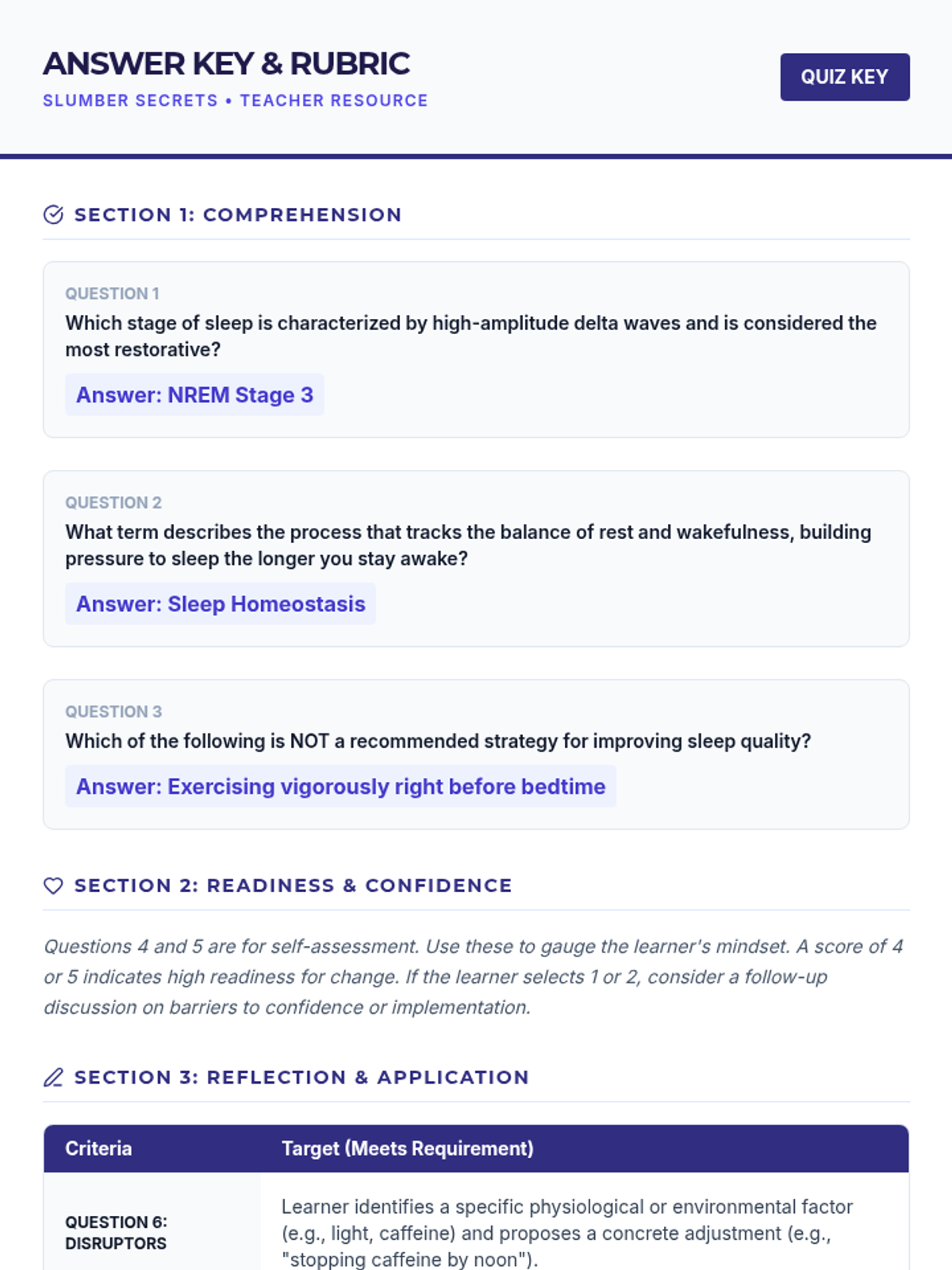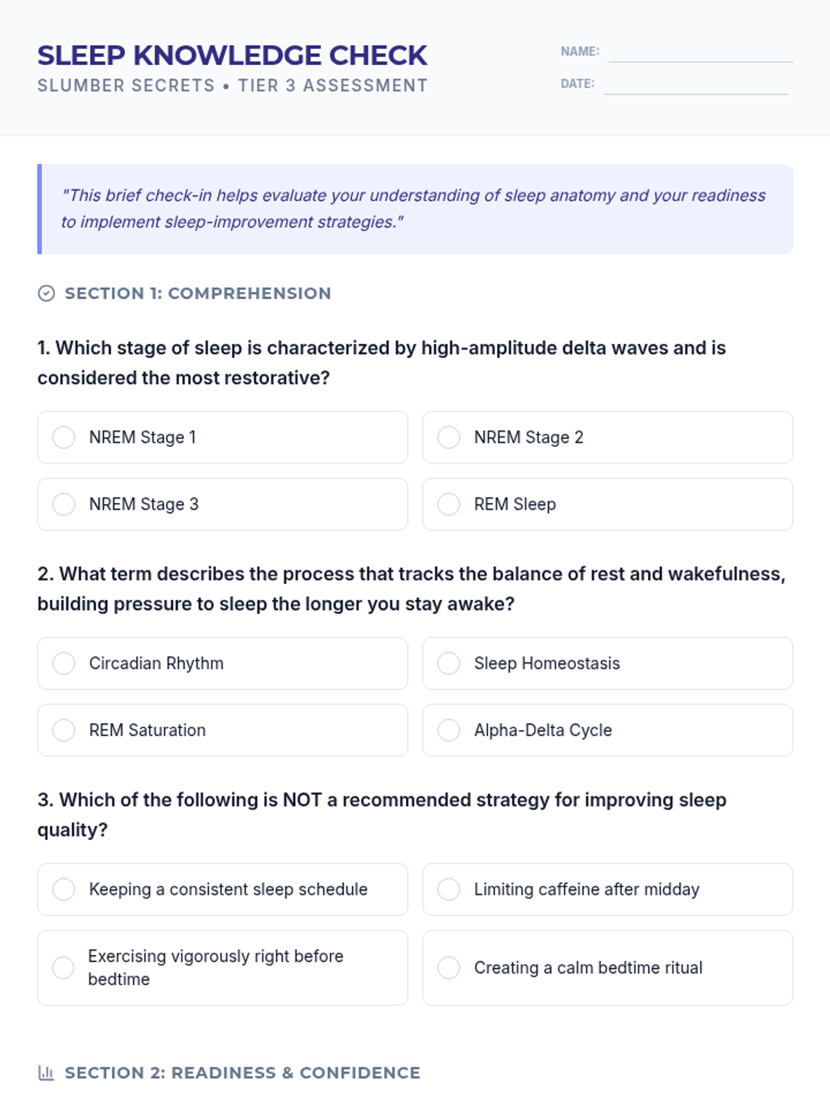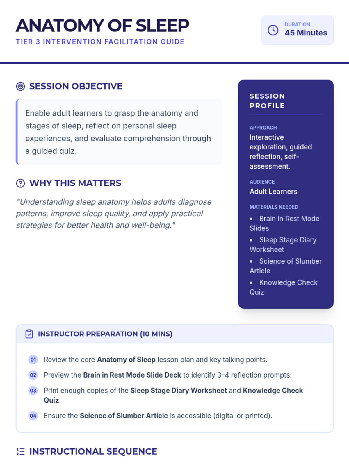 An individualized deep-dive into sleep science fundamentals, tailored reflection prompts, and self-assessment tools for adult learners, designed as a Tier 3 intervention.