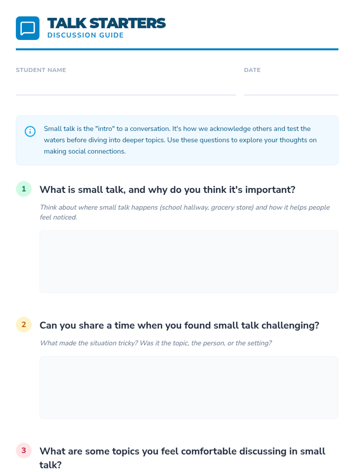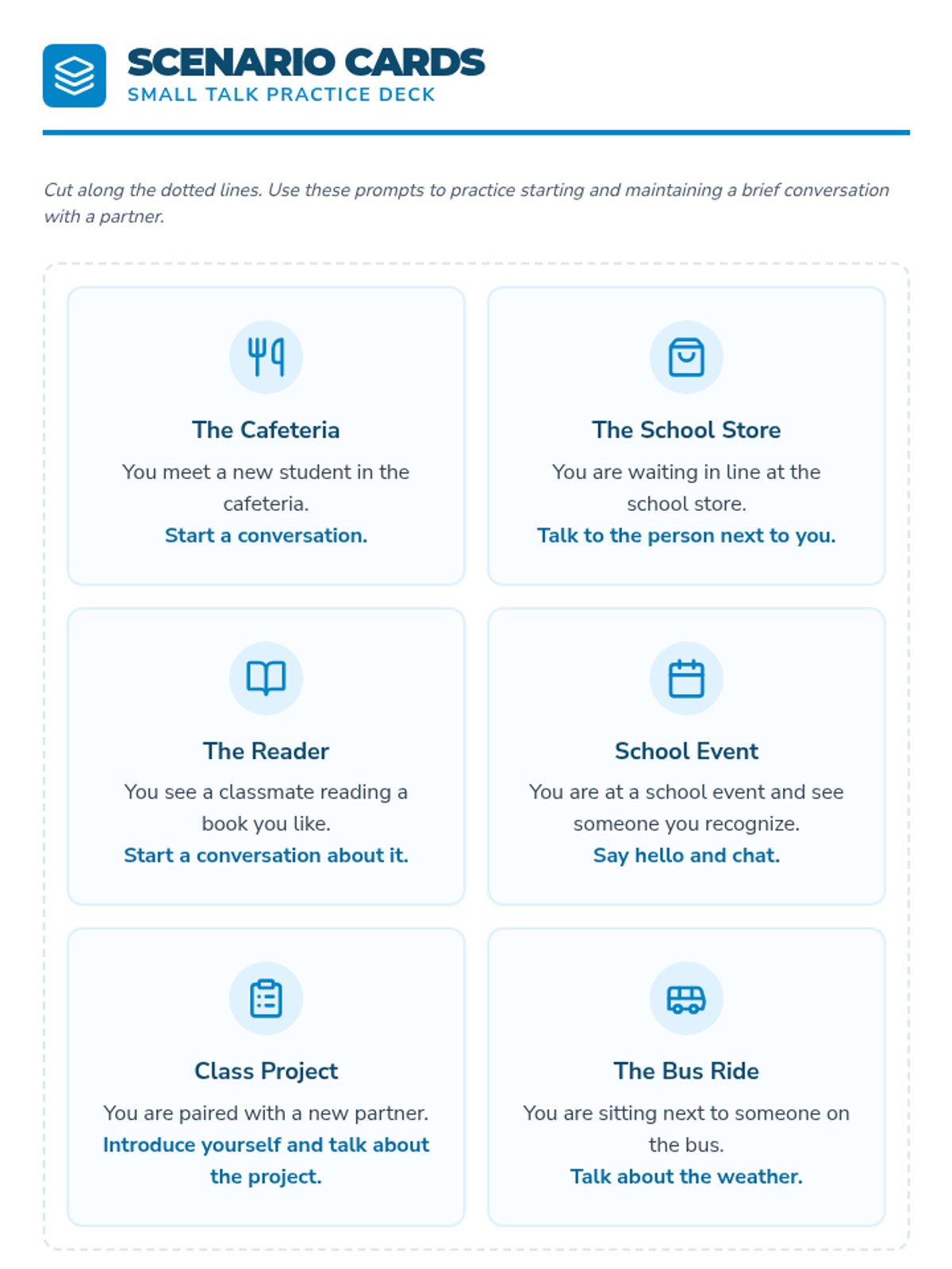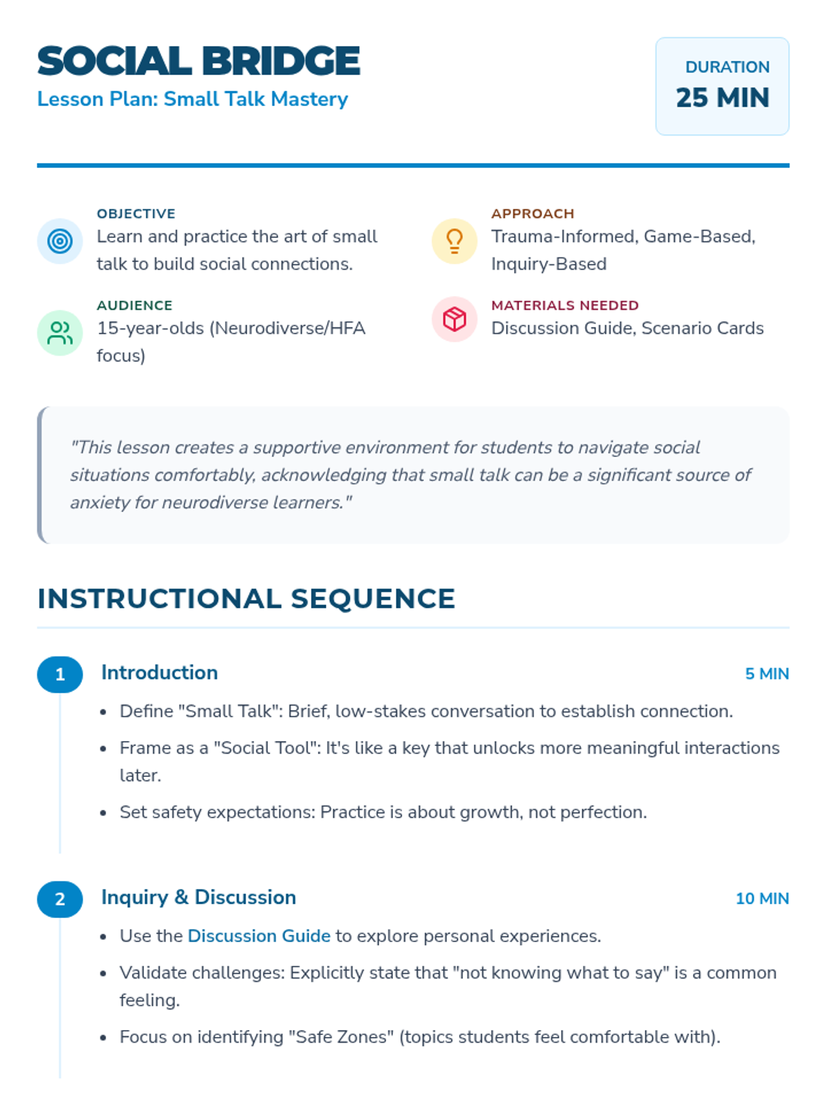 A social skills lesson designed for 15-year-olds with high-functioning autism, focusing on the art of small talk through trauma-informed and game-based strategies.