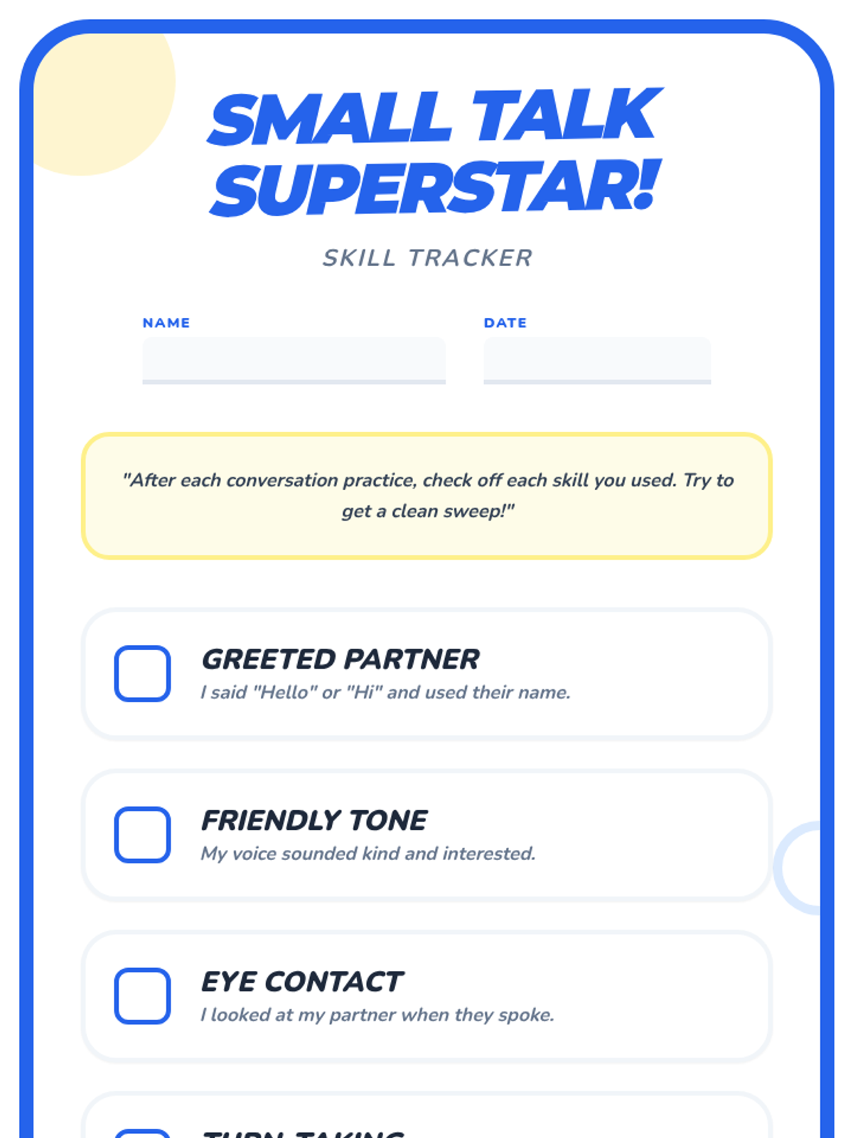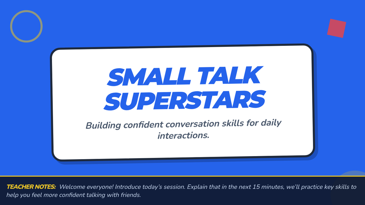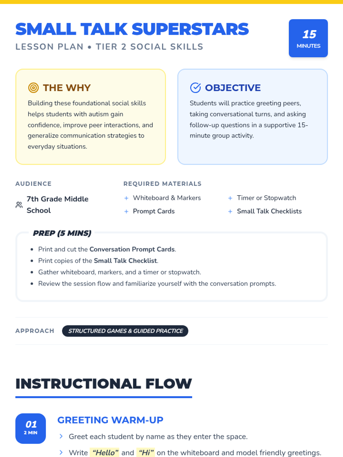 A 15-minute Tier 2 group session for 7th-grade students with autism to practice conversational skills like greetings, turn-taking, and follow-up questions.