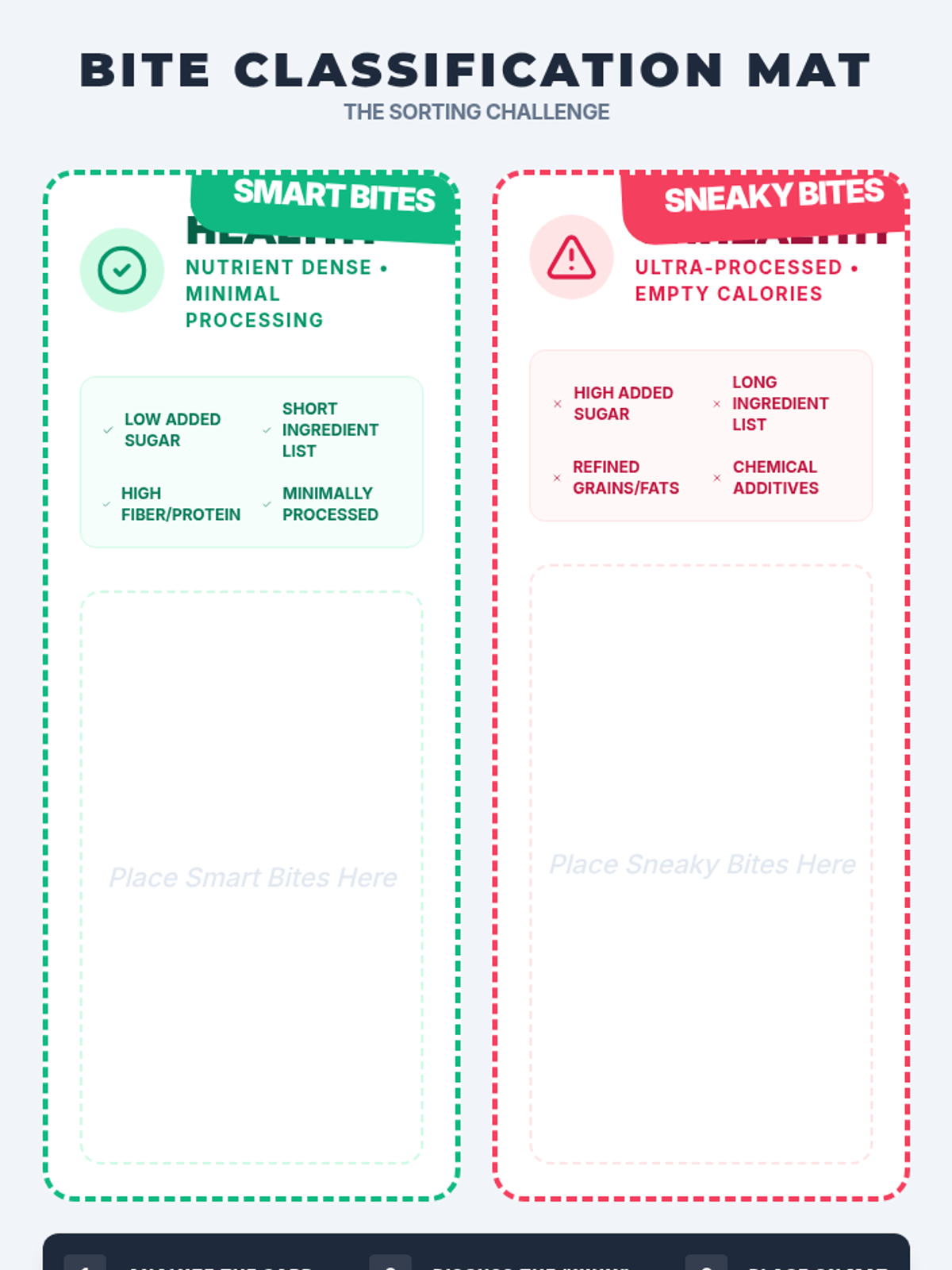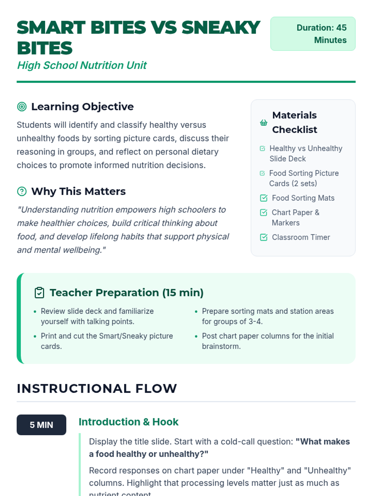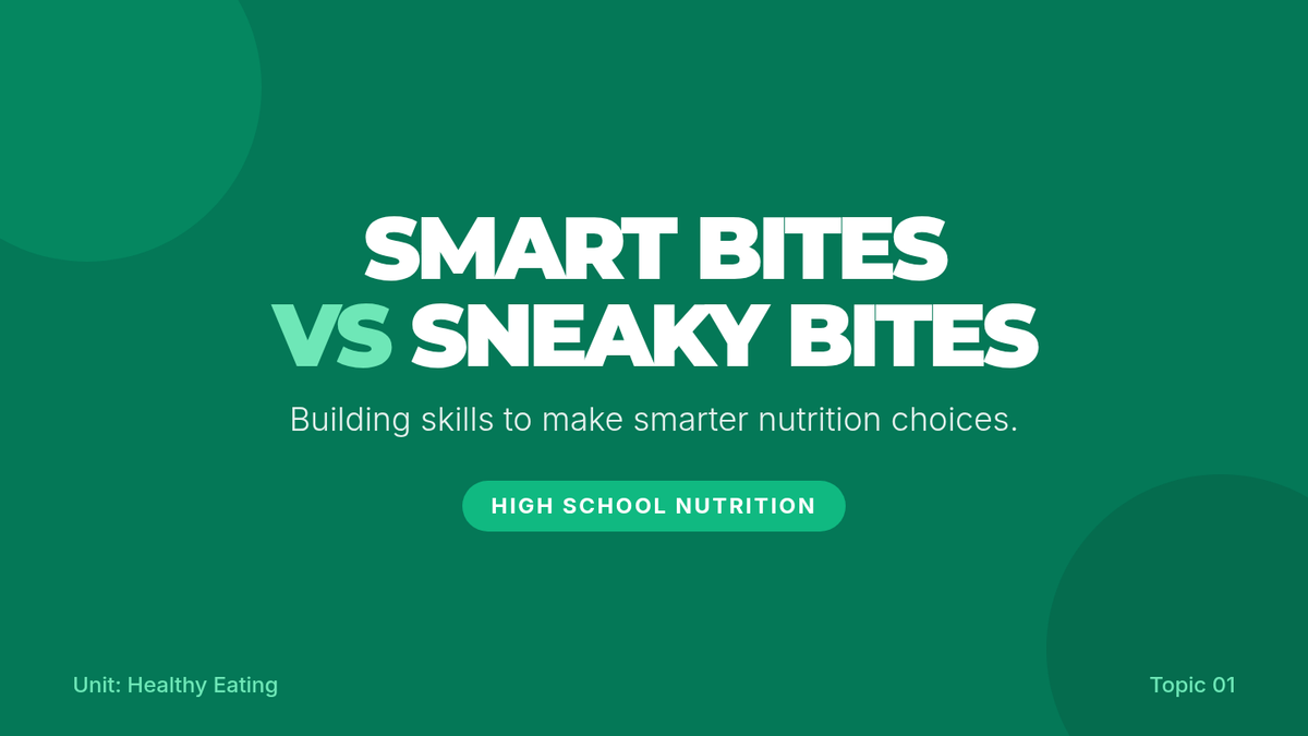 A 45-minute high school nutrition lesson focused on identifying healthy 'Smart Bites' versus unhealthy 'Sneaky Bites' through an interactive sorting activity and group discussion.