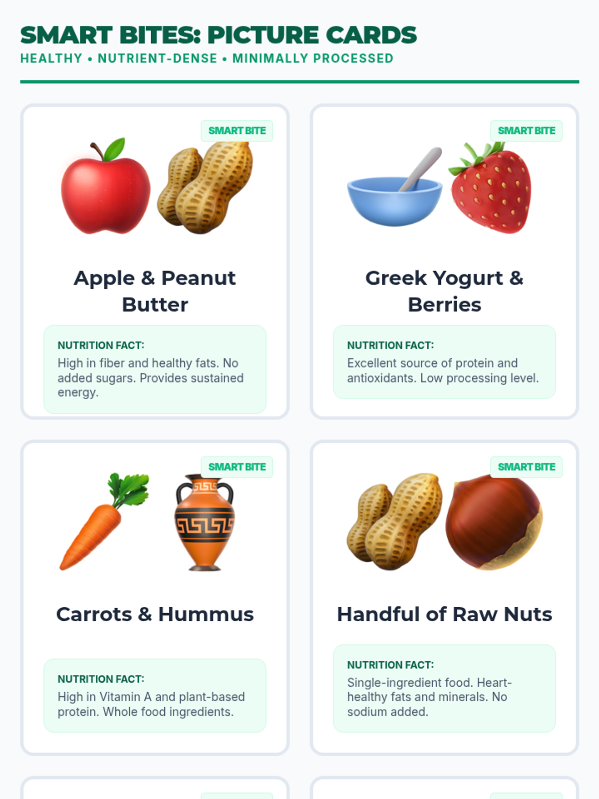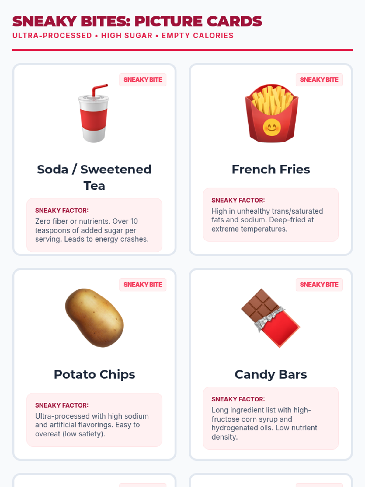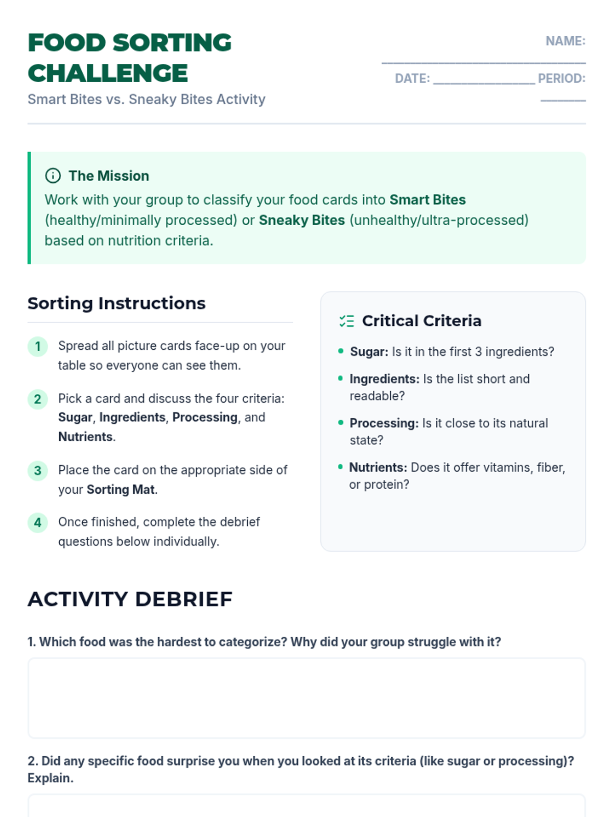 A 45-minute high school nutrition lesson focused on identifying healthy 'Smart Bites' versus unhealthy 'Sneaky Bites' through an interactive sorting activity and group discussion.