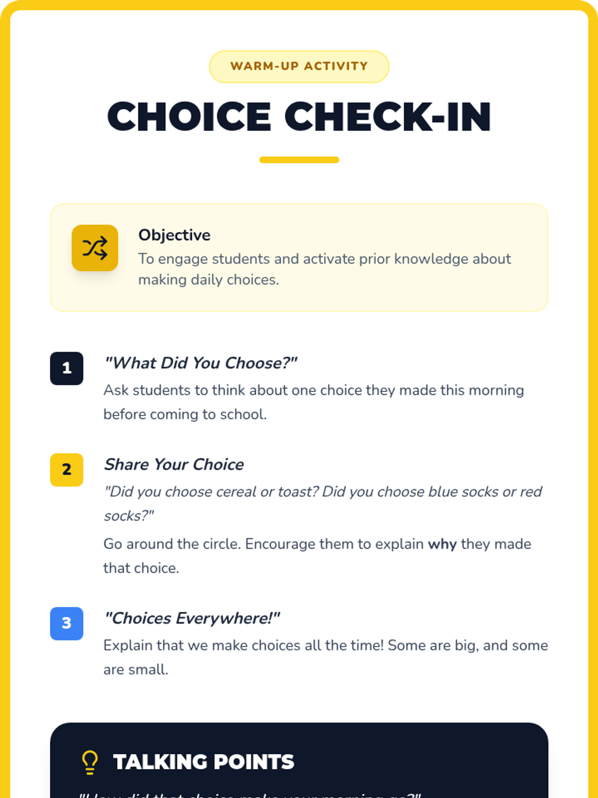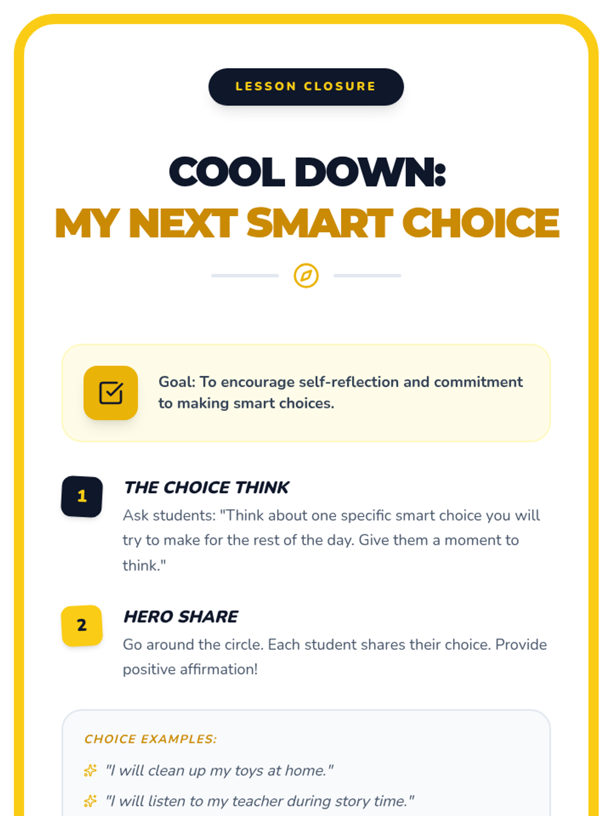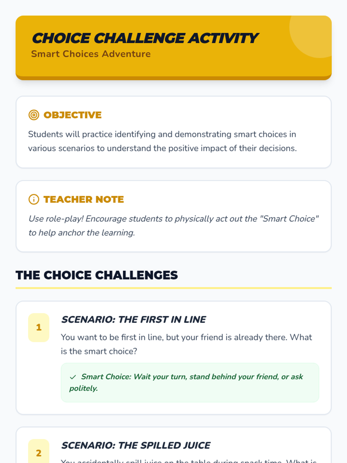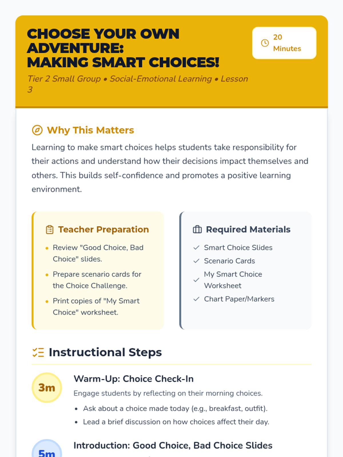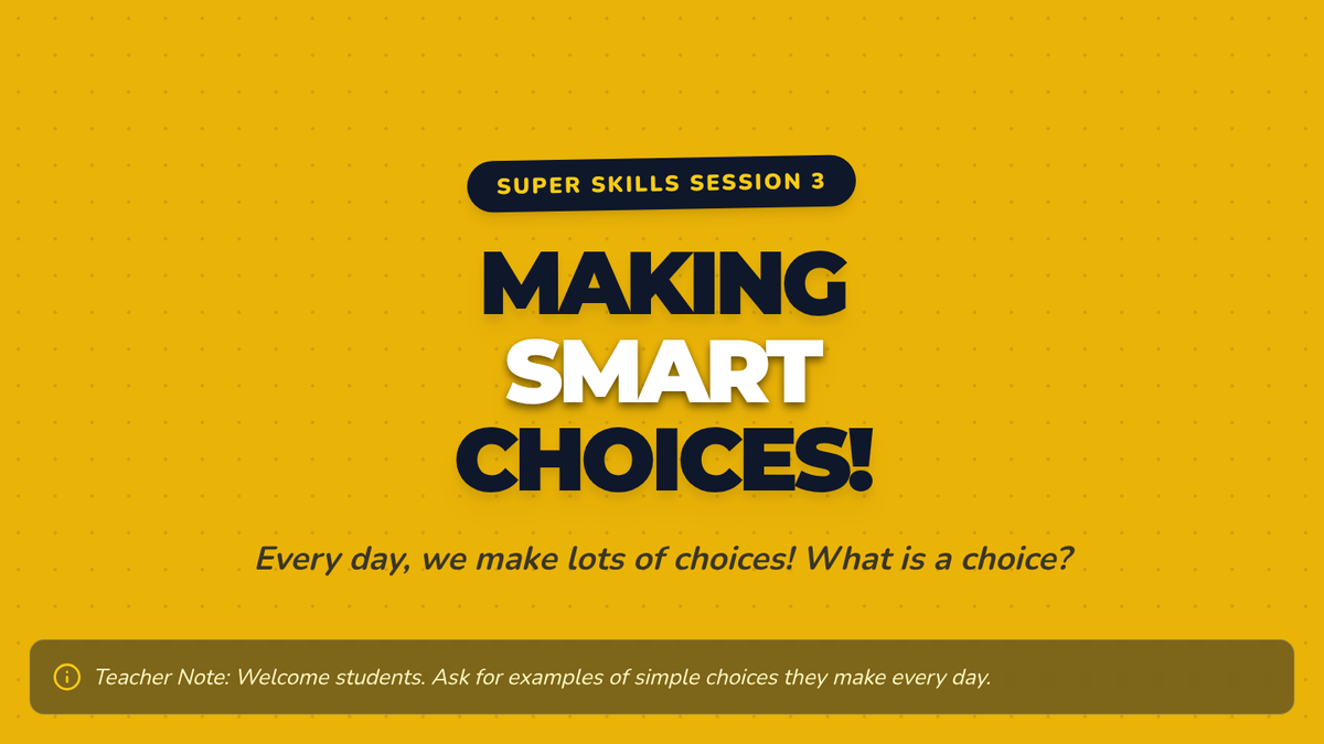 Helps students take responsibility for their actions by understanding how their decisions impact themselves and others through the 'smart choice' framework.