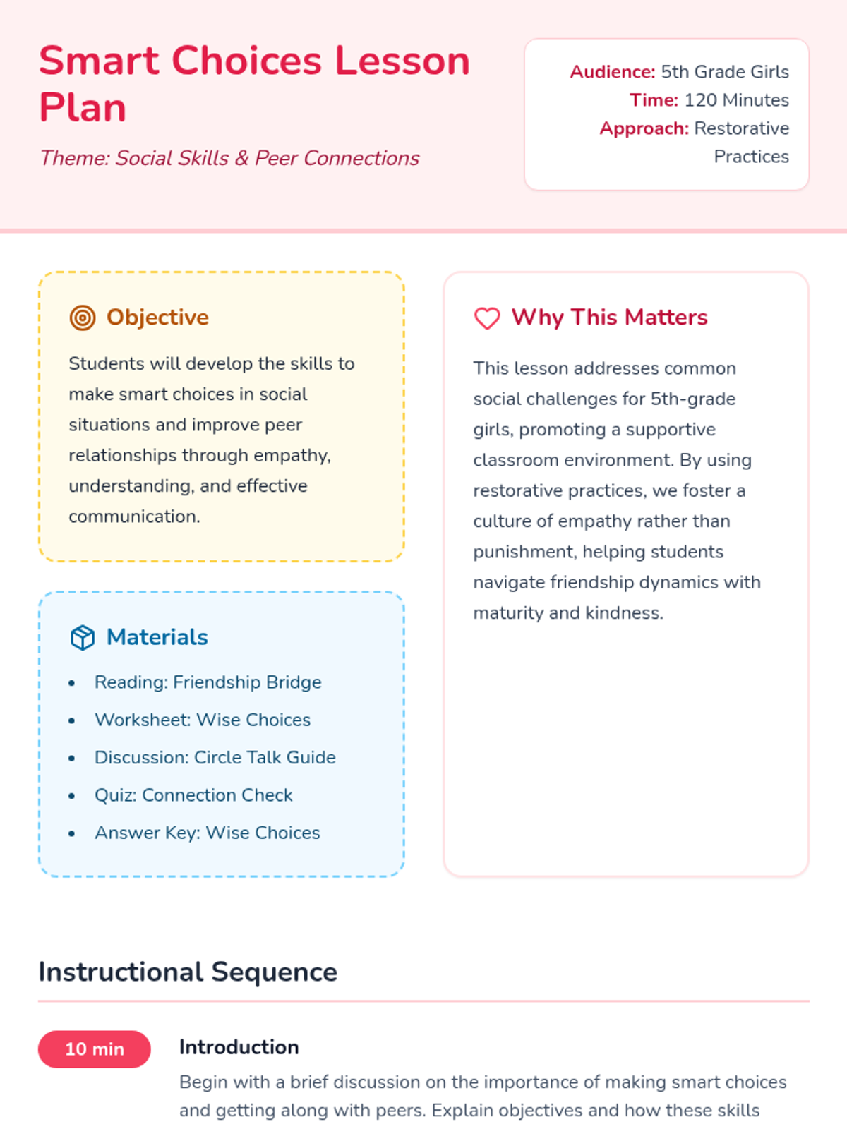 A restorative practices-based lesson for 5th-grade girls focused on making wise social choices, building empathy, and fostering positive peer connections.