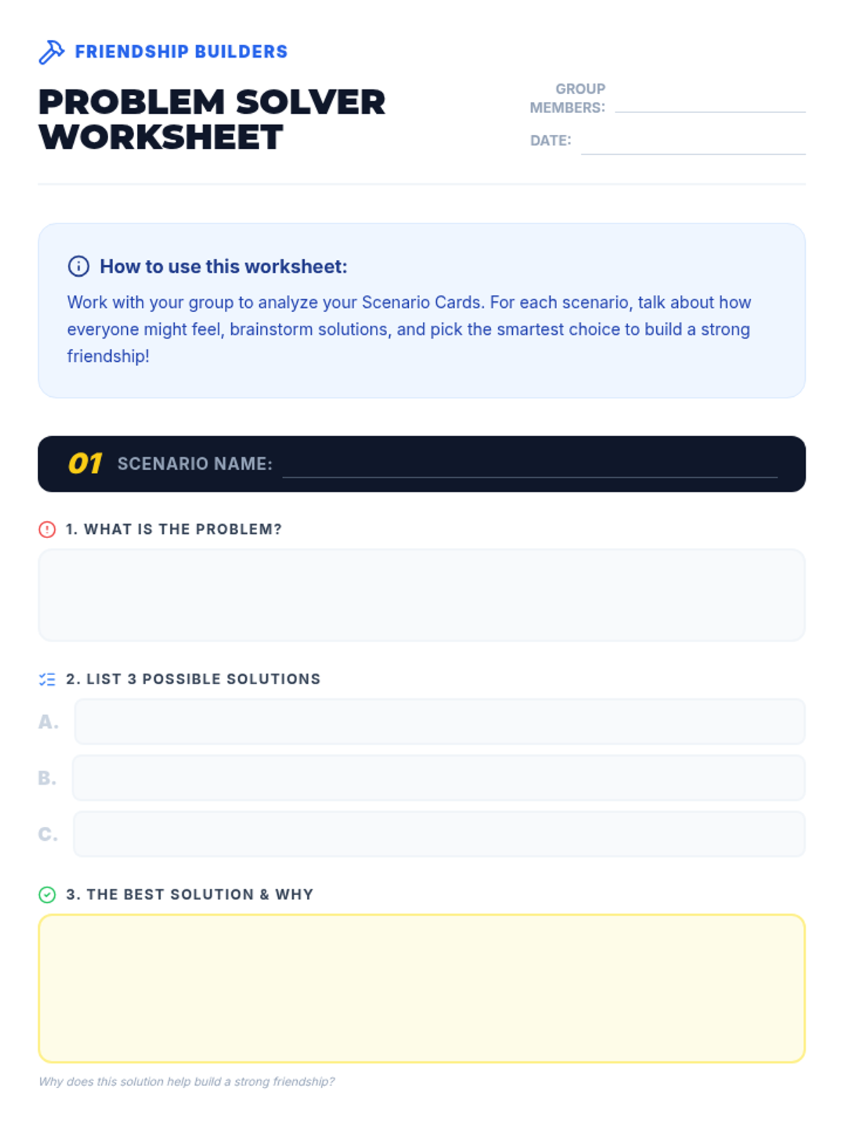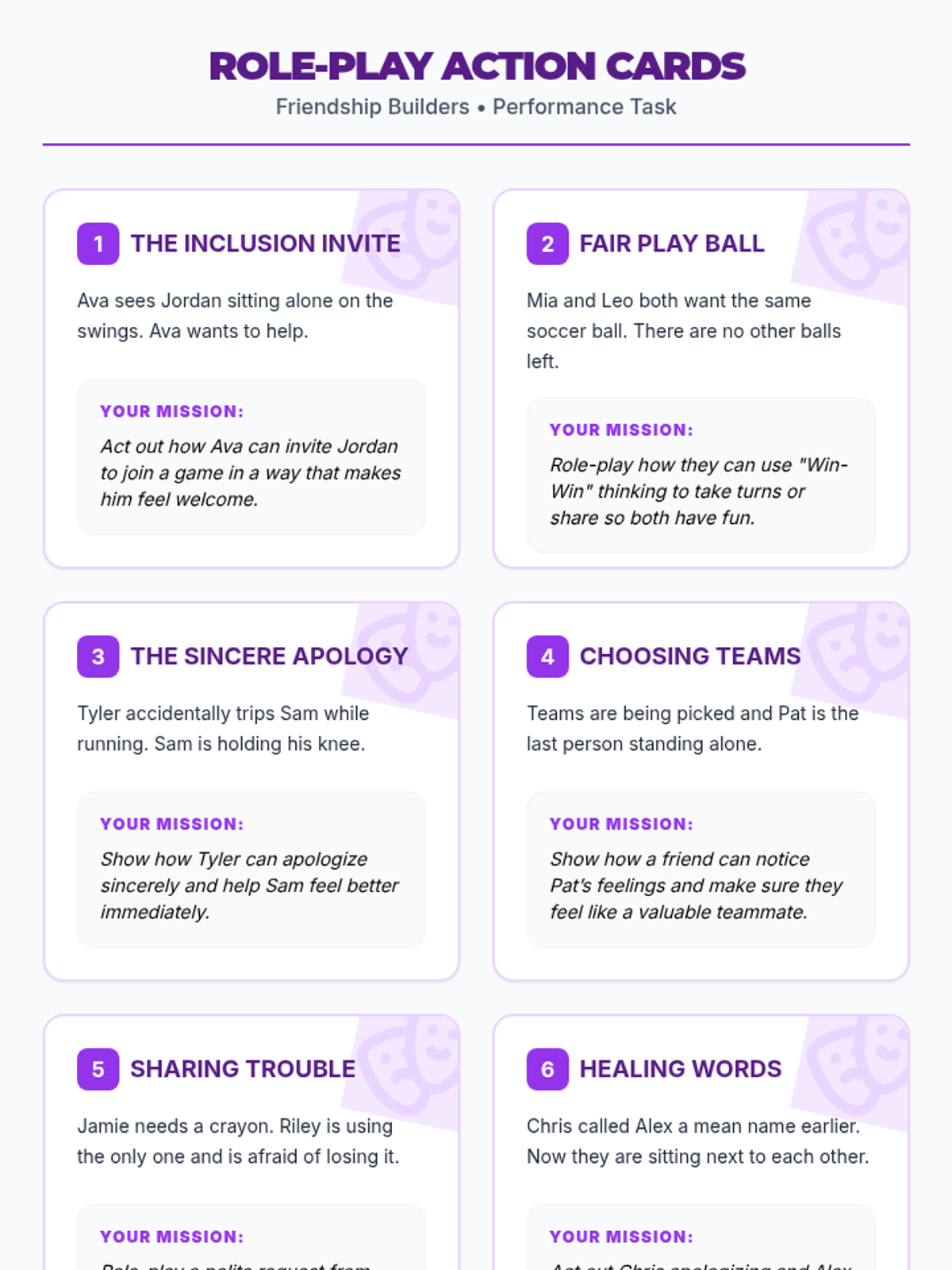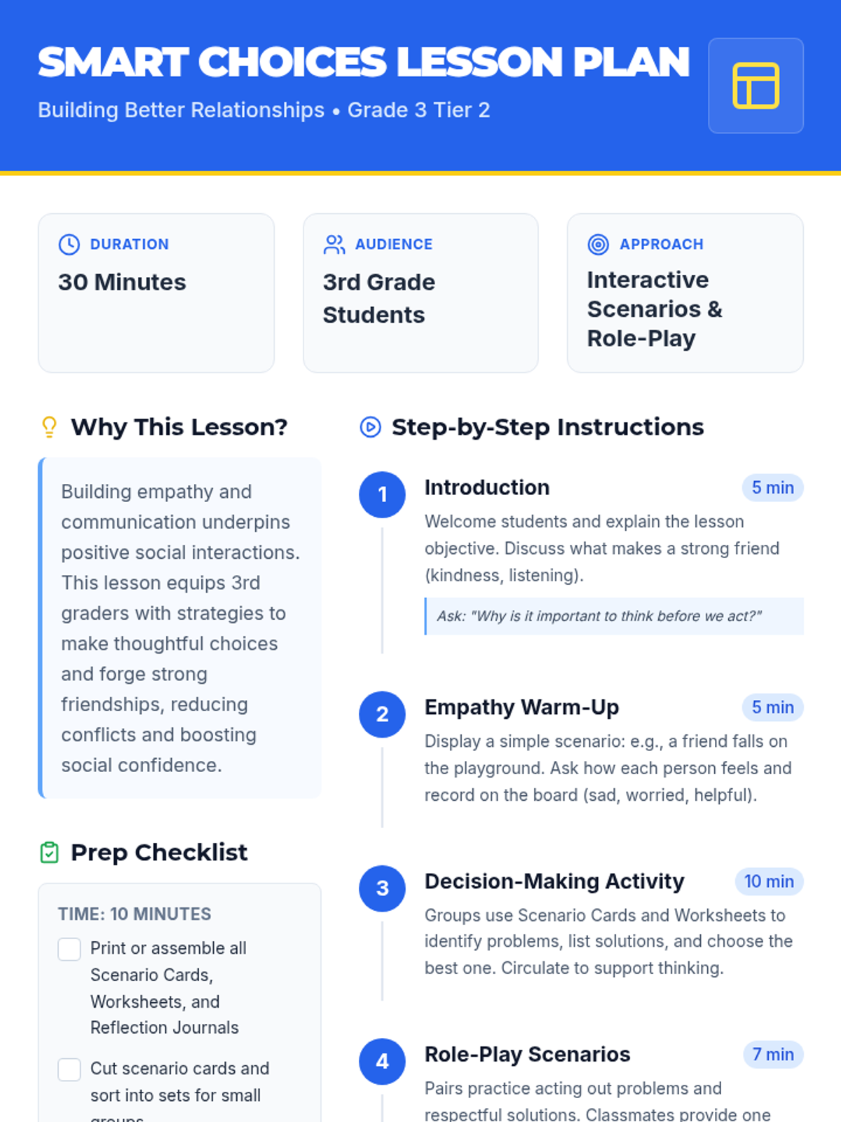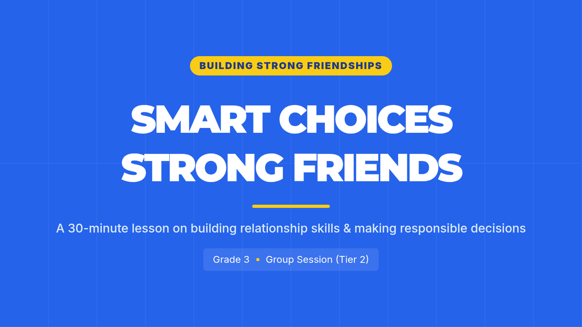 A 30-minute small-group lesson for 3rd graders focused on building empathy, communication, and responsible decision-making through collaborative scenarios and role-play.