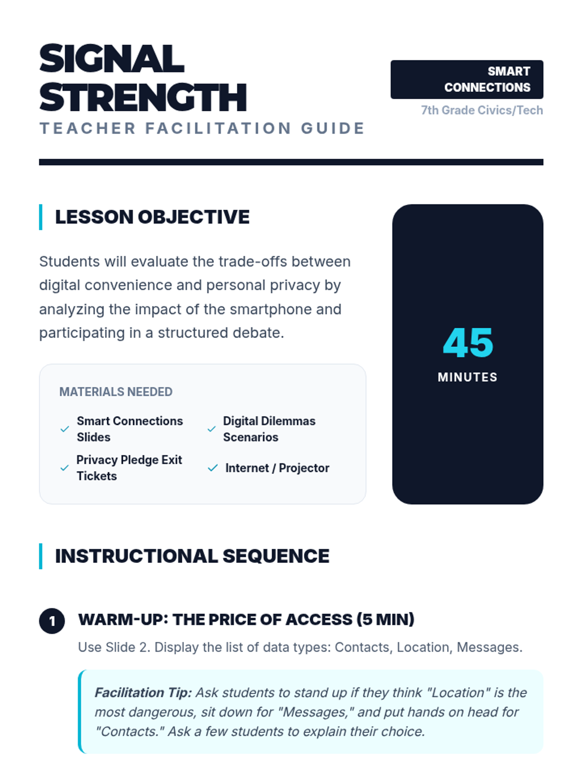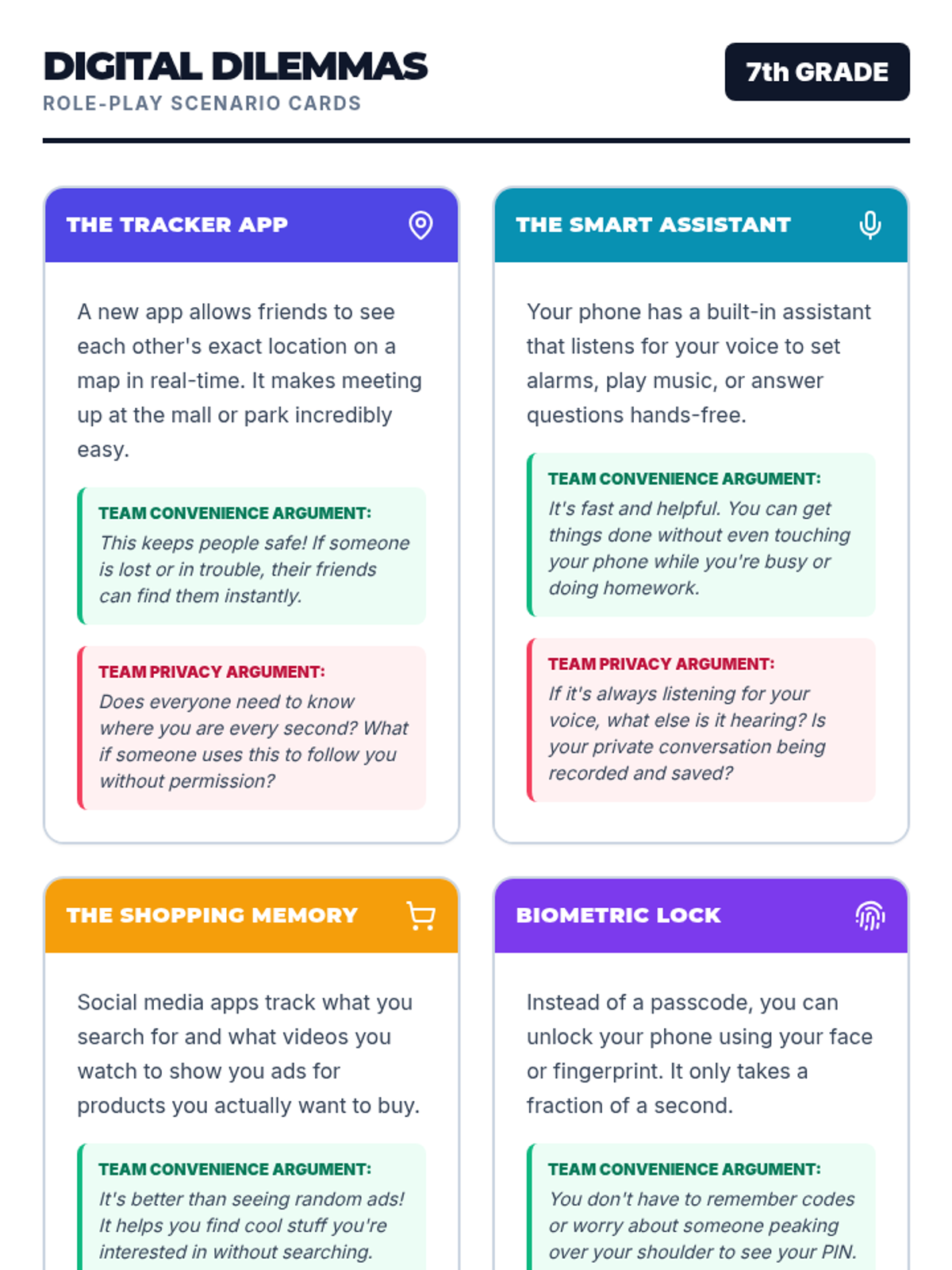 A 7th-grade lesson exploring the trade-offs between digital convenience and personal privacy through a structured debate and video analysis of the smartphone's impact on society.