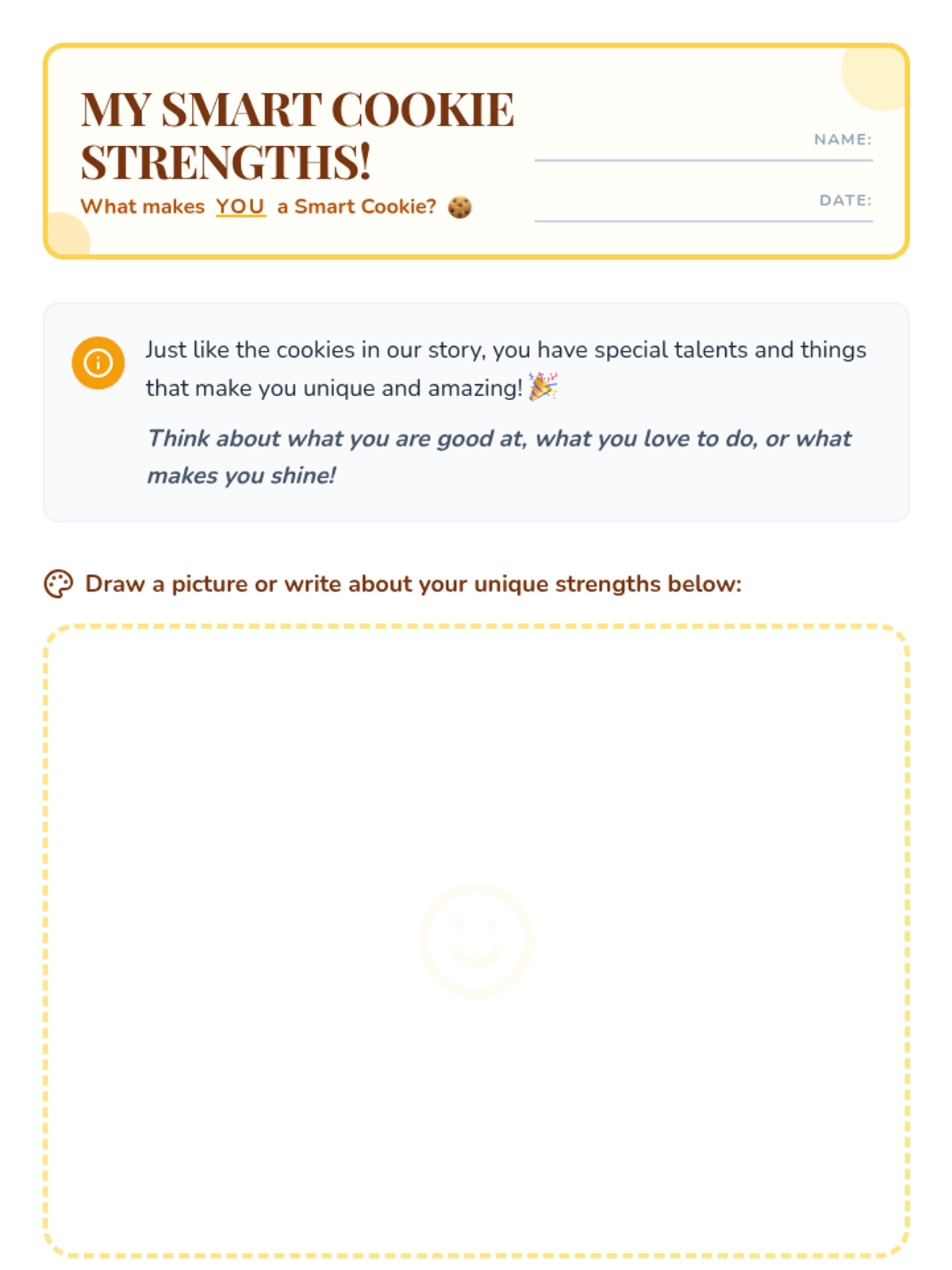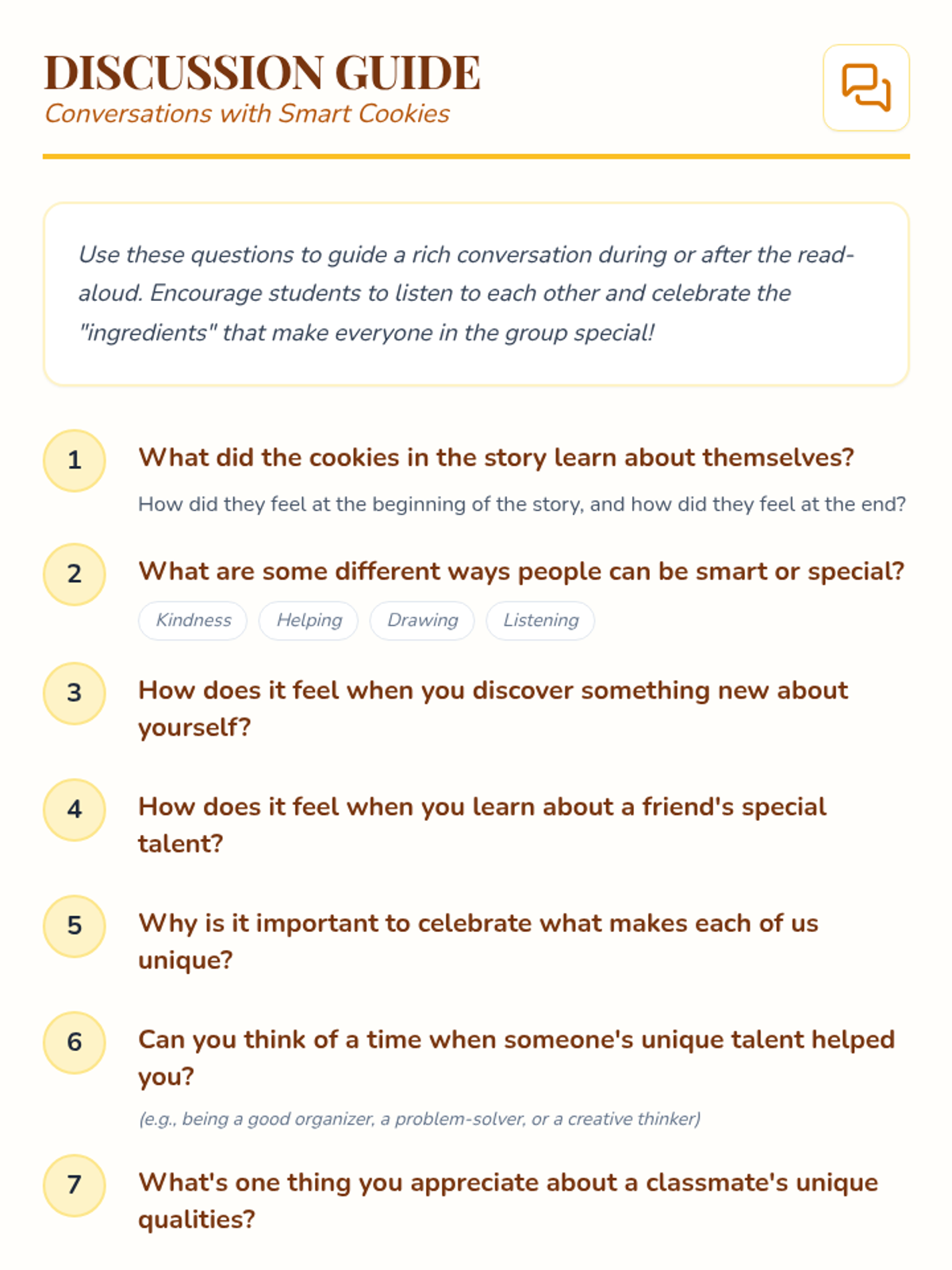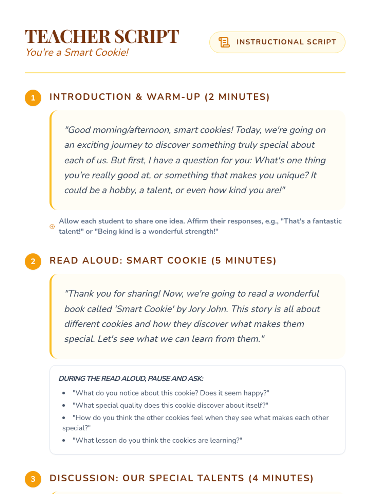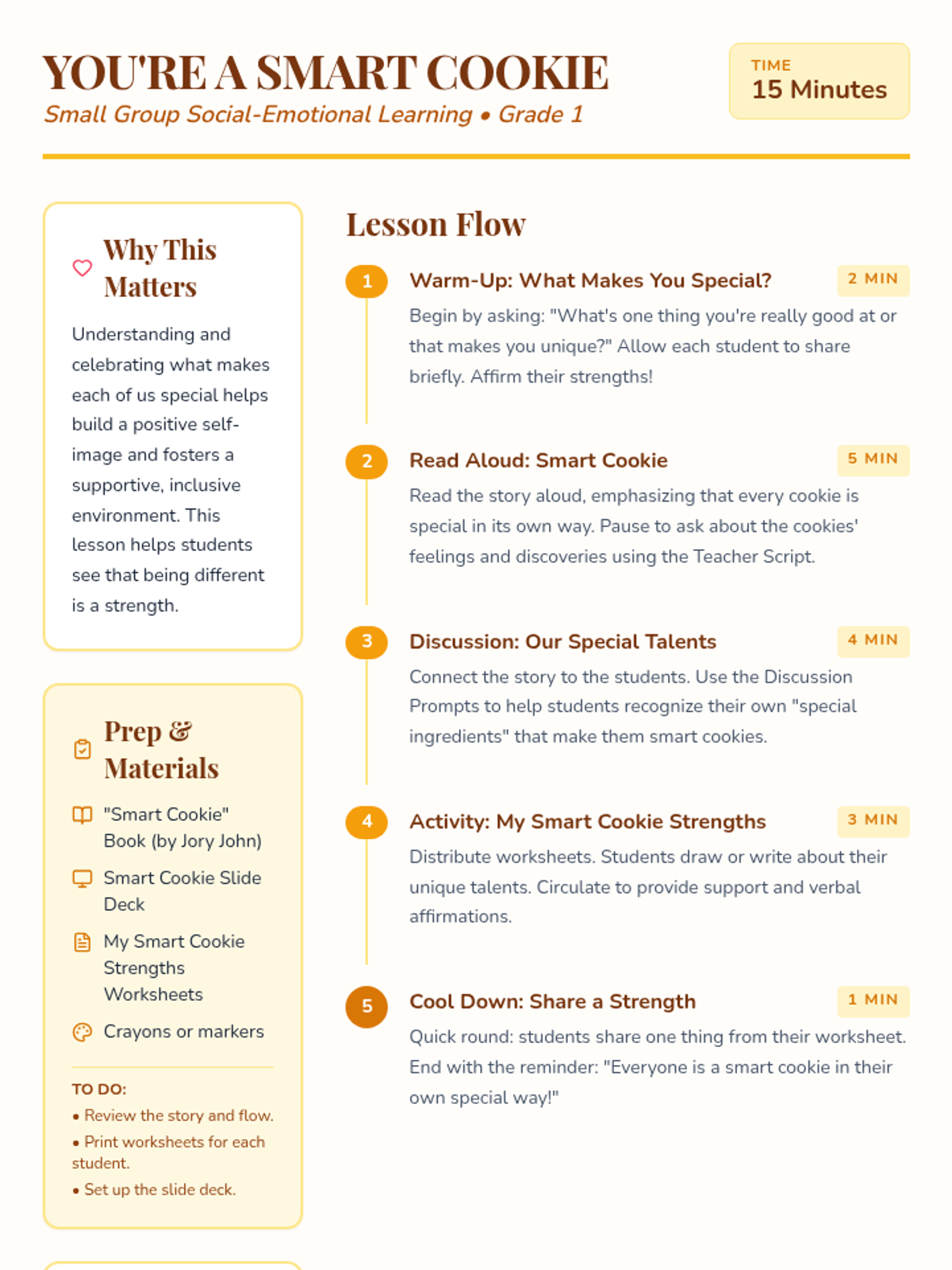 This 15-minute Tier 2 small group lesson for 1st grade uses the book 'Smart Cookie' to help students identify their unique strengths and appreciate diversity. Students engage in a read-aloud, discussion, and a creative drawing activity to celebrate what makes them a 'smart cookie.'
